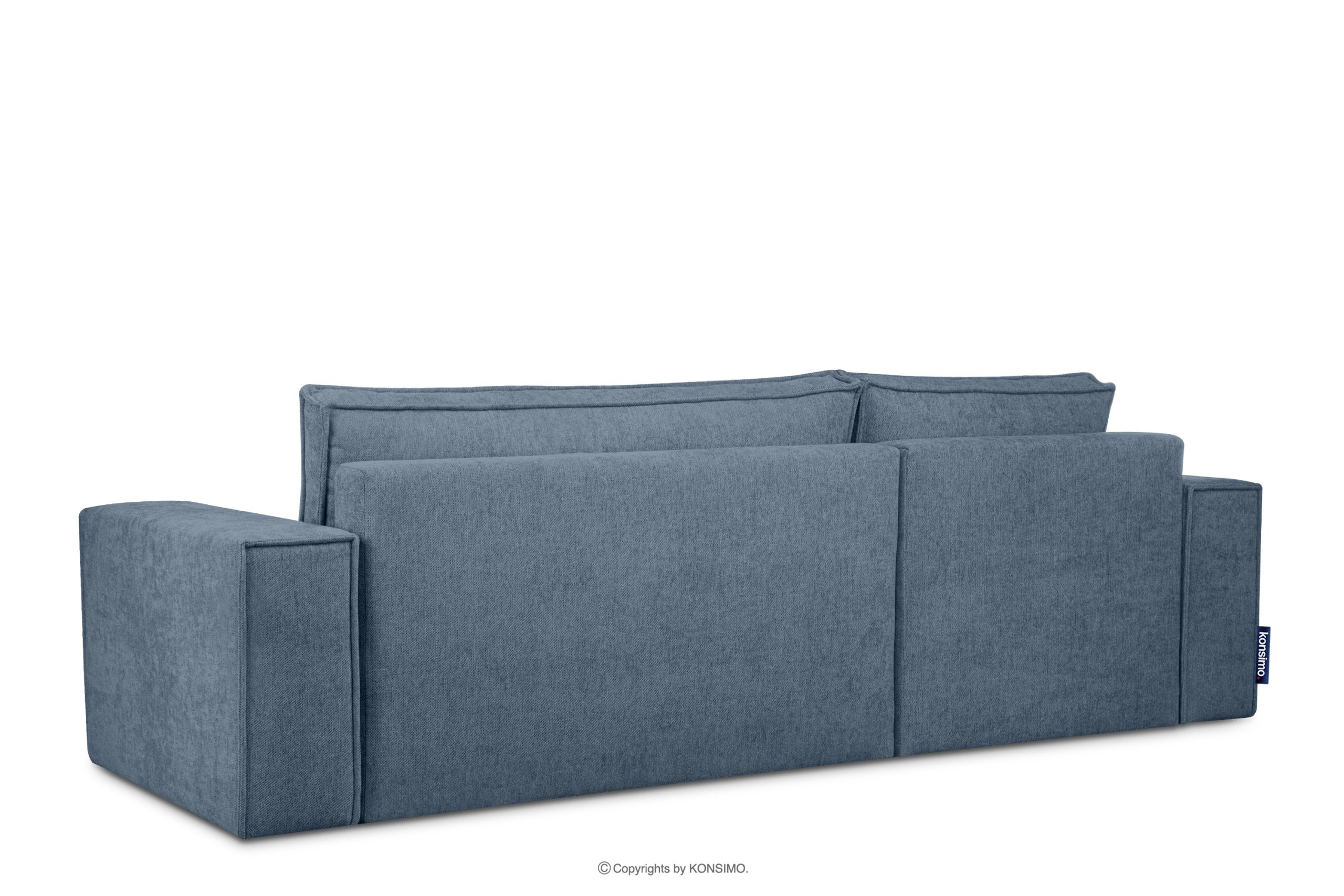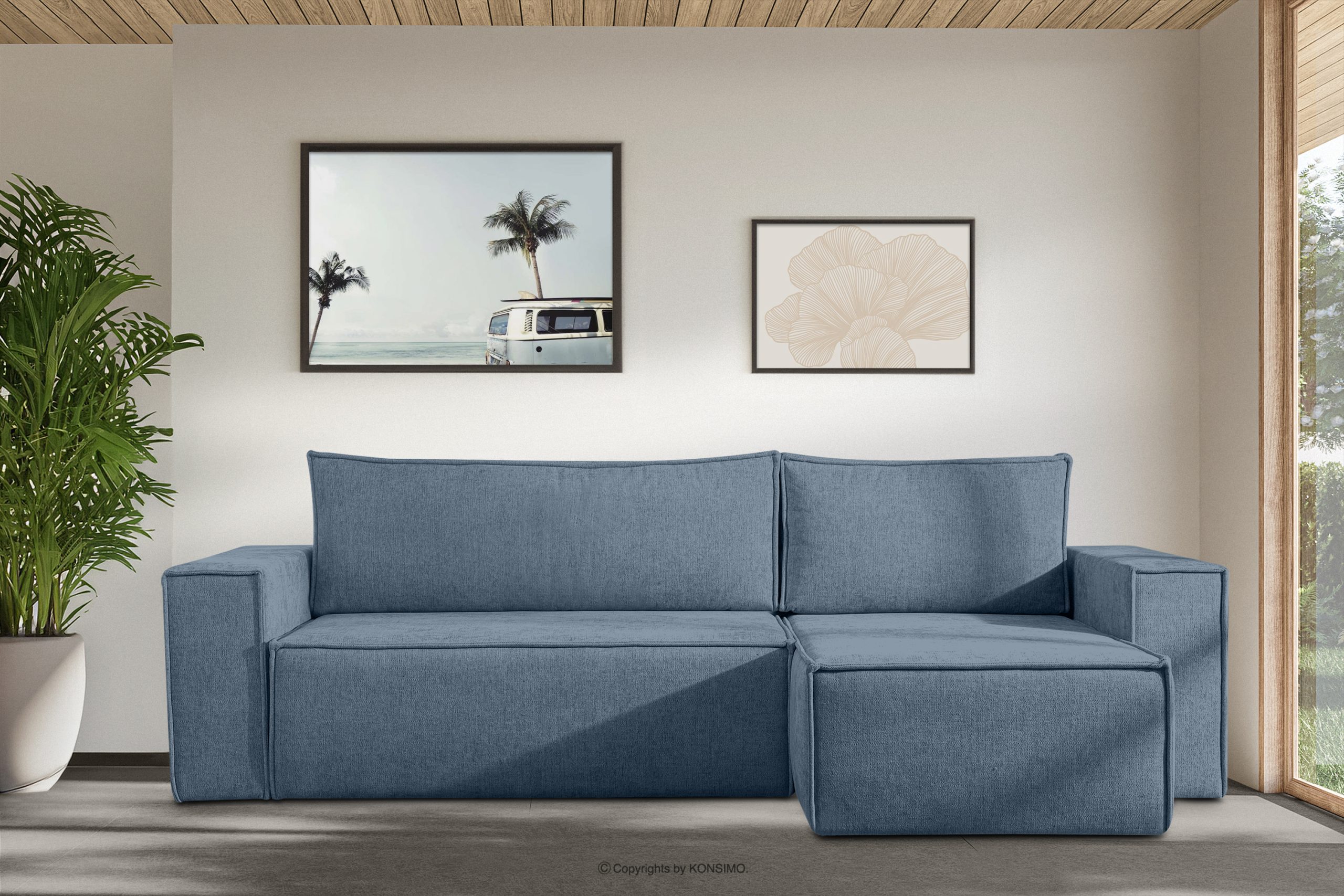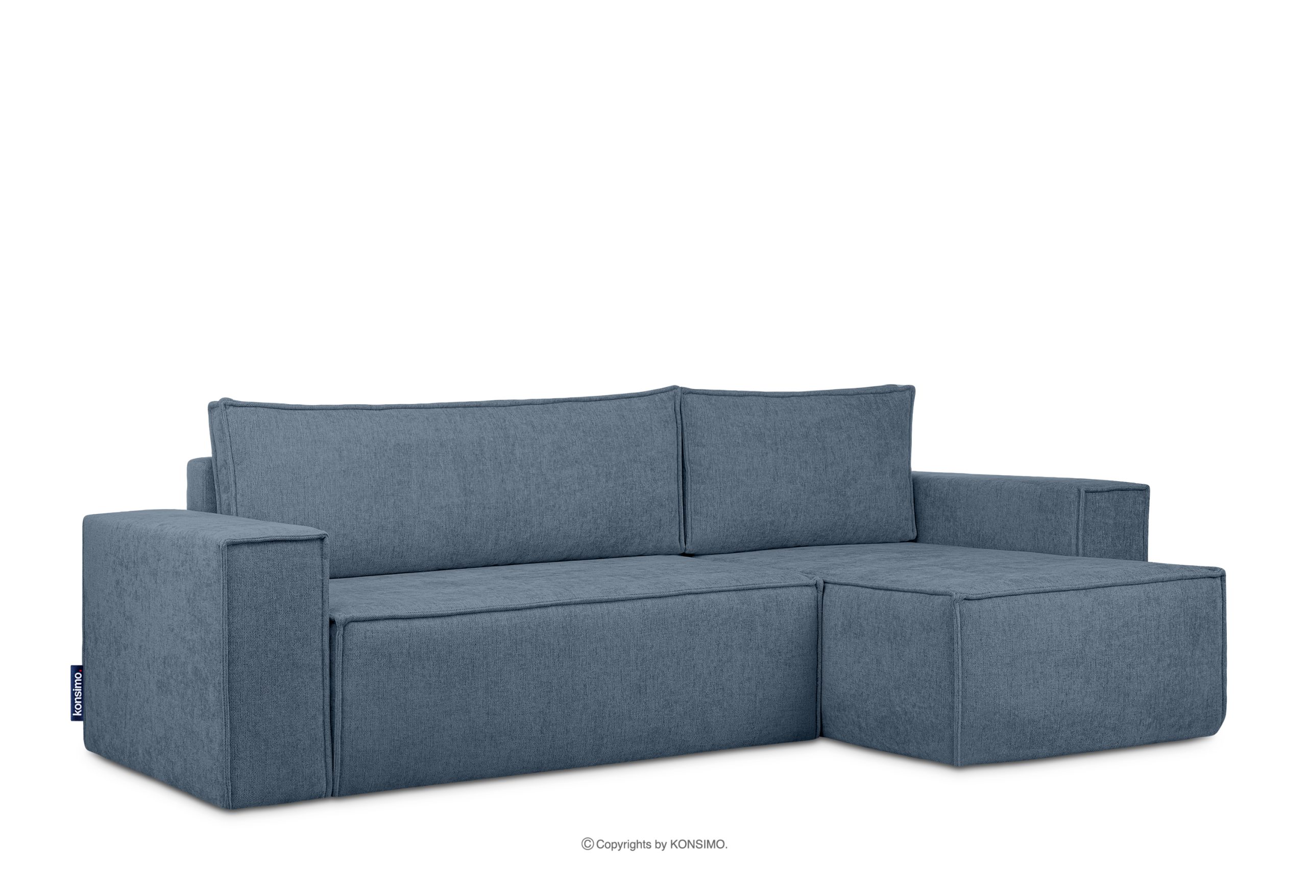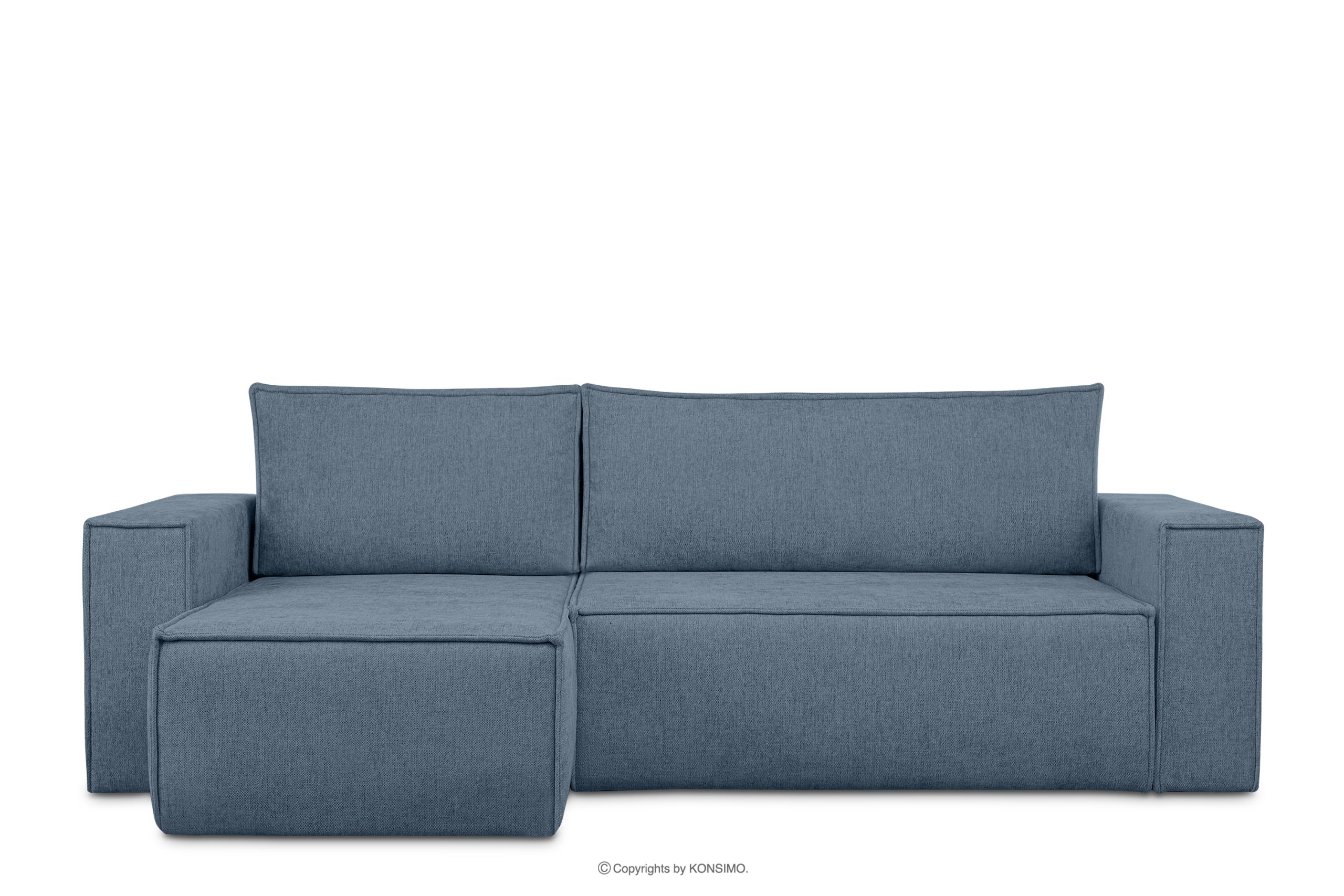Das Ecksofa in geflochtenem Stoff mit Schlaffunktion hellblau links/rechts ist ein Möbelstück im modernistischen Stil. Es hat breite Seiten vom Typ HAWAI, wodurch es sich besser für größere Räume eignet. Es handelt sich um ein universelles Ecksofa, d.h. Sie können die Seite, auf der das Sofa stehen soll, selbst bestimmen. Sie können die Seite auch nach einiger Zeit selbst wechseln.