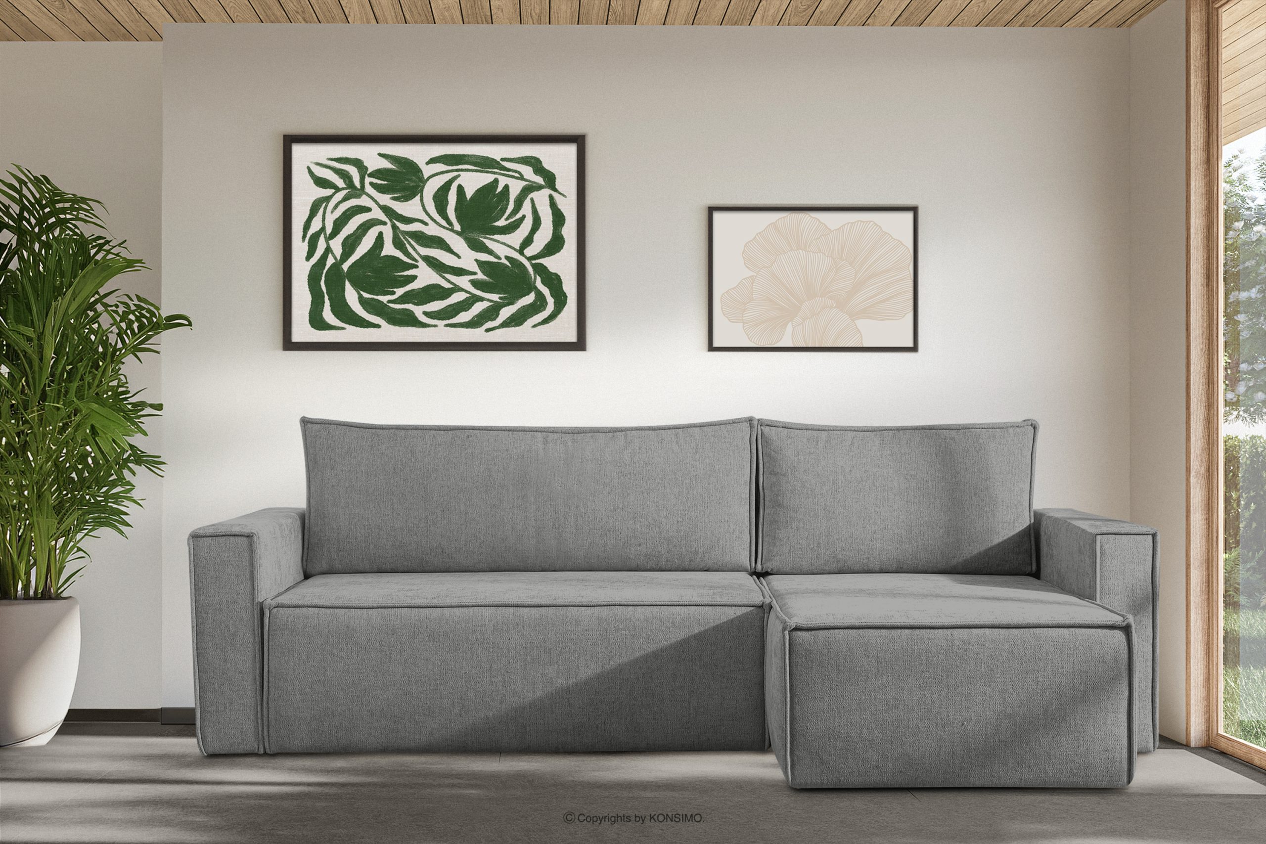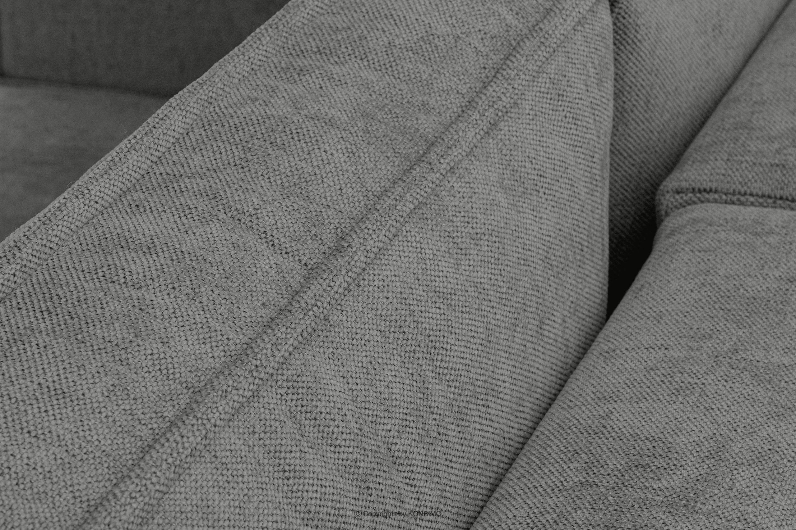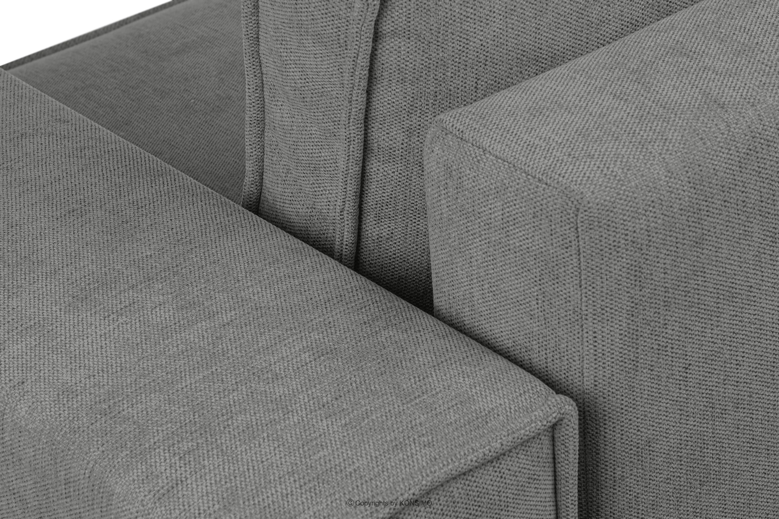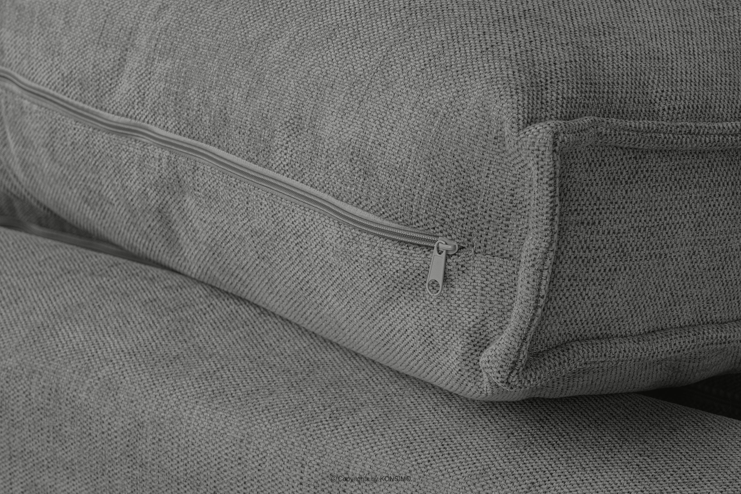 Das Ecksofa mit Schlaffunktion in grauem Flechtstoff links/rechts ist ein Möbelstück im modernistischen Stil. Es hat breite Seiten vom Typ HAWAI, wodurch es sich besser für größere Räume eignet. Es ist ein universelles Ecksofa, d.h. es hat die zusätzliche Eigenschaft, dass man selbst wählen kann, welche Seite als Liegefläche verwendet werden soll.