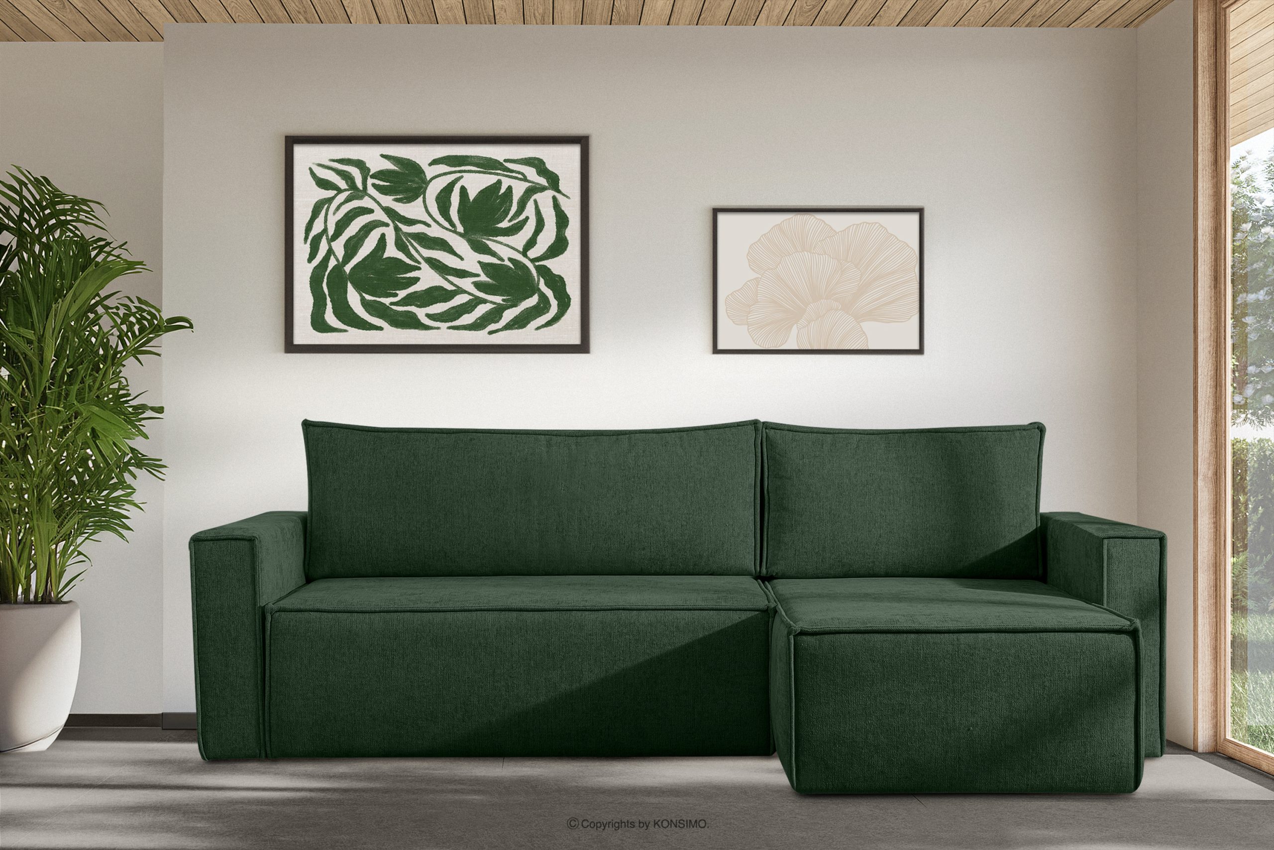 Das Ecksofa mit Schlaffunktion in Flechtstoff grün links/rechts ist ein Möbelstück im modernistischen Stil. Es hat breite Seiten vom Typ HAWAI, wodurch es sich besser für größere Räume eignet. Es ist ein universelles Ecksofa, d.h. es hat eine zusätzliche Funktion, nämlich dass Sie selbst wählen können, auf welcher Seite Sie das Sofa haben möchten.