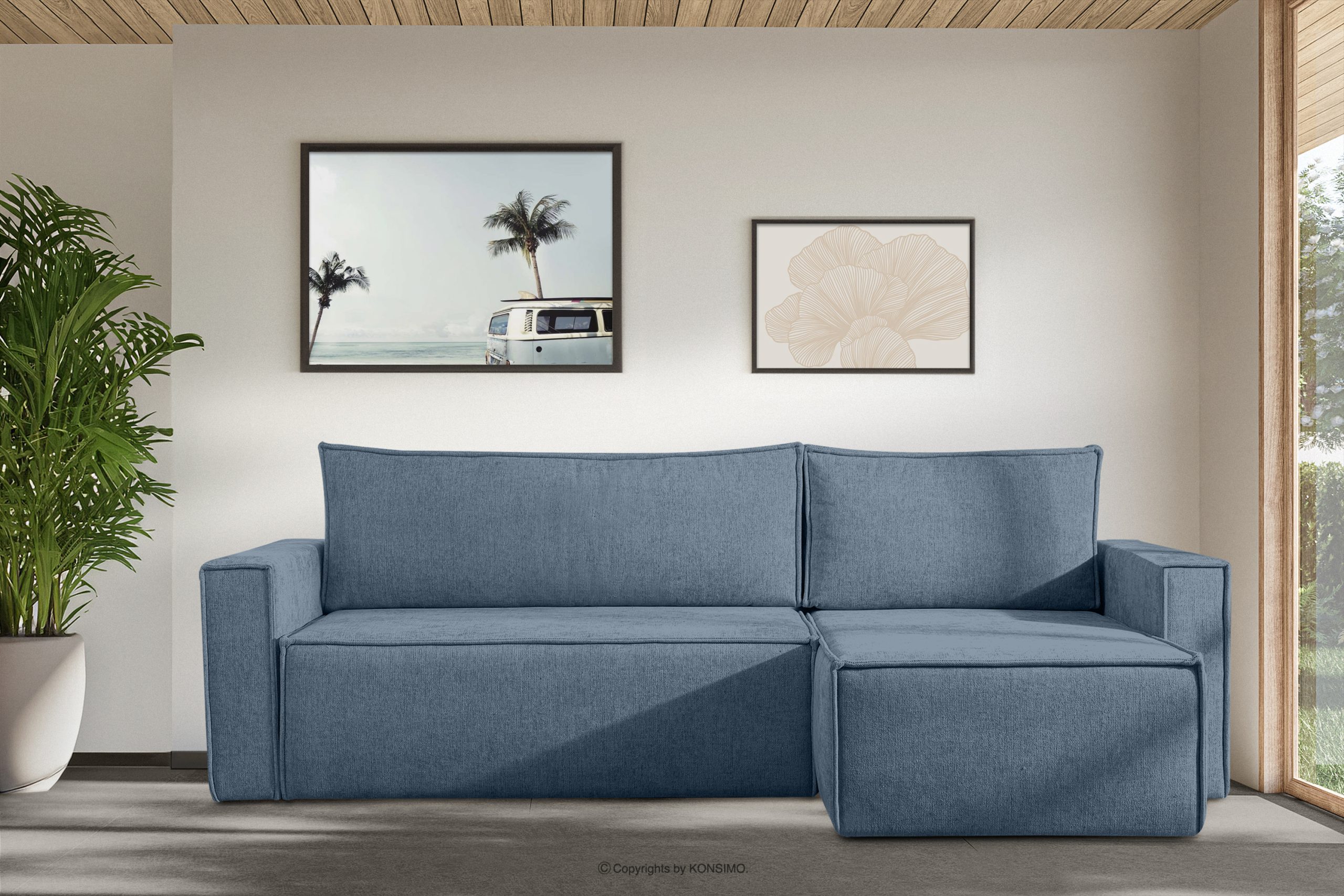 Das Ecksofa mit Schlaffunktion in Flechtstoff hellblau links/rechts ist ein Möbelstück im modernistischen Stil. Es hat breite Seiten vom Typ HAWAI, wodurch es sich besser für größere Räume eignet. Es handelt sich um ein universelles Ecksofa, d.h. Sie können die Seite, auf der Sie die Liege haben möchten, selbst bestimmen. Sie können die Seite auch nach einer Weile selbst wechseln.