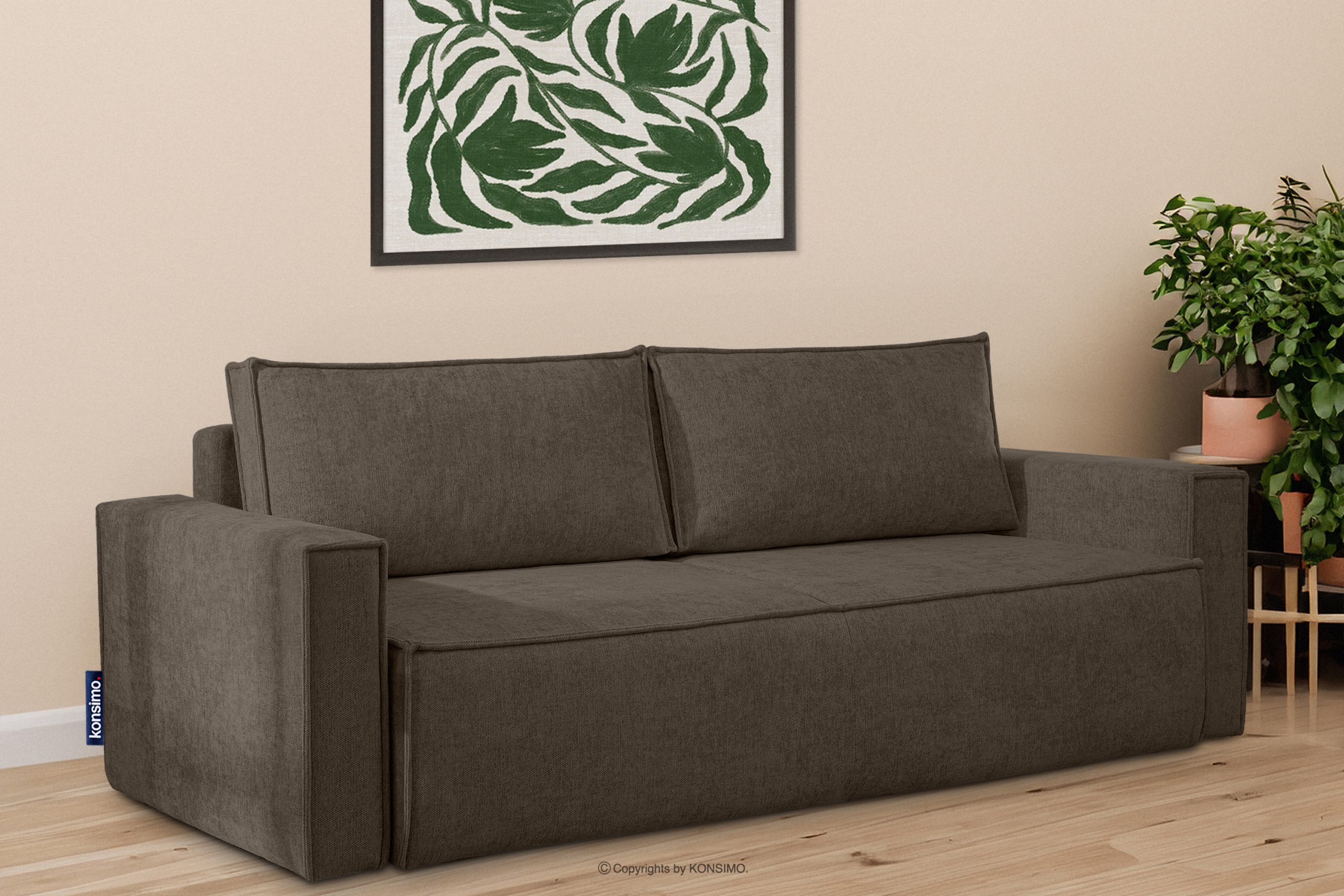 Sofa 3 mit Schlaffunktion aus kariertem Stoff in kühlem Braun ist ein Möbelstück im modernistischen Stil in Grau. Es hat schmale französische HAWAII-Seiten, wodurch es sich besser für kleinere Räume eignet. Die Polsterung ist ein angenehm zu berührender Webstoff, der leicht zu reinigen ist und lange Zeit sein Aussehen behält. Das Sofa wird mit zwei extra großen Kissen geliefert, die auf Wunsch abgenommen werden können.