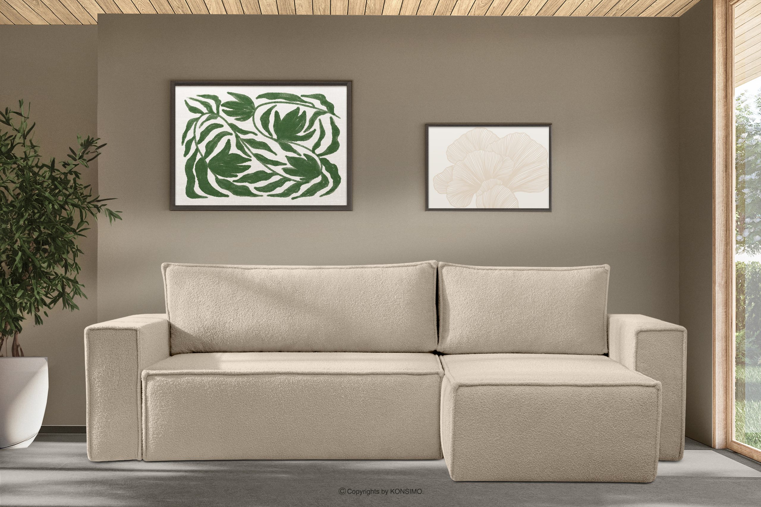 Das Boucle-Ecksofa mit Schlaffunktion links/rechts hellbeige ist ein Möbelstück im modernistischen Stil. Es hat breite Seiten vom Typ HAWAI, wodurch es sich besser für größere Räume eignet. Es ist ein universelles Ecksofa, d.h. es hat die zusätzliche Eigenschaft, dass Sie die Seite, auf der Sie das Sofa haben möchten, selbst wählen können.