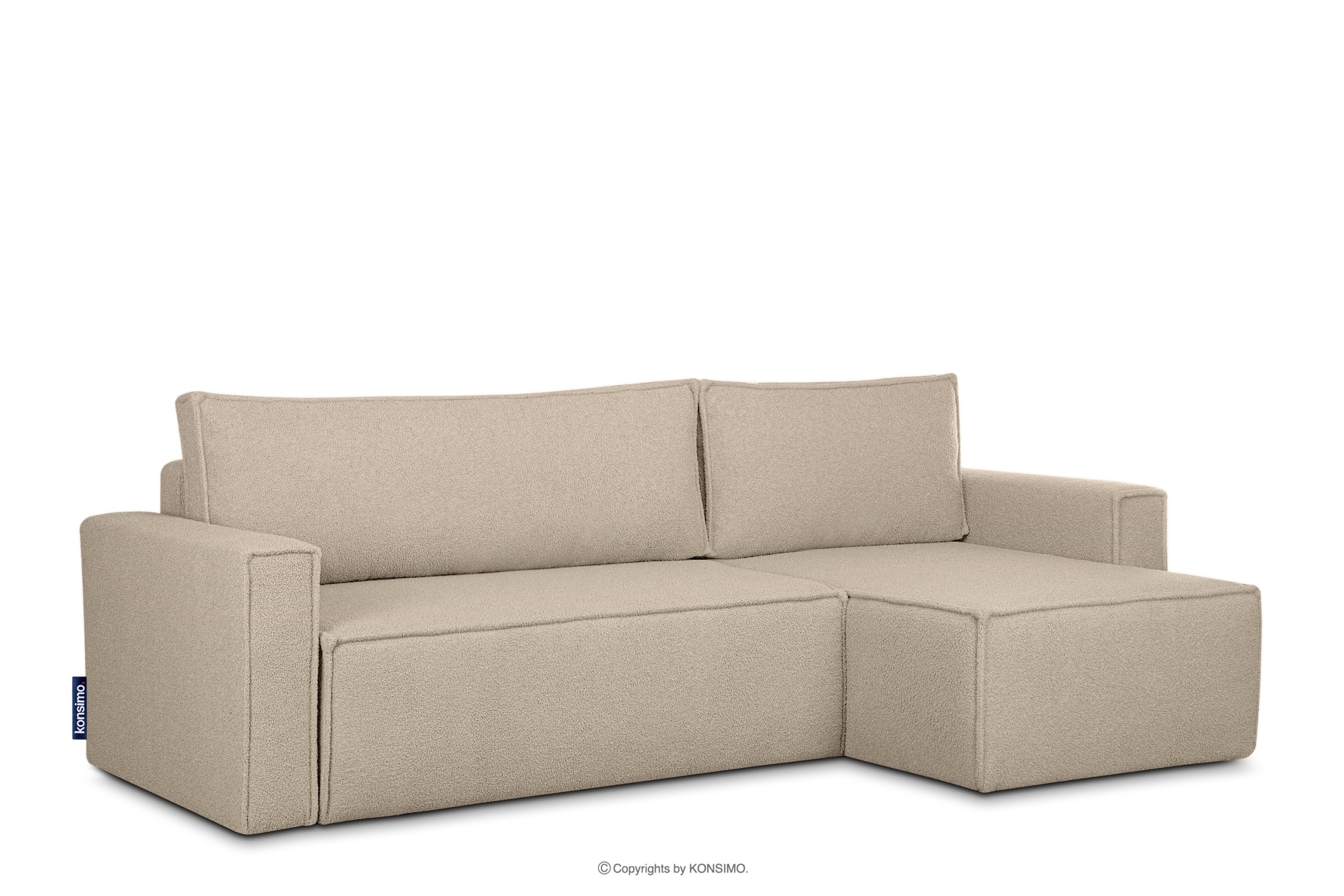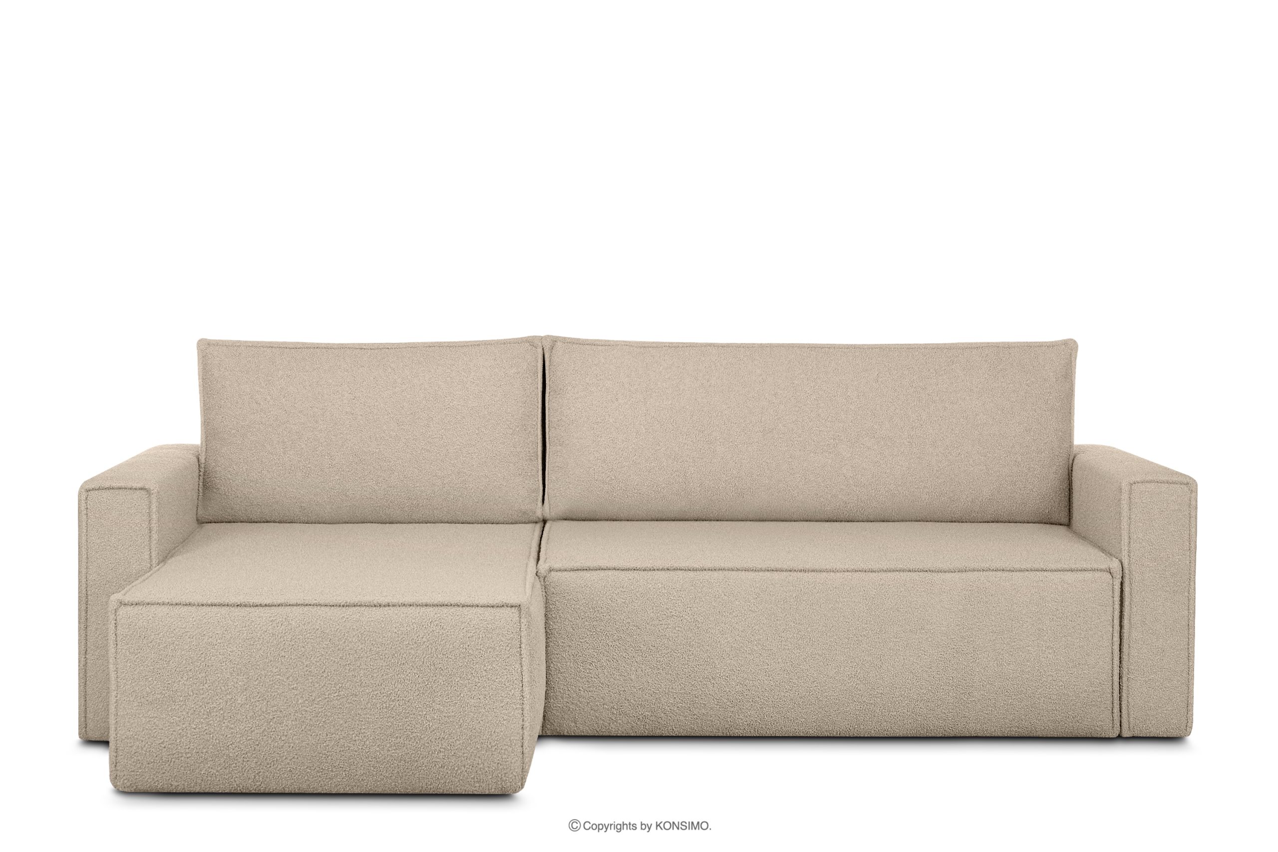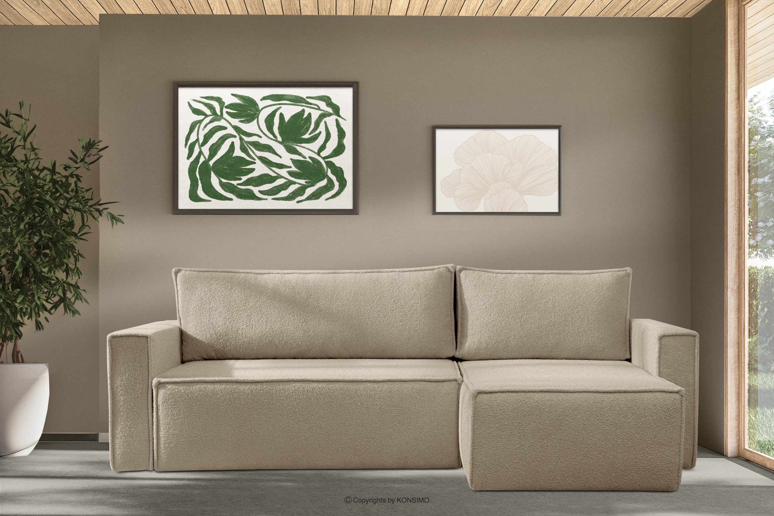 Das Boucle-Ecksofa mit Schlaffunktion hellbeige links/rechts ist ein Möbelstück im modernistischen Stil. Es hat breite Seiten vom Typ HAWAI, wodurch es sich besser für größere Räume eignet. Es ist ein universelles Ecksofa, d.h. es hat die zusätzliche Eigenschaft, dass Sie die Seite, auf der Sie das Sofa haben möchten, selbst wählen können.