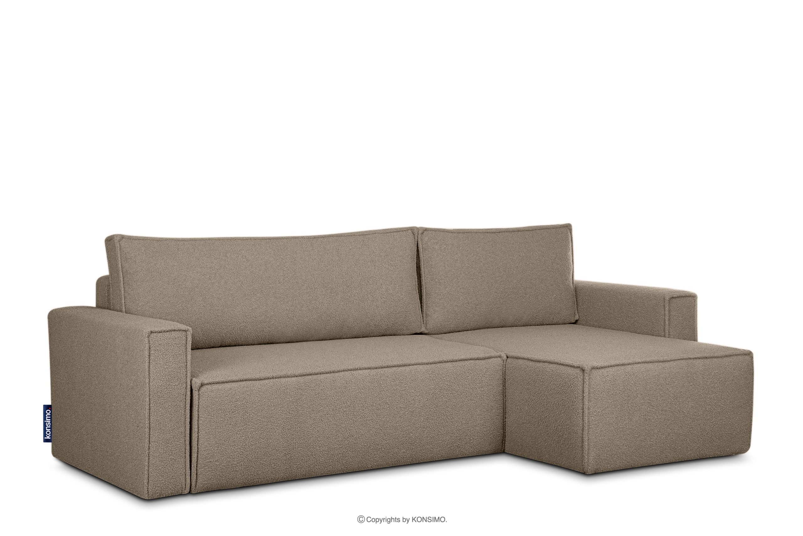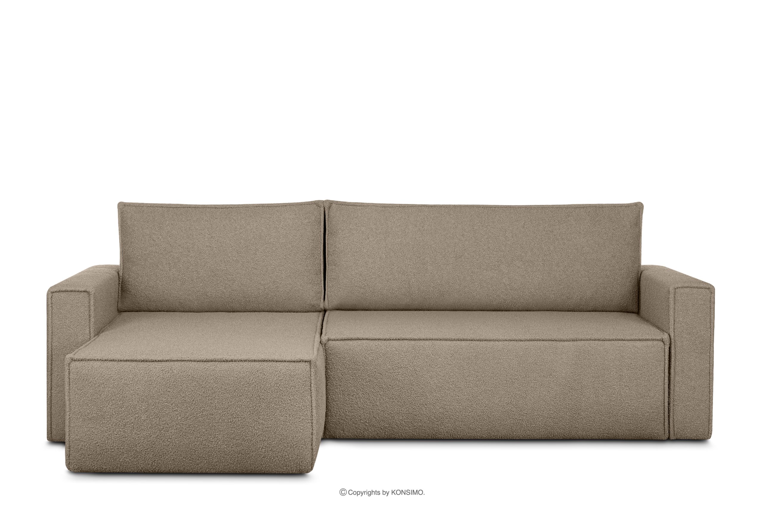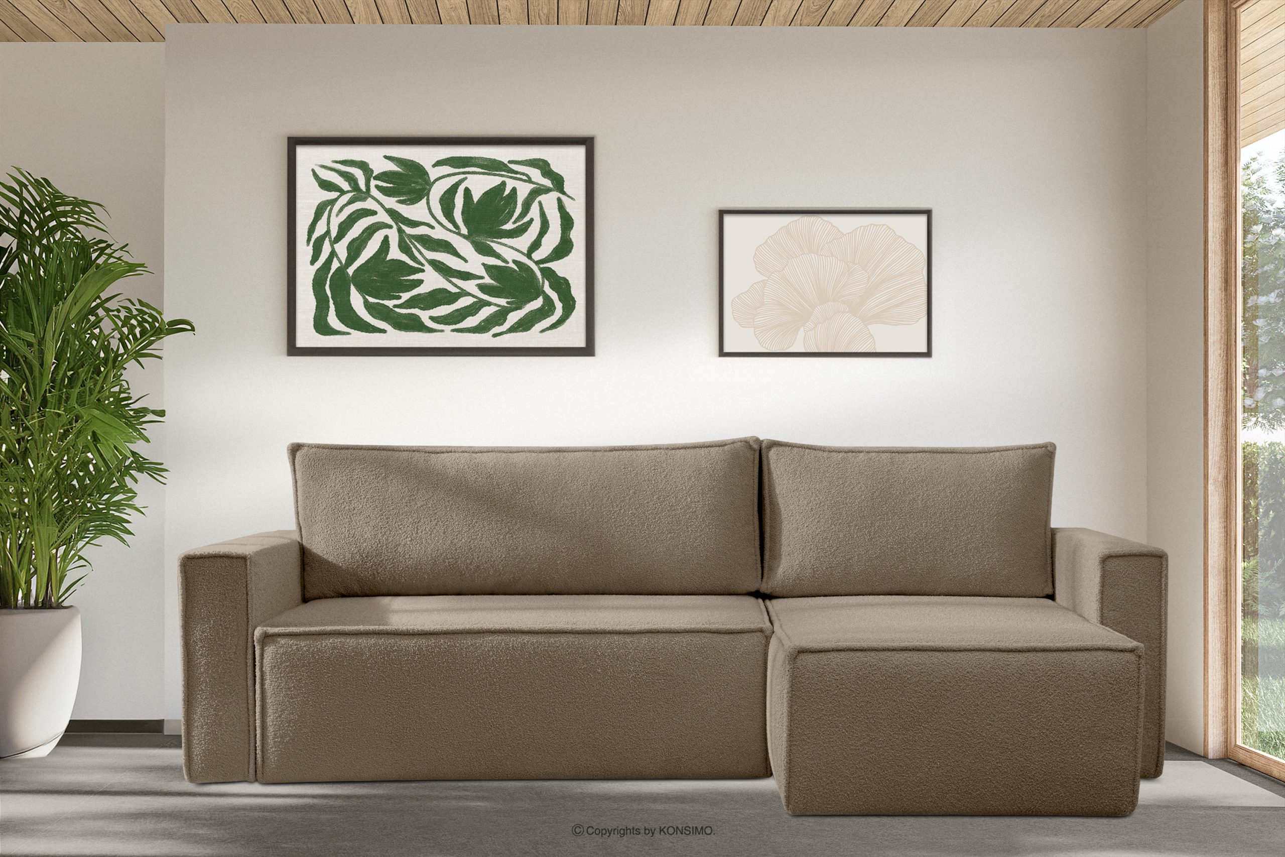 Das Boucle-Ecksofa mit Schlaffunktion dunkelbeige links/rechts ist ein Möbelstück im modernistischen Stil. Es hat breite Seiten vom Typ HAWAI, wodurch es sich besser für größere Räume eignet. Es ist ein universelles Ecksofa, d.h. es hat die zusätzliche Eigenschaft, dass Sie die Seite, auf der Sie das Sofa haben möchten, selbst wählen können.
