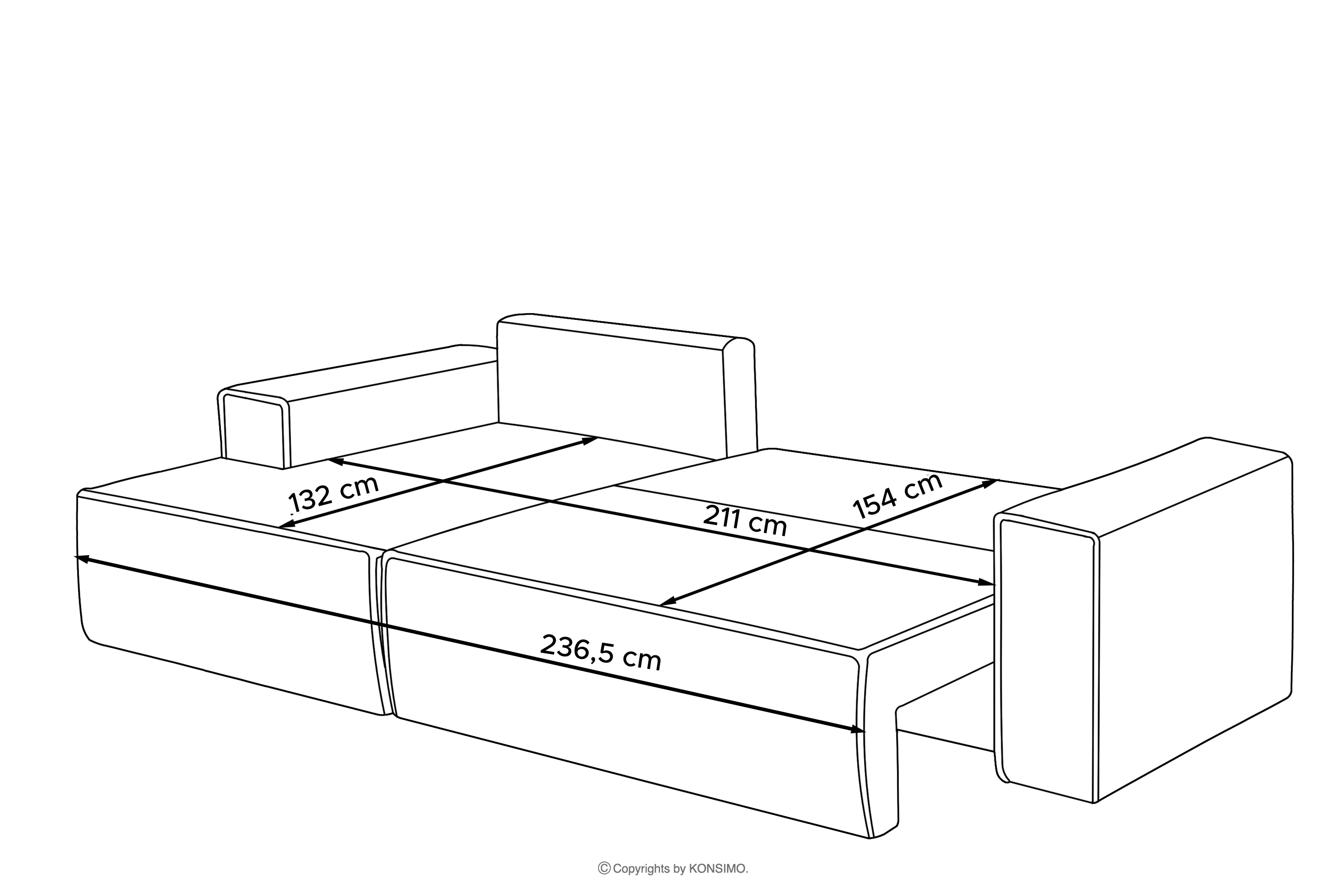 Unser Ecksofa NAPI sieht nicht nur einzigartig aus, es ist auch eine solide Konstruktion. Die Sitzfläche ist mit Schaumstoff T30/45 80 gefüllt und mit einer Wellenunterfederung versehen, die für lang anhaltenden Komfort und Elastizität sorgt. Diese Kombination macht das Ecksofa auch sehr verformungsbeständig. Es handelt sich um ein Möbelstück, das viele Jahre lang seine Form behält. Das Sofa ist mit einem Bettzeugkasten ausgestattet, der viel Platz für zusätzliche Bettwaren, Decken oder Kissen bietet. Die Schlaffunktion ist sicherlich einer der größten Vorzüge dieses Ecksofas. Bei dem verwendeten DL-System wird die Sitzfläche leicht angehoben und nach vorne geschoben, um die Rückenlehne in den freien Raum zu stellen.