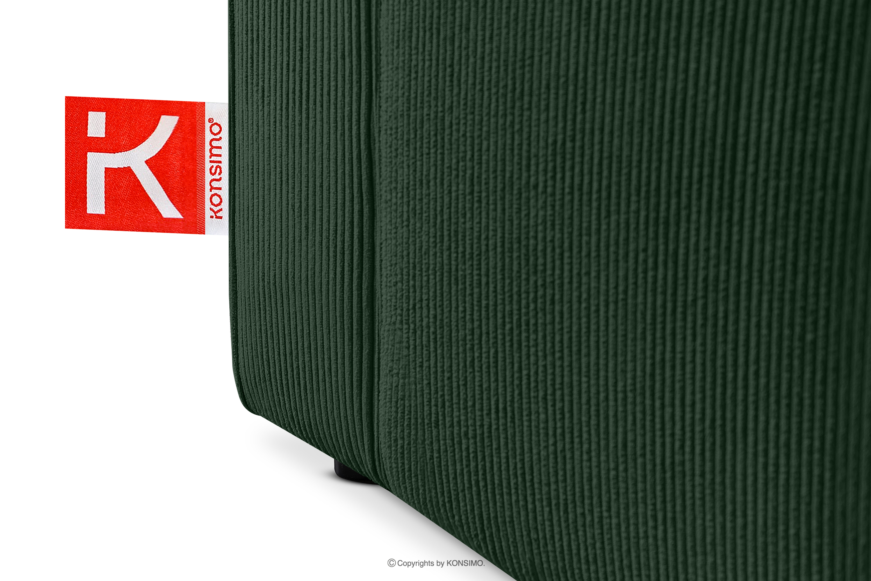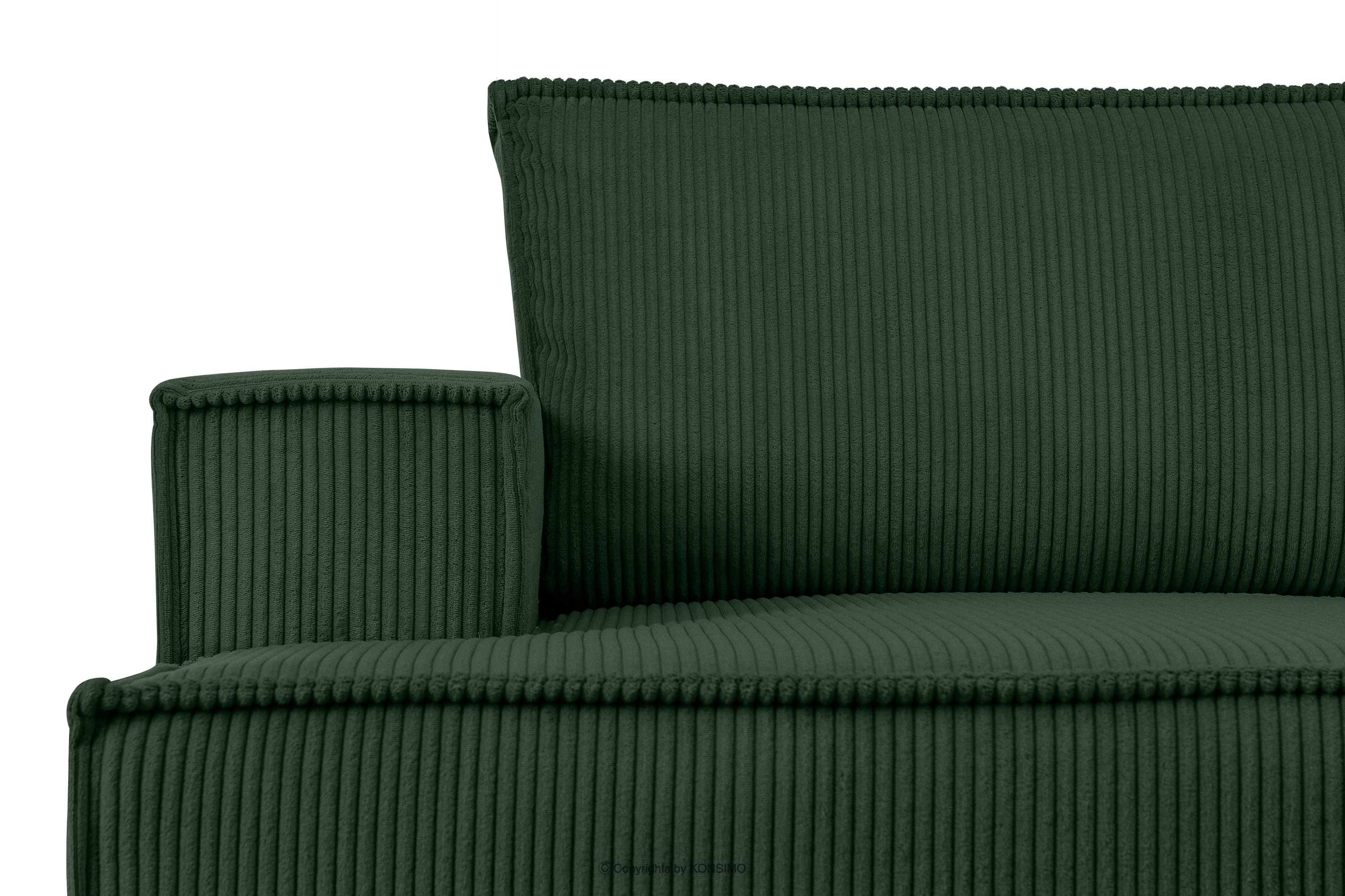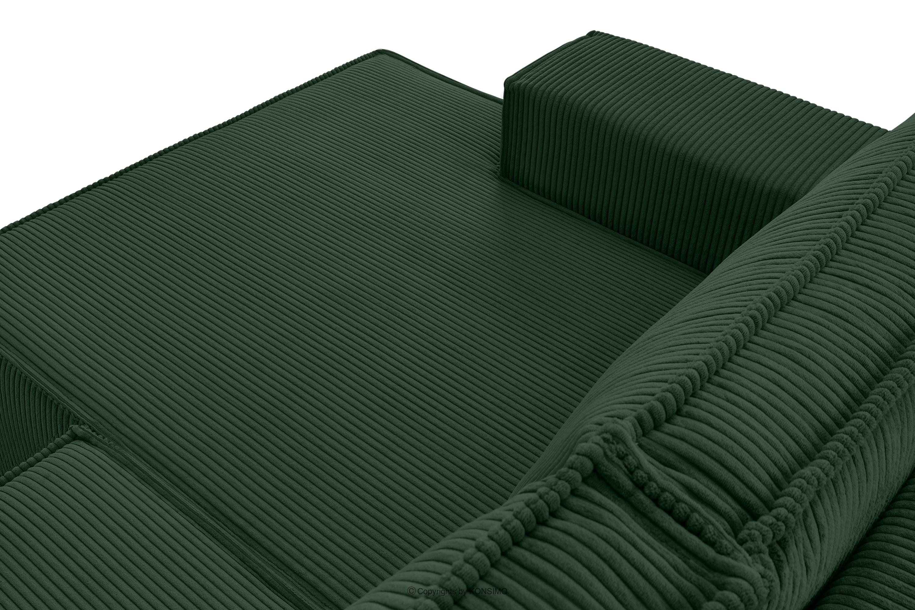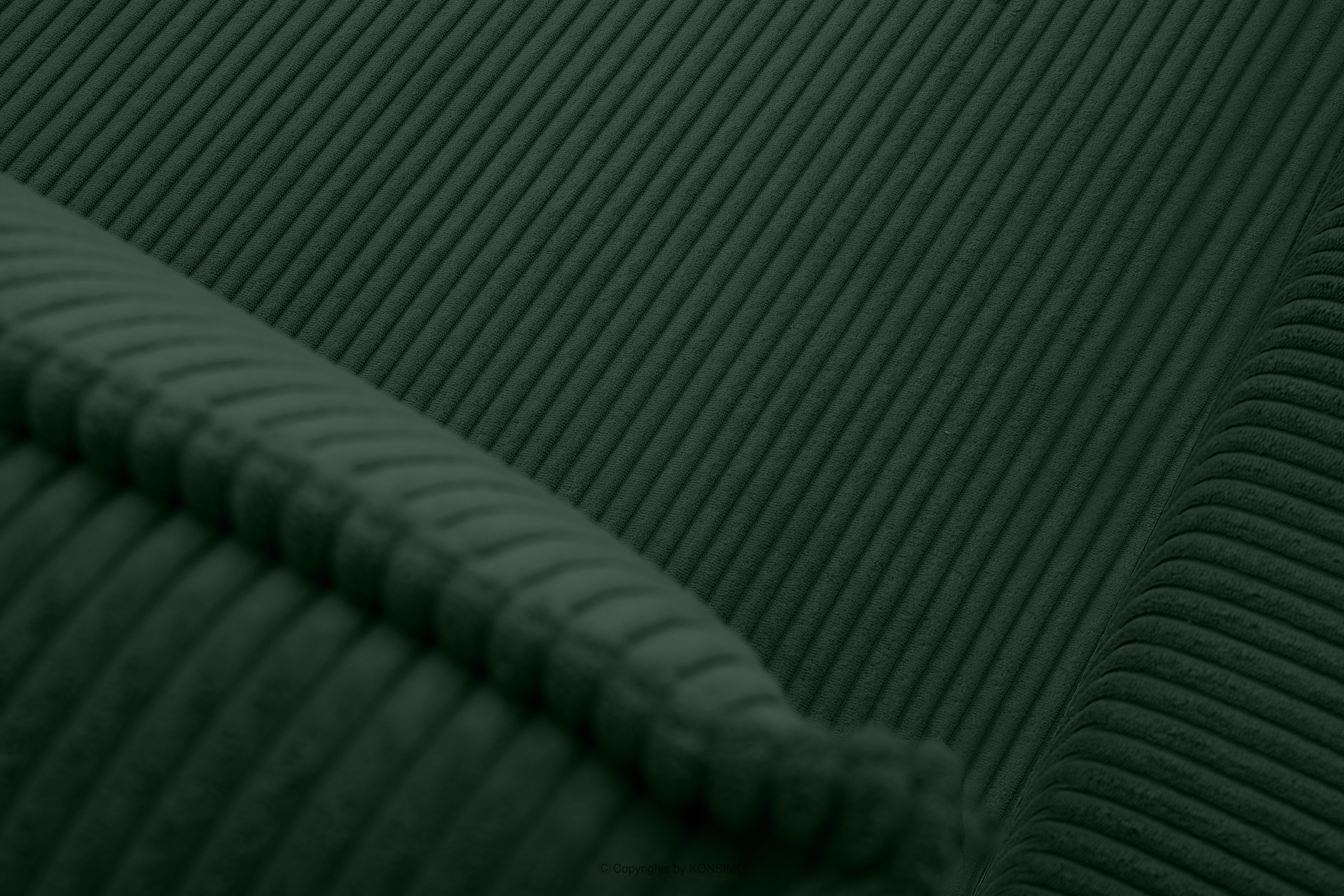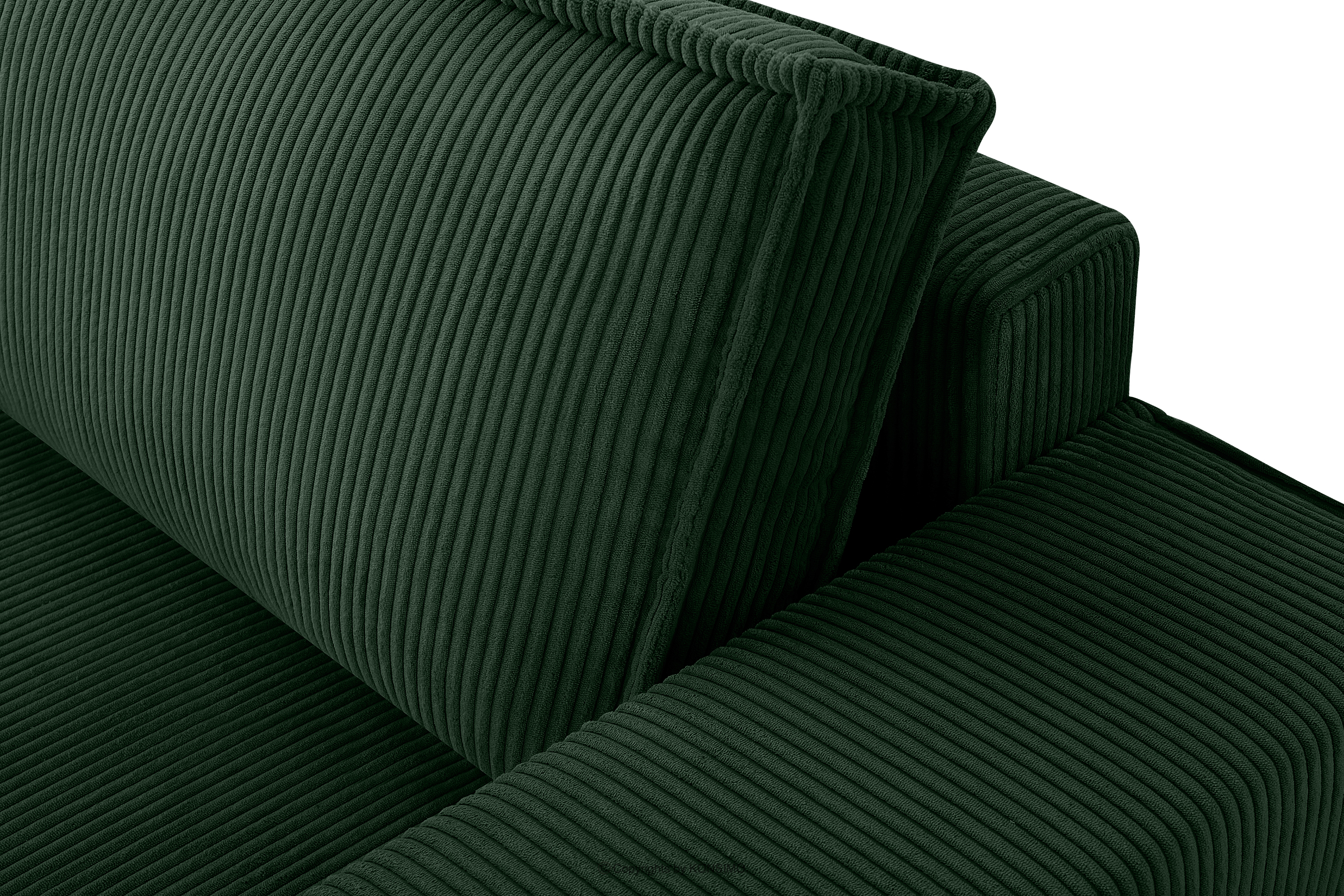 Das klappbare Ecksofa mit Bettkasten aus dunkelgrünem Kordstoff zieht die Aufmerksamkeit auf sich und hebt sich so von anderen Möbeln ab. Die gesamte Polsterung dieses außergewöhnlichen Möbelstücks ist aus feinem Kordstoff gefertigt, der nicht nur einen angenehmen Griffkomfort, sondern auch eine langlebige, makellose Ästhetik garantiert. Mit diesem Stoff sieht Ihre NAPI-Ecke immer perfekt aus, unabhängig von der Zeit und den Bedingungen der Nutzung.