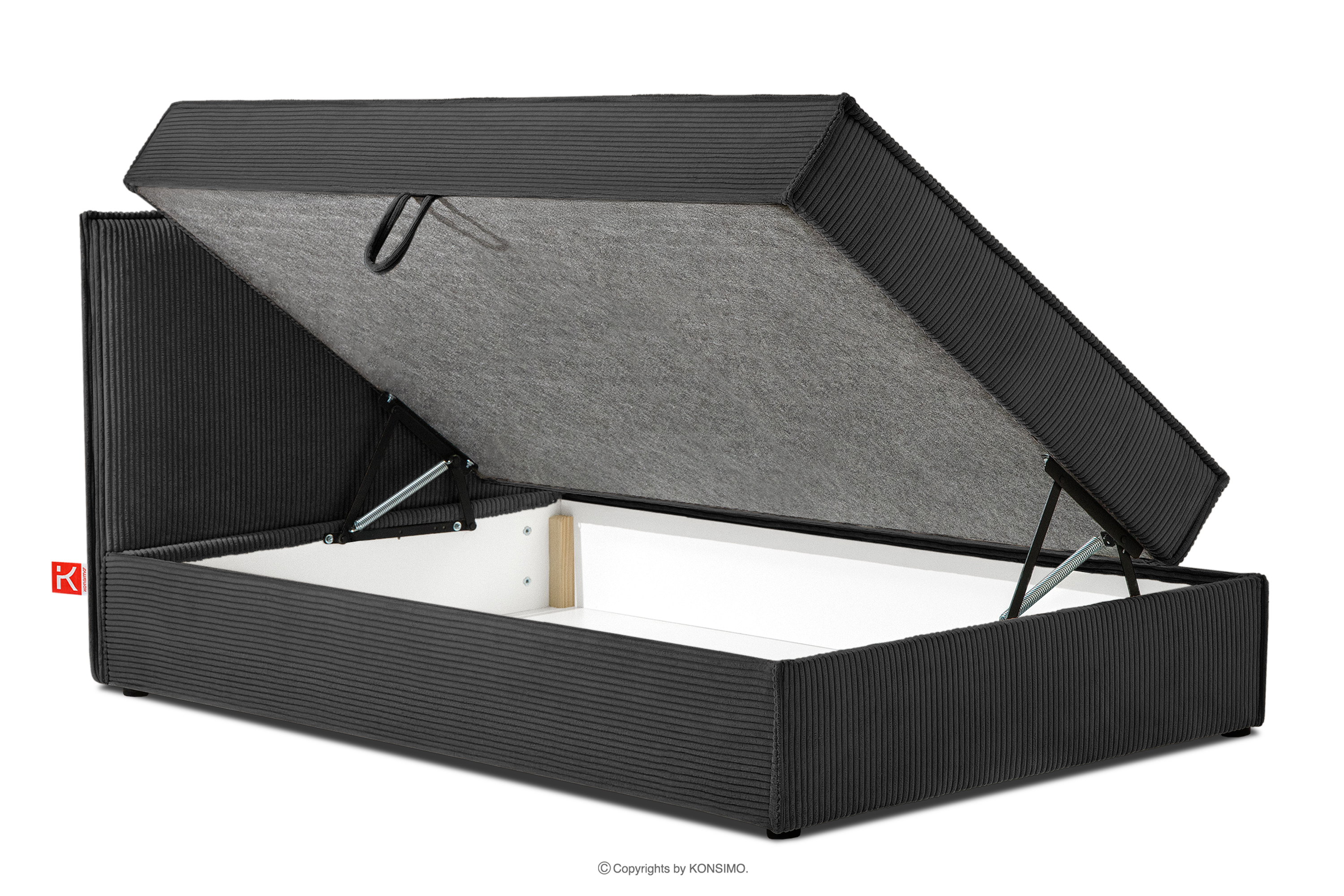 Das 100 cm lange Einzelbett aus dunkelgrauem Kordstoff ist eine perfekte Kombination aus Funktionalität, Komfort und modernem Design, die perfekt zum Stil zeitgenössischer Innenräume passt. Es ist bis ins kleinste Detail durchdacht und bietet nicht nur Schlafkomfort, sondern auch ein ästhetisches Aussehen, das jedes Schlafzimmer schmückt. Seine solide Konstruktion basiert auf einem robusten Rahmen, der Stabilität und Langlebigkeit garantiert.