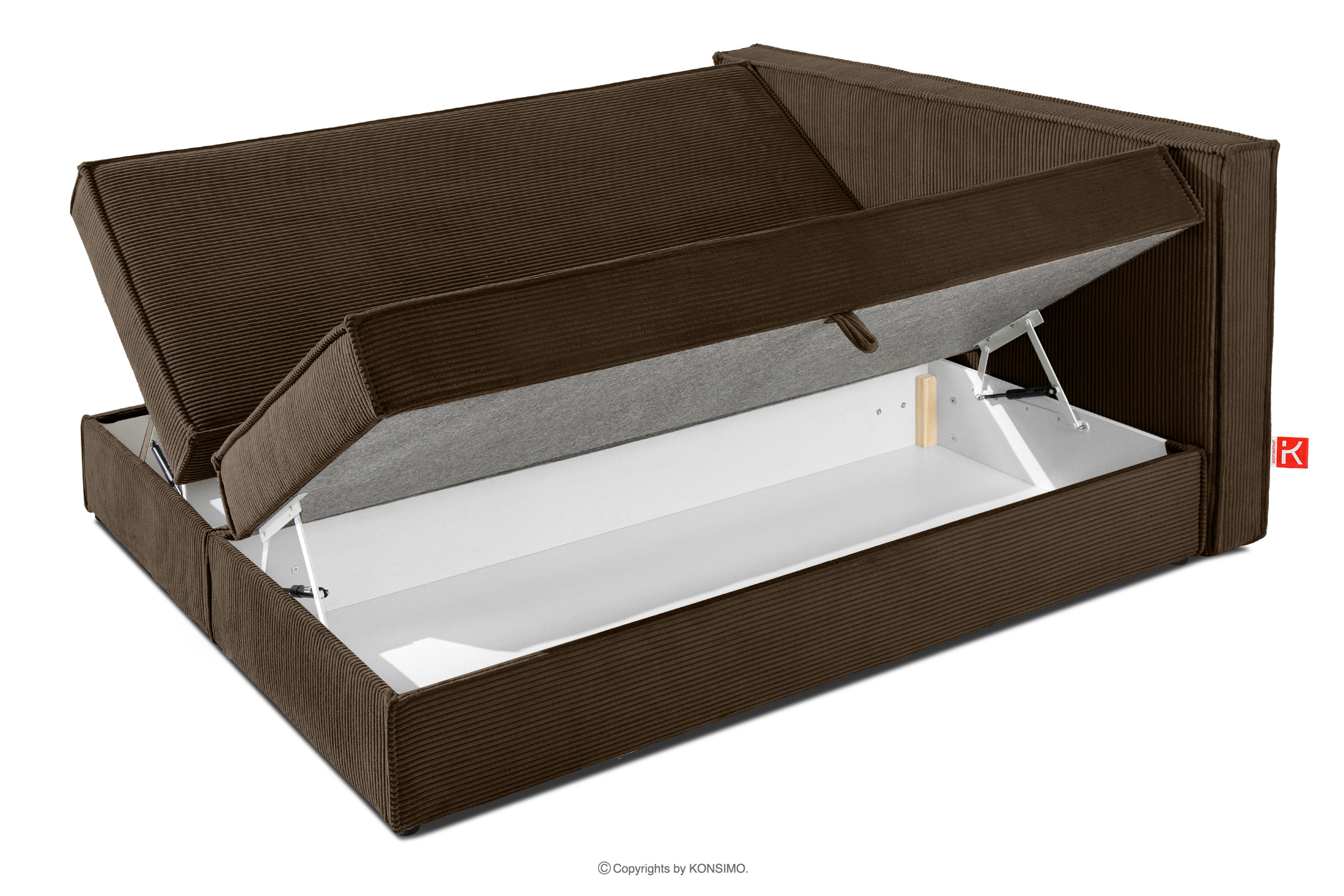 Das 140 cm lange Bett mit Bettkasten aus Kordstoff in Dunkelbraun ist eine perfekte Kombination aus Funktionalität, Komfort und modernem Design, die perfekt zum Stil zeitgenössischer Innenräume passt. Es ist bis ins kleinste Detail durchdacht und bietet nicht nur Schlafkomfort, sondern auch ein ästhetisches Aussehen, das jedes Schlafzimmer schmücken wird. Seine solide Konstruktion basiert auf einem robusten Rahmen, der Stabilität und Langlebigkeit garantiert.