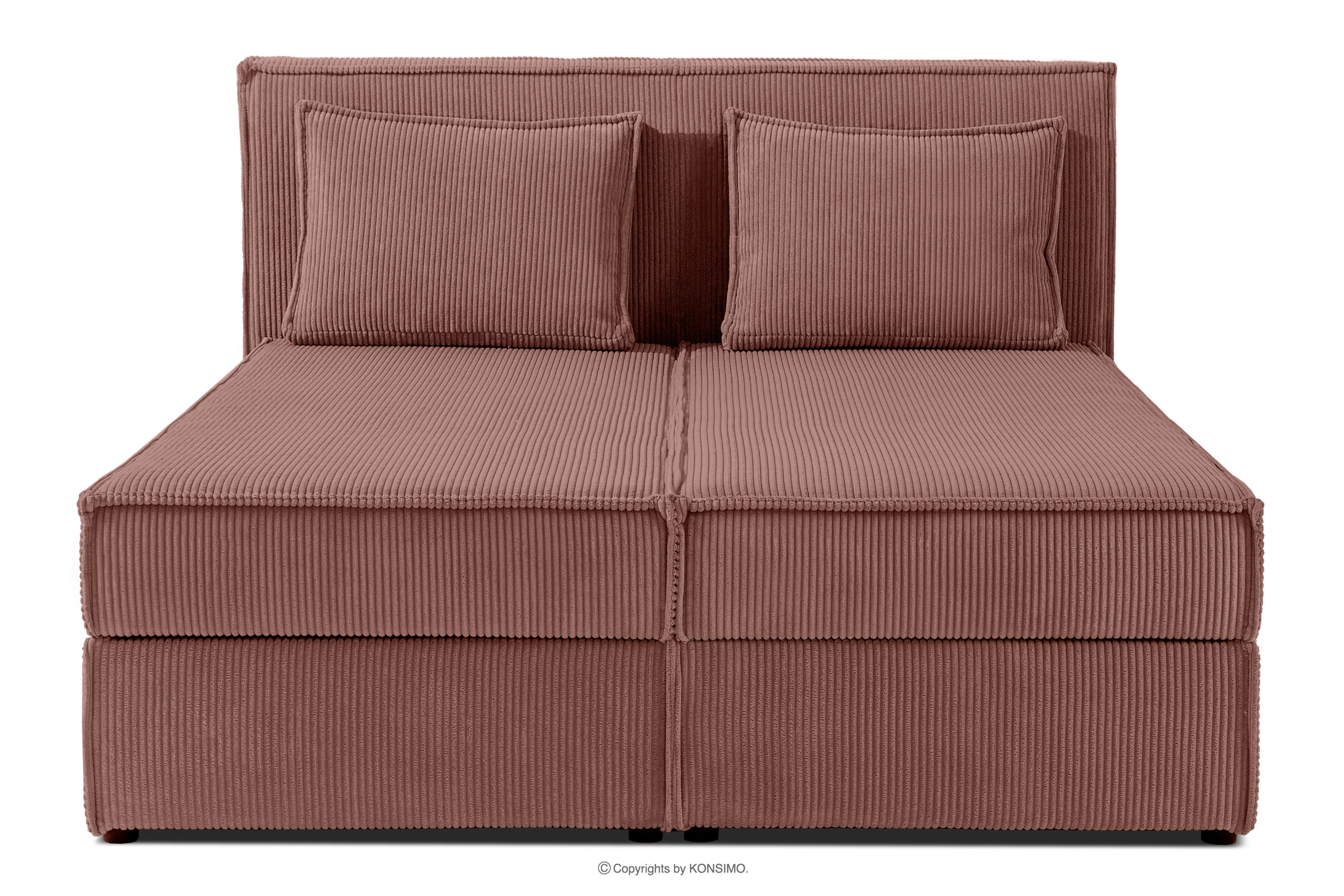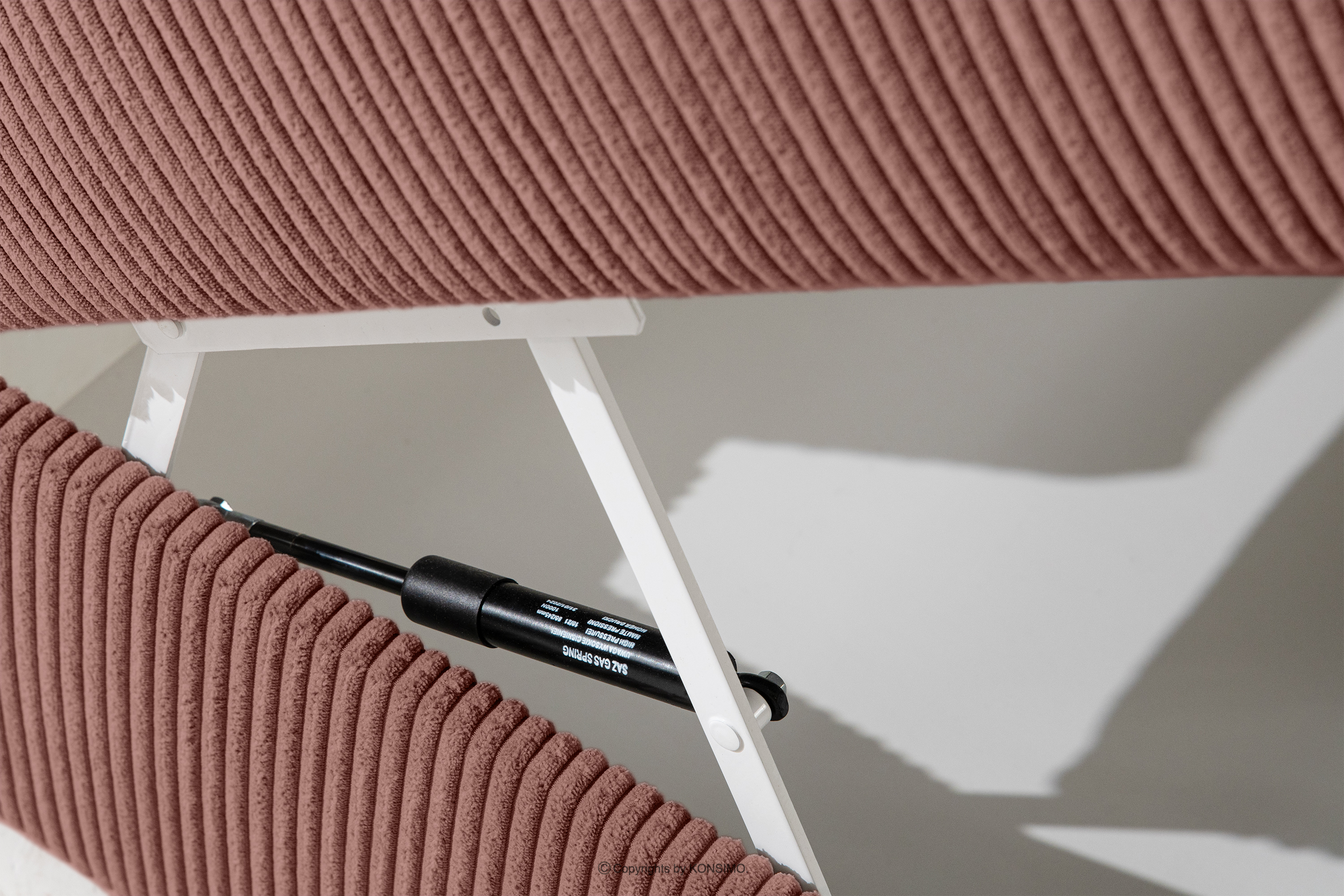 Das 140 cm lange Bett mit Bettkasten aus rosafarbenem Kordstoff ist eine perfekte Kombination aus Funktionalität, Komfort und modernem Design, die perfekt zum Stil zeitgenössischer Innenräume passt. Es wurde bis ins kleinste Detail durchdacht und bietet nicht nur Schlafkomfort, sondern auch ein ästhetisches Aussehen, das jedes Schlafzimmer schmückt. Seine solide Konstruktion basiert auf einem robusten Rahmen, der Stabilität und Langlebigkeit garantiert.
