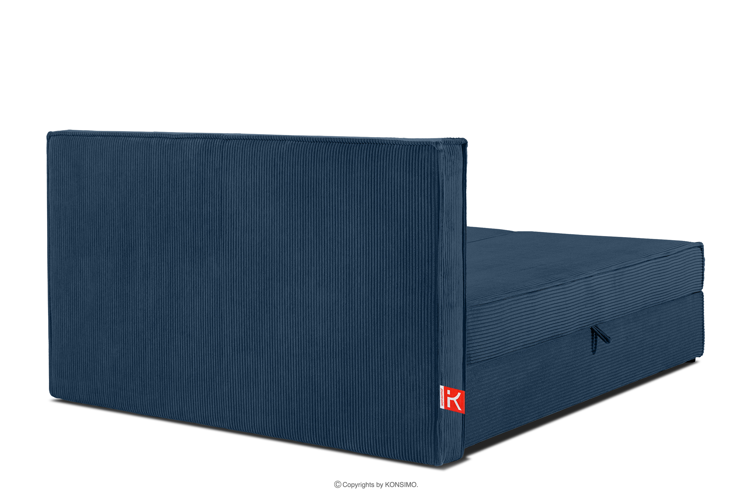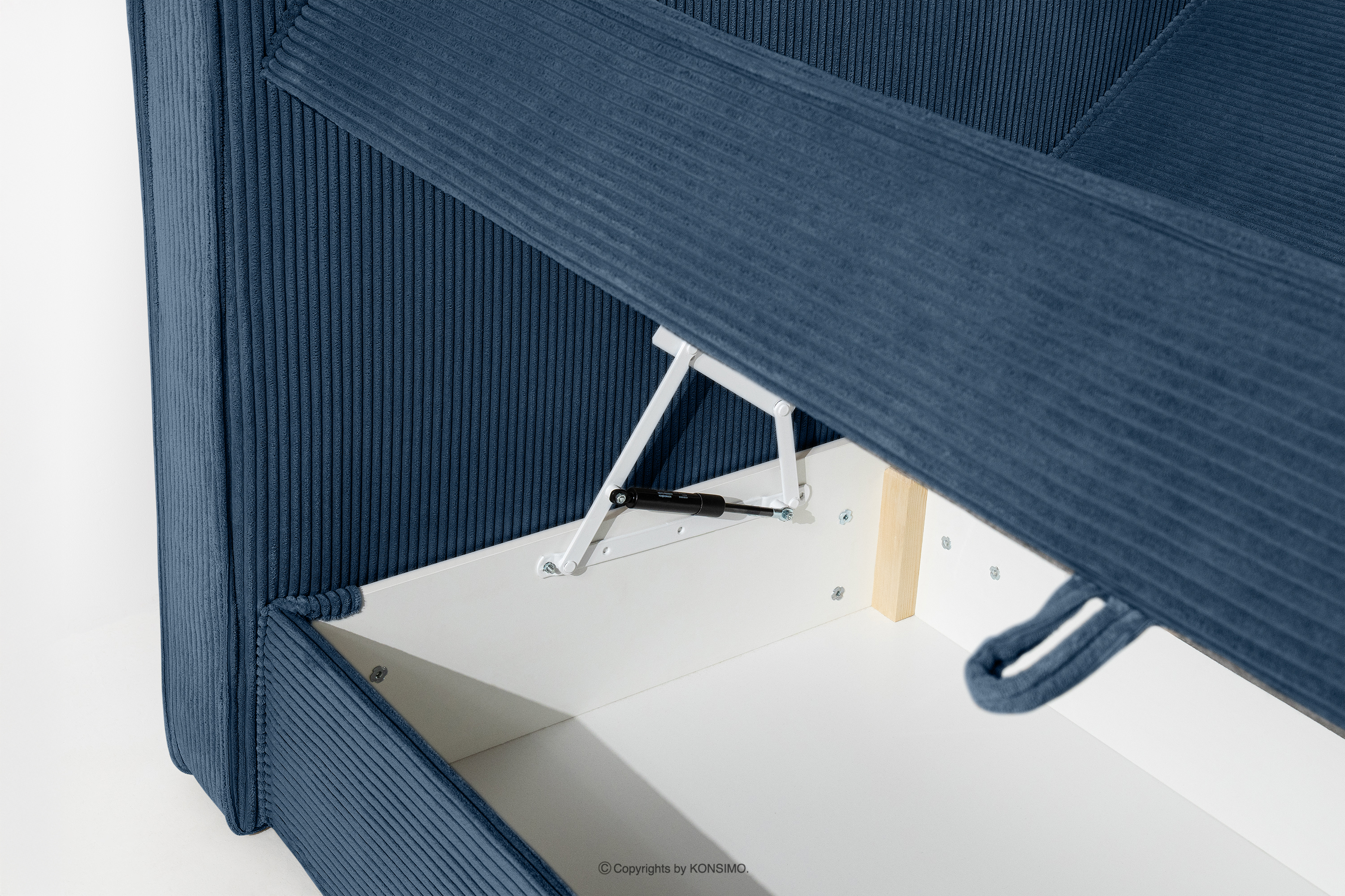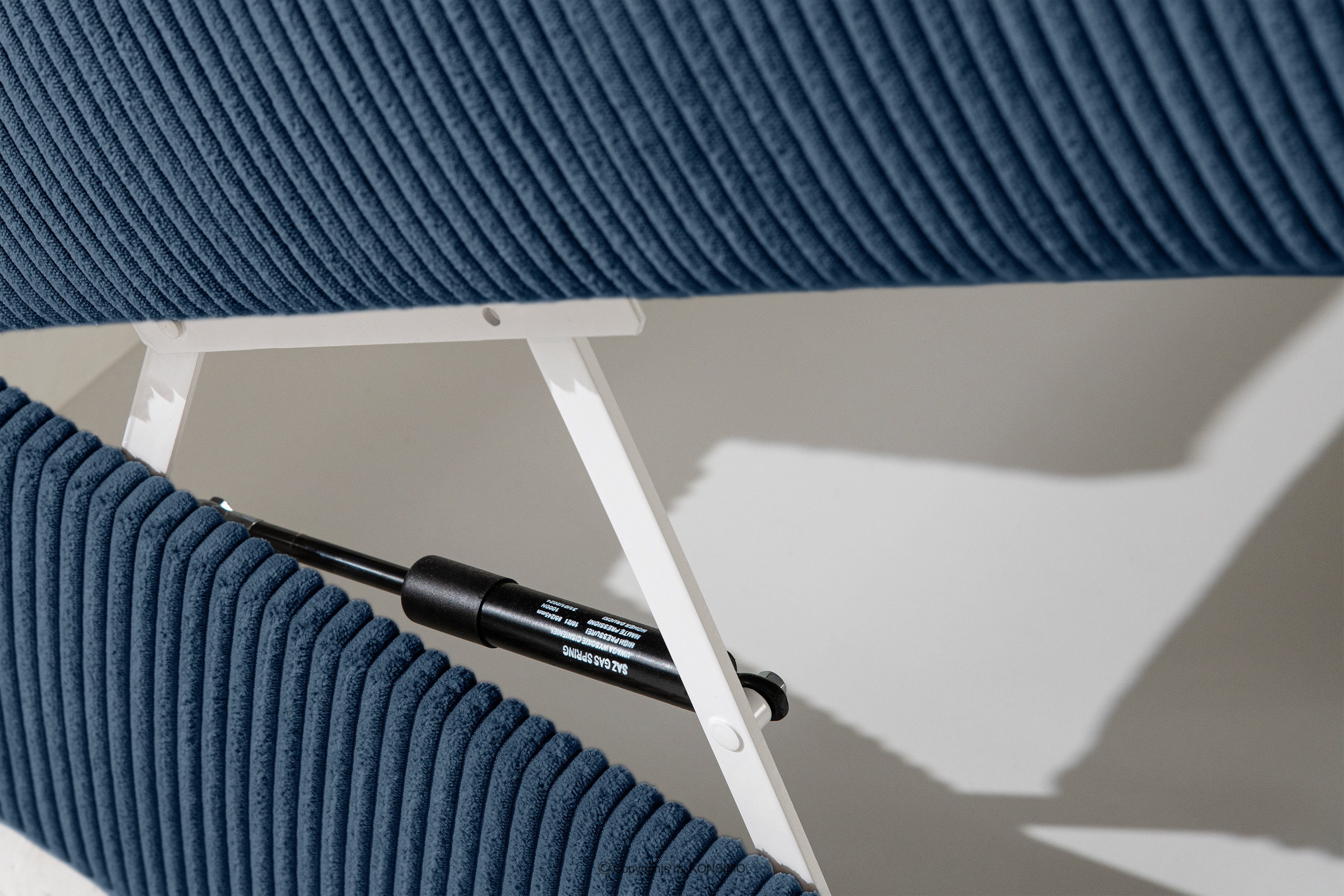 Das 140 cm lange Bett mit Bettkasten aus Kordstoff in Marineblau ist eine perfekte Kombination aus Funktionalität, Komfort und modernem Design, die perfekt zum Stil zeitgenössischer Innenräume passt. Es ist bis ins kleinste Detail durchdacht und bietet nicht nur Schlafkomfort, sondern auch ein ästhetisches Aussehen, das jedes Schlafzimmer schmückt. Seine solide Konstruktion basiert auf einem robusten Rahmen, der Stabilität und Langlebigkeit garantiert.