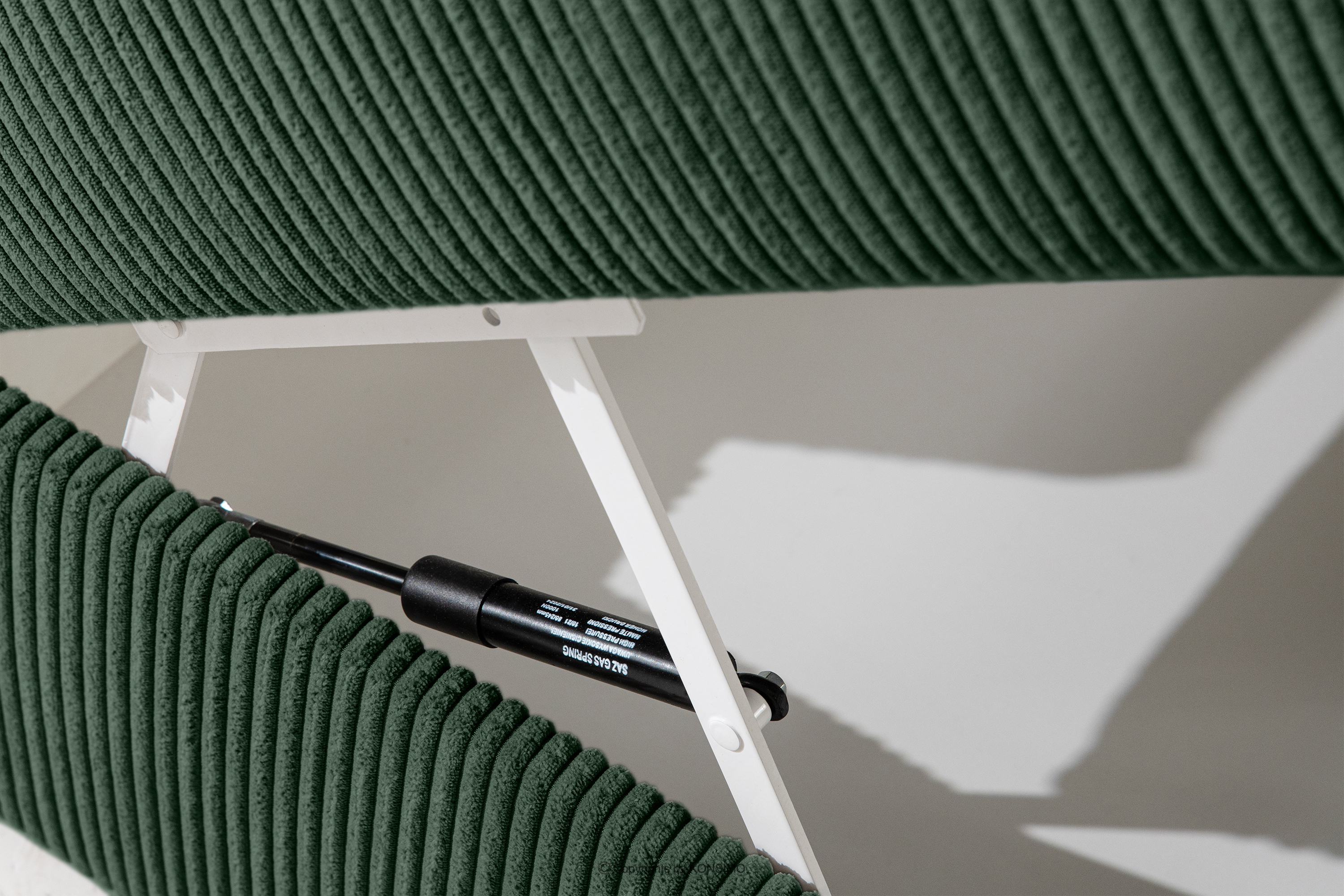 Das 160 cm lange Doppelbett aus dunkelgrünem Kordstoff ist eine perfekte Kombination aus Funktionalität, Komfort und modernem Design, die perfekt zum Stil zeitgenössischer Innenräume passt. Es ist bis ins kleinste Detail durchdacht und bietet nicht nur Schlafkomfort, sondern auch ein ästhetisches Aussehen, das jedes Schlafzimmer schmückt. Seine solide Konstruktion basiert auf einem robusten Rahmen, der Stabilität und Langlebigkeit garantiert.
