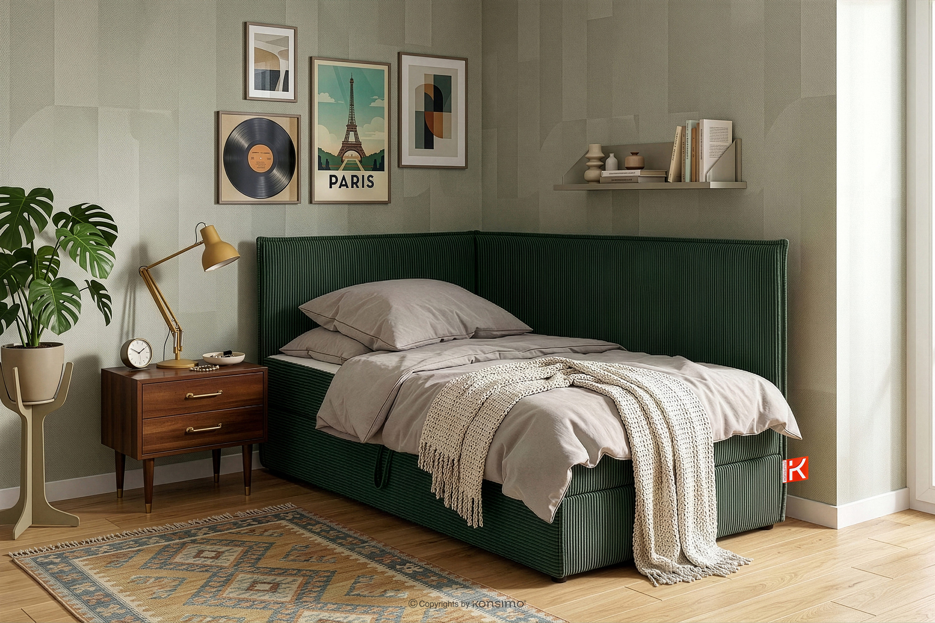Boxspringbett 90 cm für Jugendliche mit Rückenlehne aus dunkelgrünem Kordstoff es ist die perfekte Kombination aus Funktionalität, Komfort und modernem Design, die sich hervorragend in den Stil zeitgenössischer Innenräume einfügt. Mit viel Liebe zum Detail gefertigt, bietet es nicht nur Schlafkomfort, sondern auch ein ästhetisches Erscheinungsbild, das jedes Schlafzimmer verschönert. Seine solide Konstruktion basiert auf einem robusten Gestell, das Stabilität und Langlebigkeit garantiert.