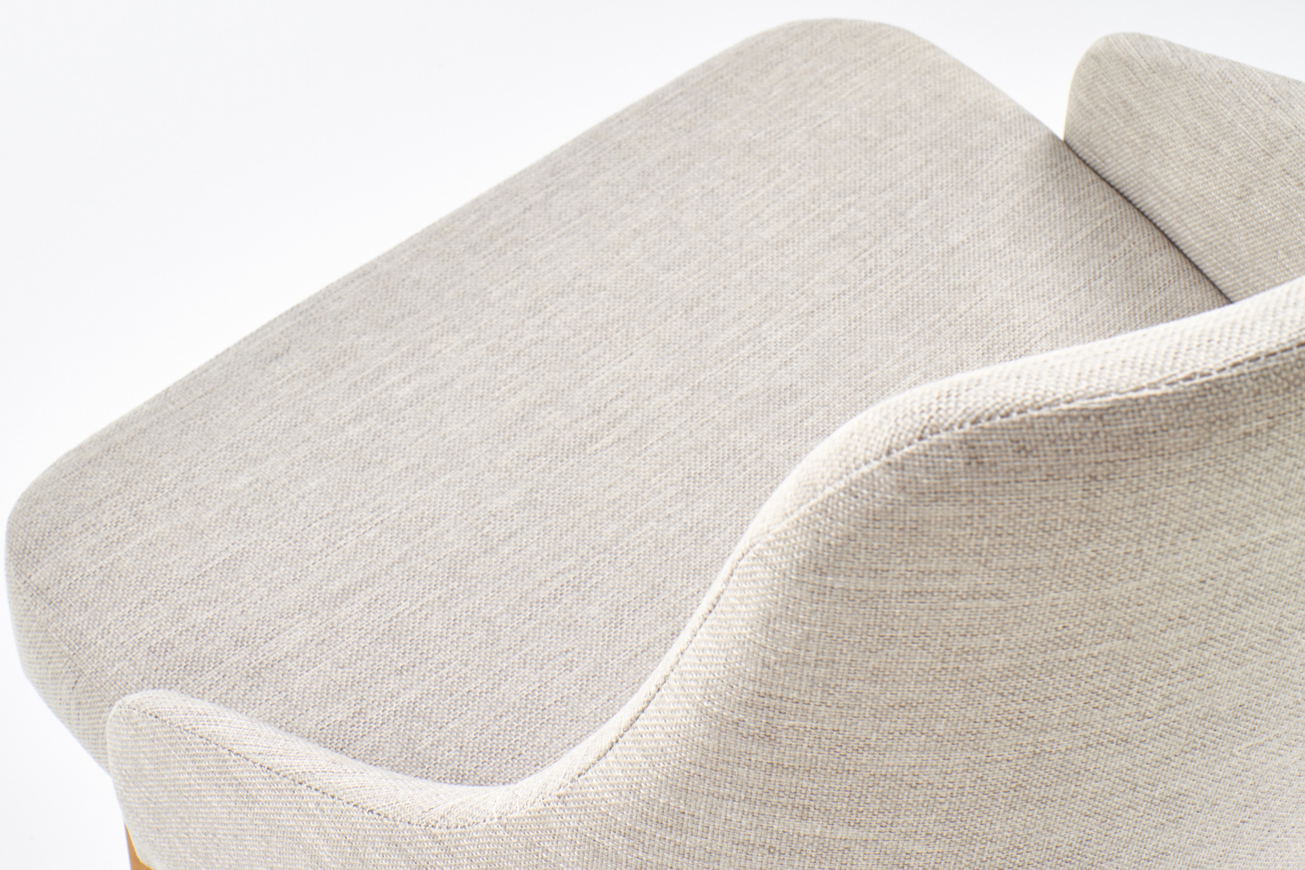 für das Produkt Skandinavischer Eimerstuhl mit Armlehnen beige auf naturbelassenen Holzbeinen