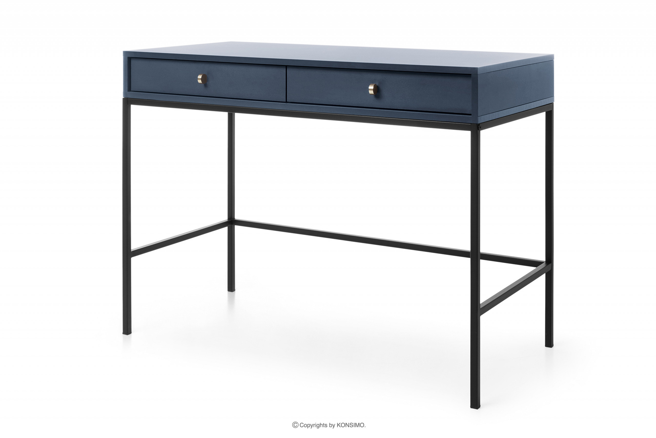 Der blaue Schreibtisch mit Schubladen aus der GEMMA-Kollektion besticht vor allem durch sein außergewöhnliches Design. Durch sein ungewöhnliches Aussehen und den Griff in Kombination mit den hohen Beinen wird dieses Möbelstück sicherlich in Ihrem Zuhause hervorstechen. Der GEMMA-Schreibtisch verfügt über zwei Schubladen, die zum Beispiel für Kosmetikartikel verwendet werden können, sodass der Schreibtisch auch als Schminktisch genutzt werden kann.