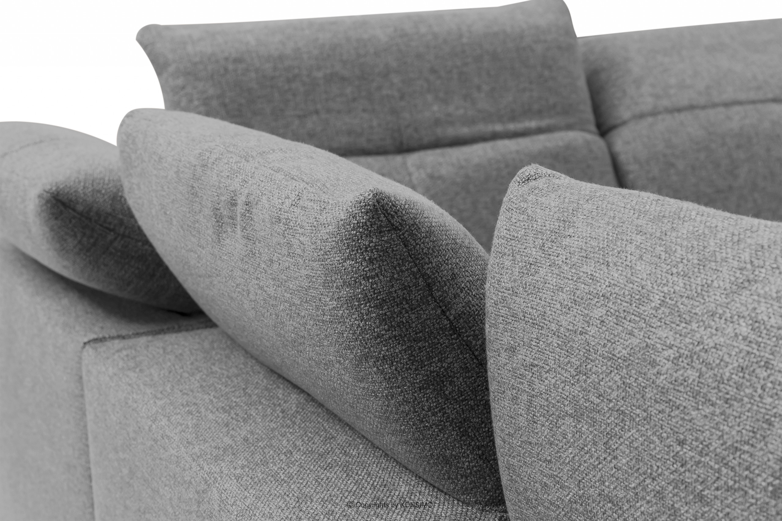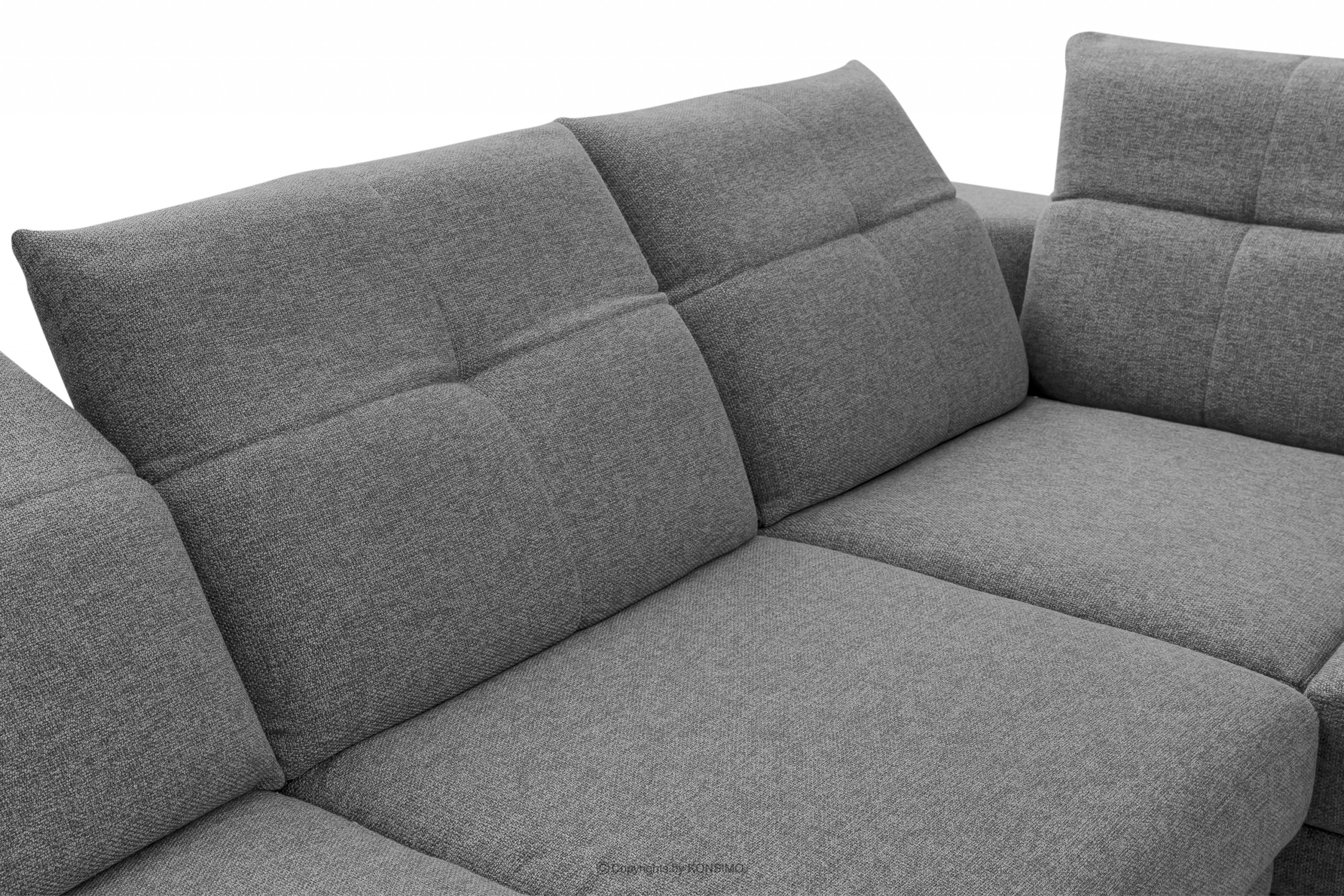 Graue Ecksofa mit verstellbarer Kopfstütze.