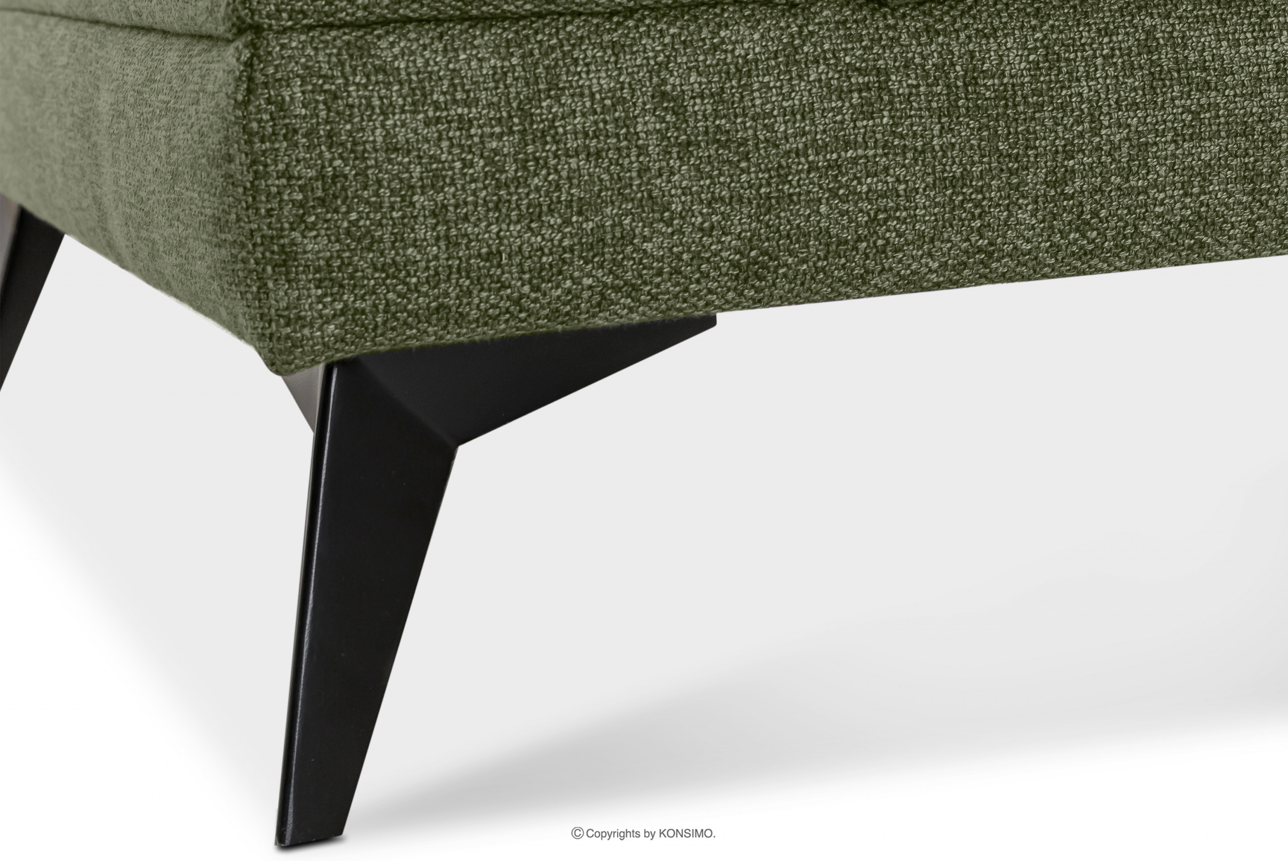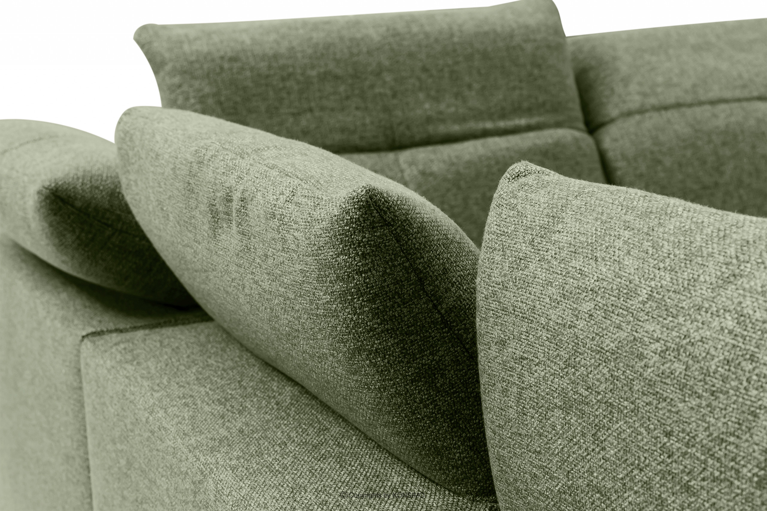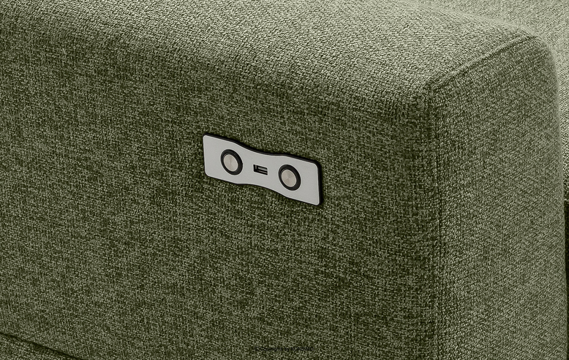 Das grüne Ecksofa mit Relaxfunktion links ist die ideale Lösung für große Wohnzimmer. Es ist mit hochwertigem geflochtenem Stoff bezogen, der sich durch leichte Pflege auszeichnet. Das gesamte Sofa steht auf hohen, modernen Metallbeinen, die schwarz lackiert sind. Sie betonen die Modernität des Sofas perfekt. Darüber hinaus verfügt es über eine Relaxfunktion, die eine elektrische Einstellung der Kopfstützen in fünf Positionen sowie der Sitzfläche ermöglicht.