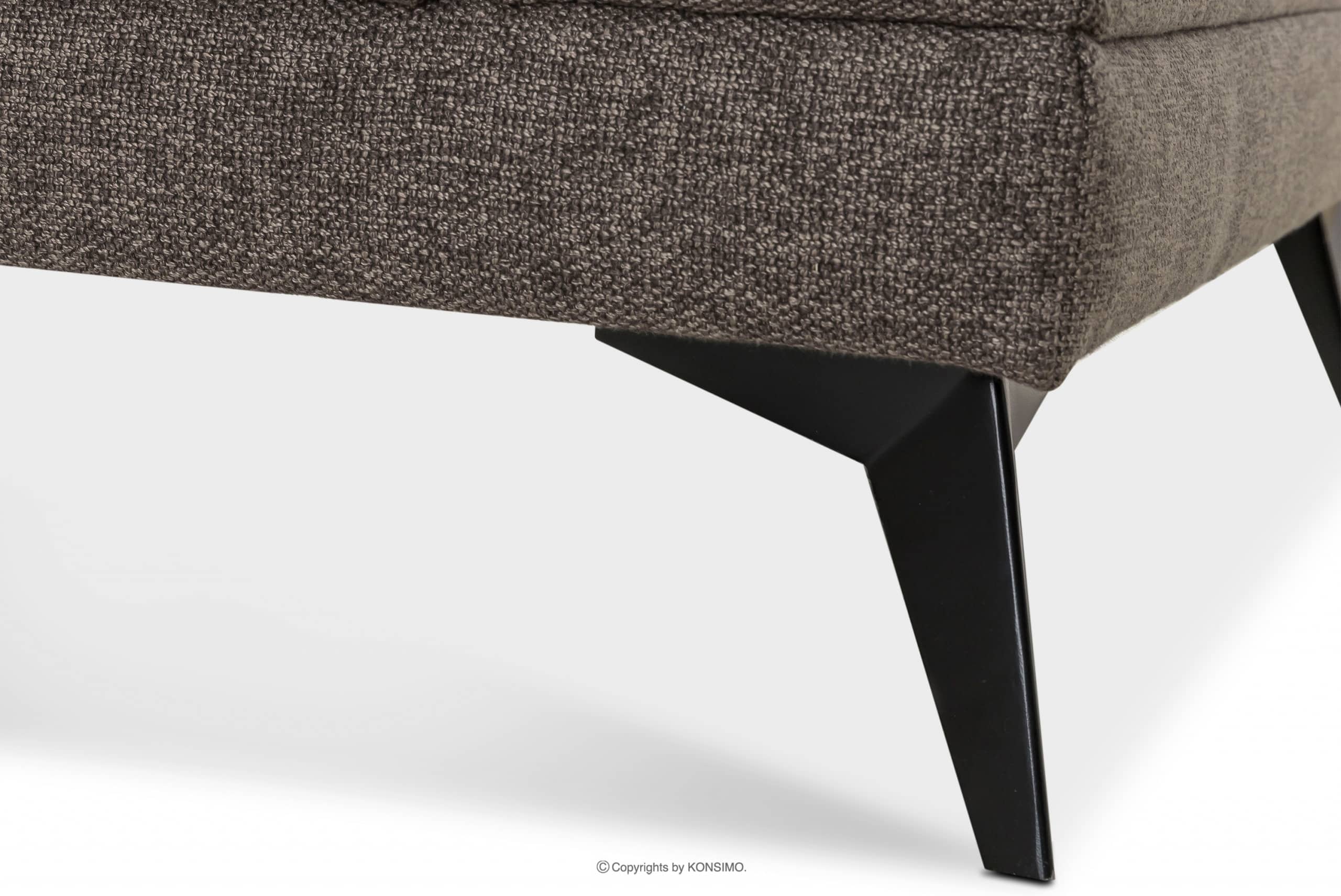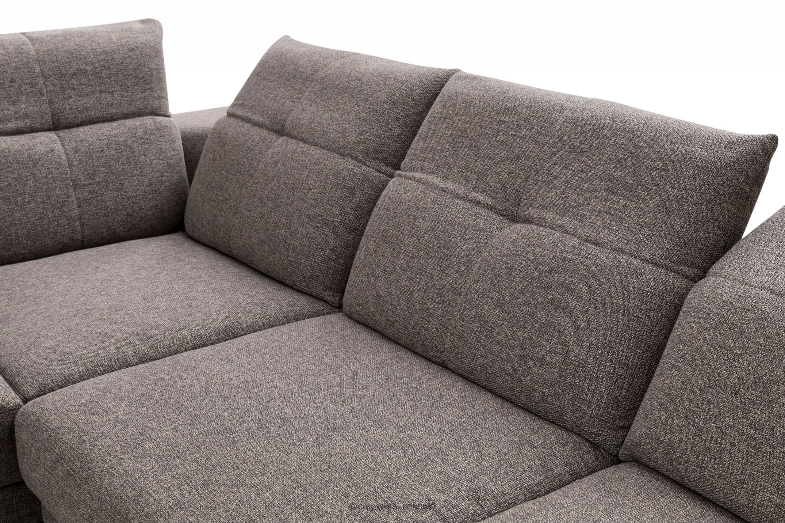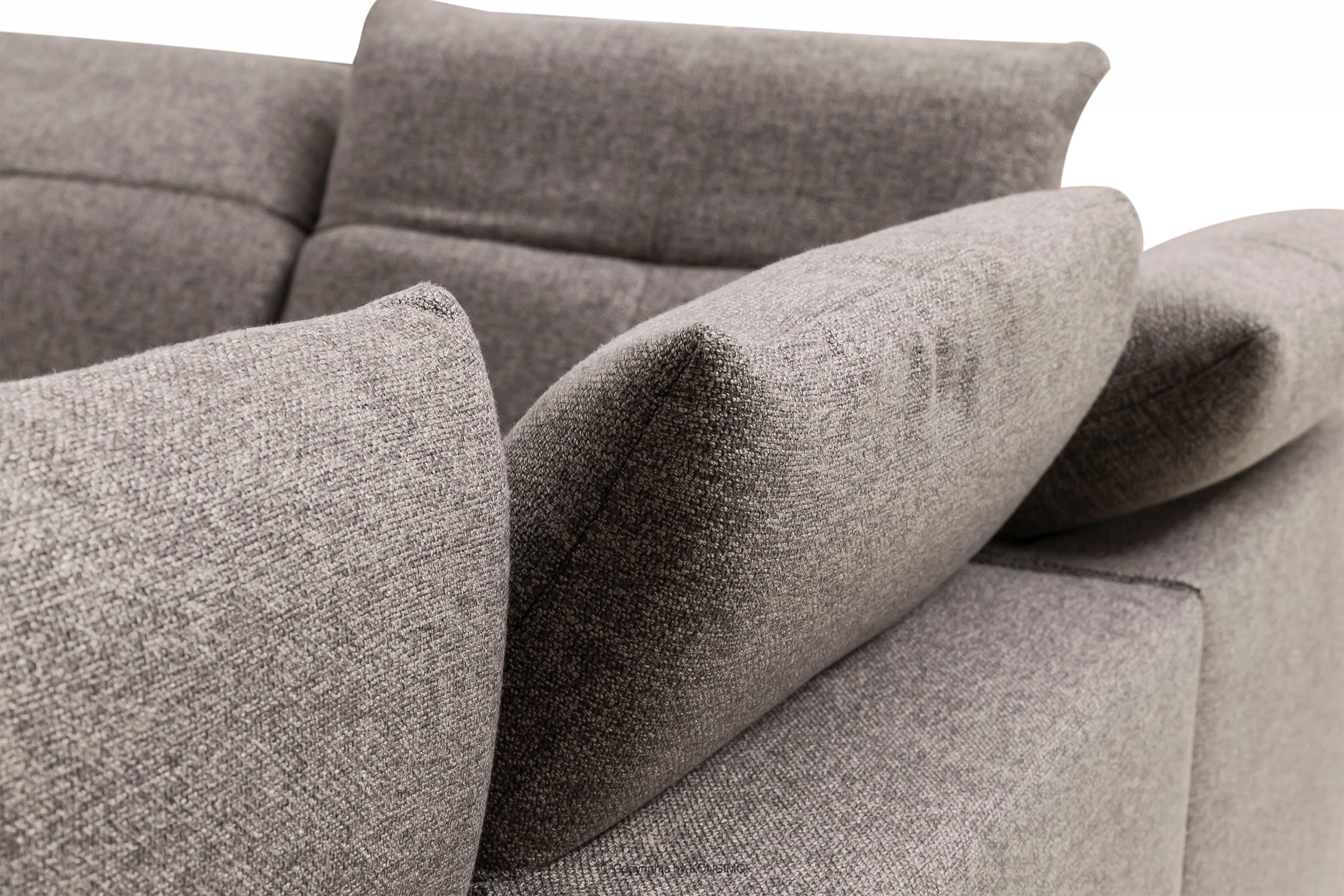Das linke Ecksofa mit Relaxfunktion in hellem Braun ist die ideale Lösung für große Wohnzimmer. Es ist mit hochwertigem geflochtenem Stoff bezogen, der sich durch leichte Reinigung auszeichnet. Das Ganze steht auf hohen, modernen Metallfüßen, die schwarz lackiert sind. Sie betonen die Modernität des Ecksofas perfekt. Zusätzlich verfügt es über eine Relaxfunktion, die eine elektrische Verstellung der Kopf- und Sitzstützen in fünf Positionen ermöglicht.
