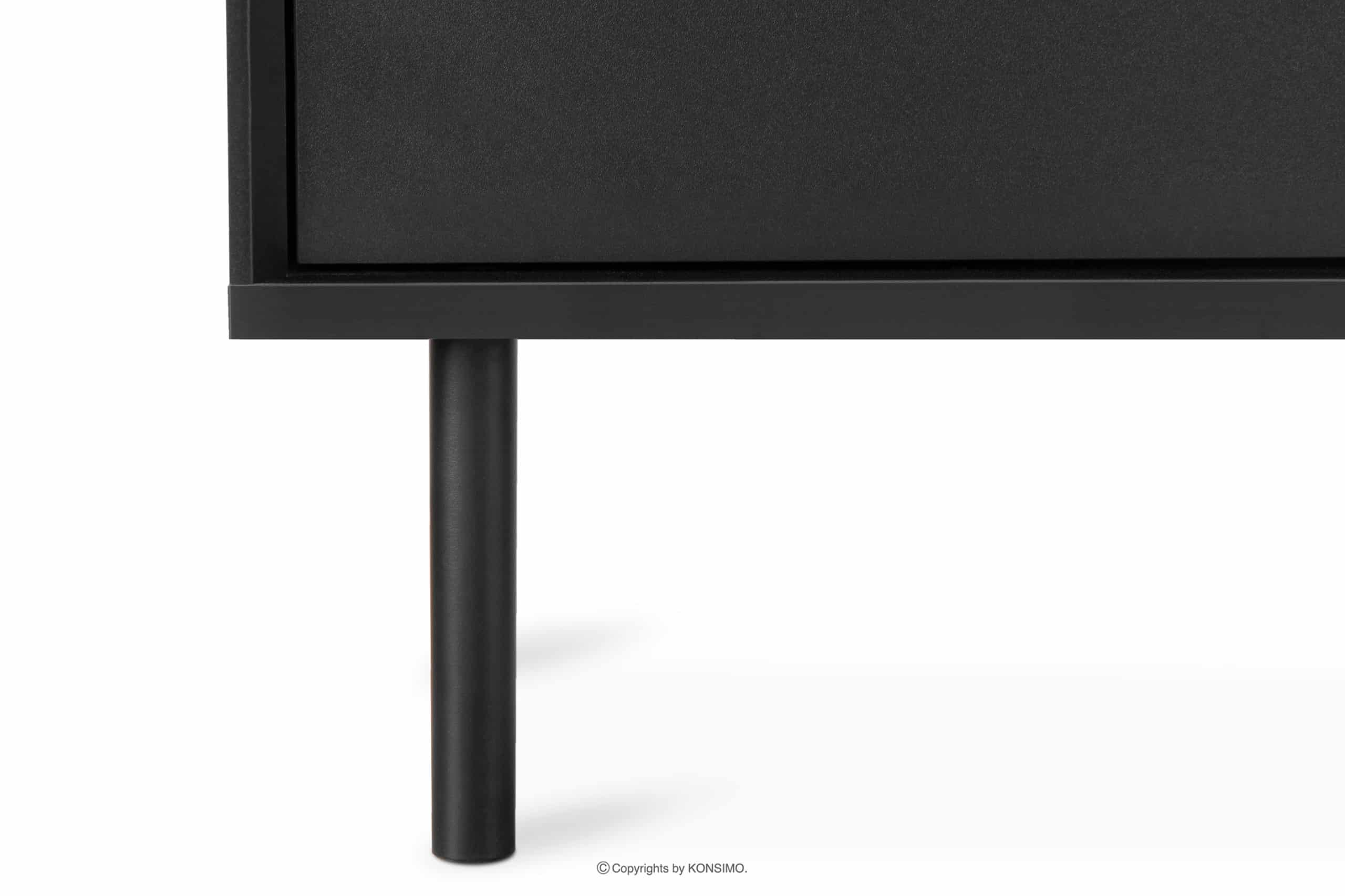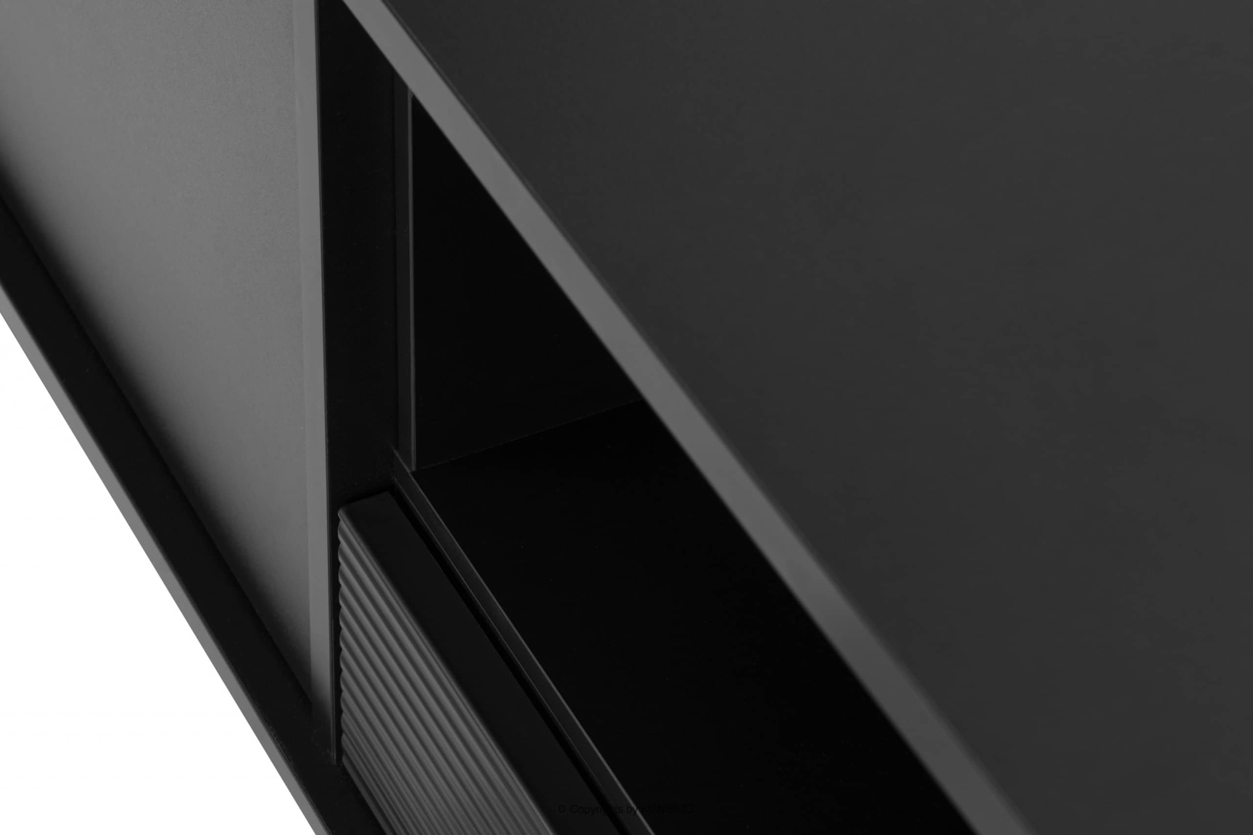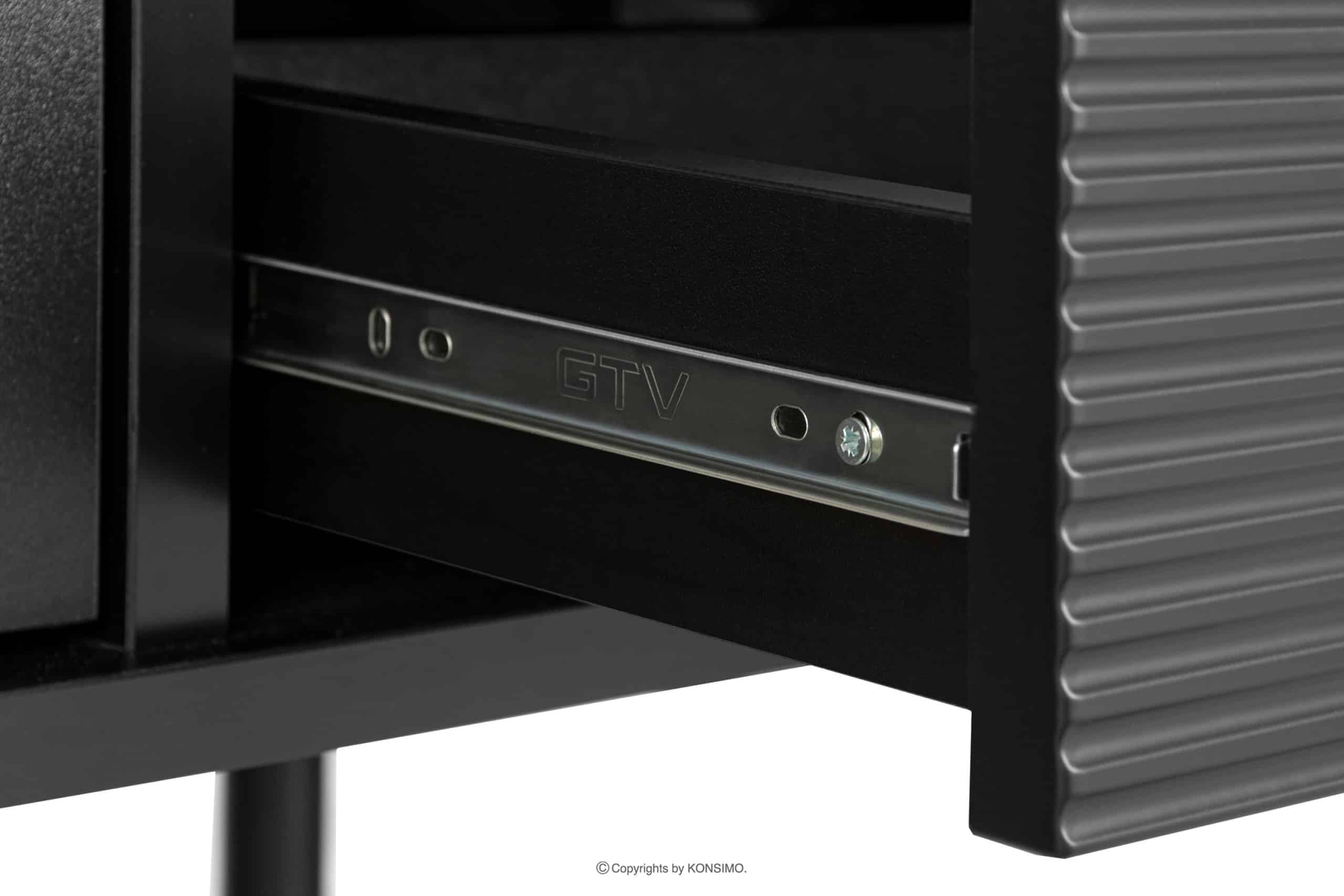 Der schwarze Loft-Style TV-Schrank mit Riffelung ist ein Möbelstück, das mit größter Sorgfalt und ausgewählten Materialien gefertigt wurde, um dem Benutzer Stabilität und Langlebigkeit über viele Jahre hinweg zu gewährleisten. Dank seiner Abmessungen bietet er viel Platz für kleine Gegenstände. Er verfügt über eine Schublade, ein Regal und zwei verschließbare Schränke.