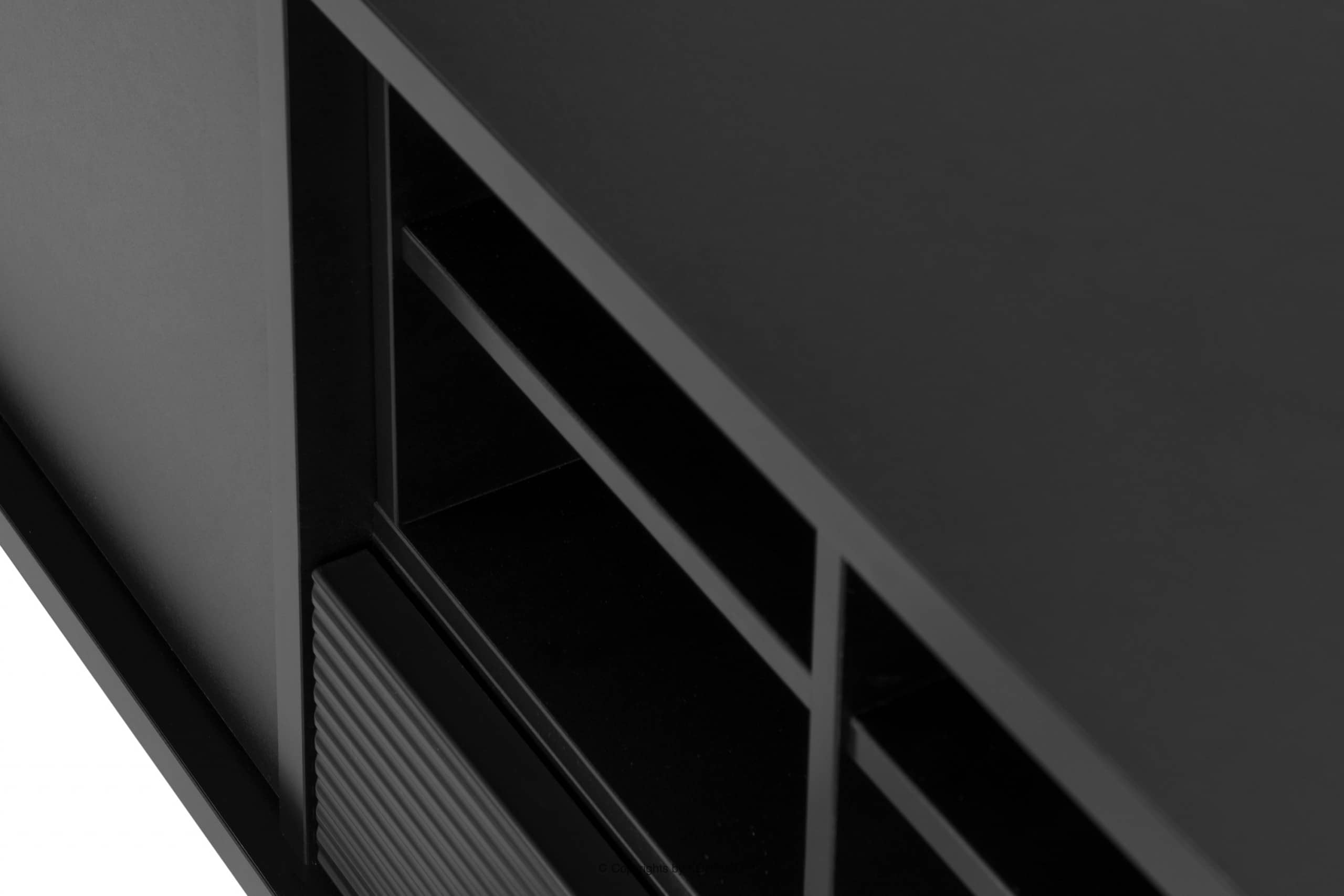 Breiter TV-Schrank im Loft-Stil mit schwarzen Regalen ist ein Möbelstück, das sorgfältig hergestellt wurde, um Benutzern Stabilität und Langlebigkeit zu bieten. Aufgrund seiner Größe bietet es Platz für viele praktische Gegenstände. Es hat eine Schublade, Regale und zwei verschließbare Schränke. Ihr Öffnungssystem ist push-open, sodass der TV-Schrank keine unnötigen Griffe hat.
