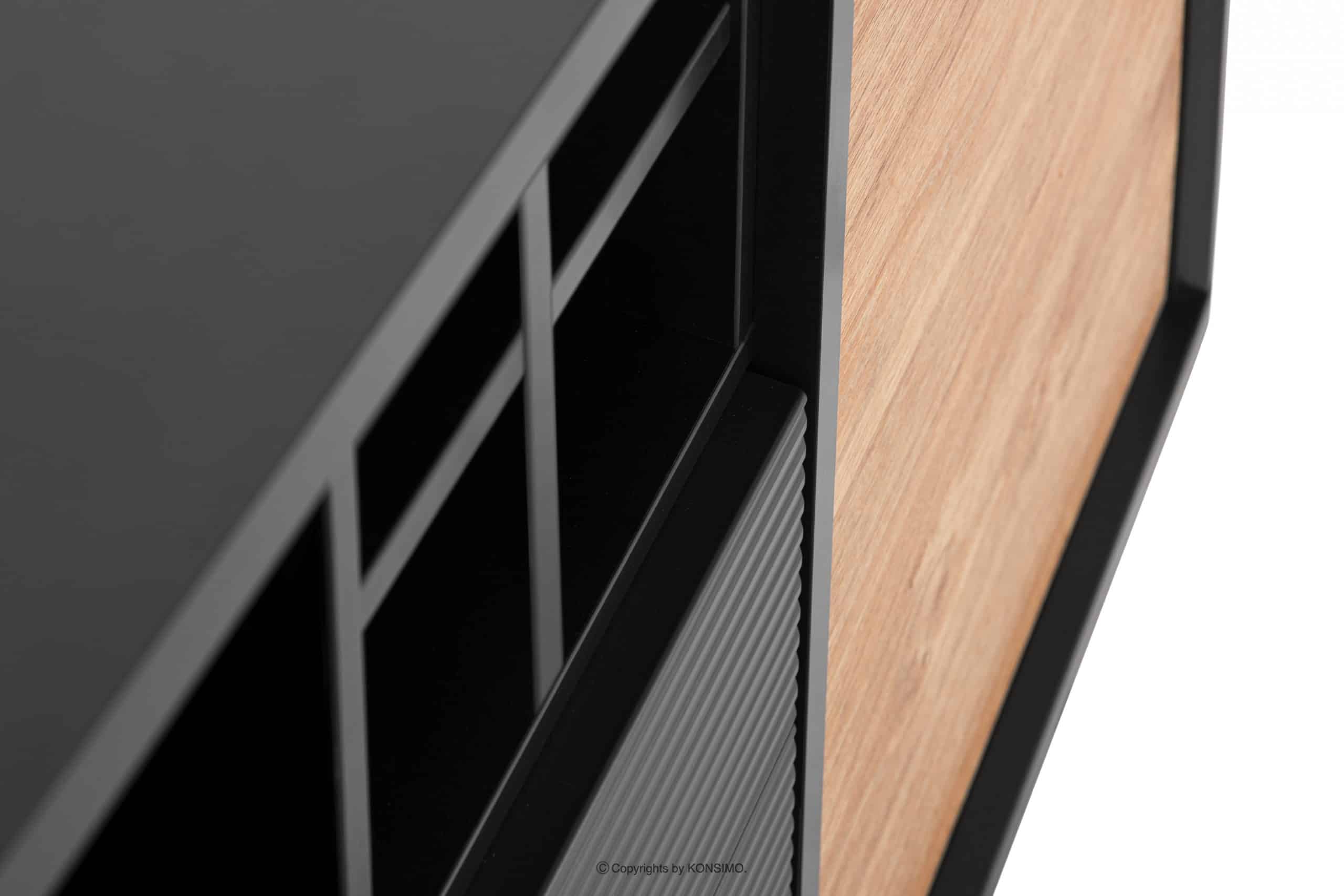 Der loftartige Schrank auf hohen Beinen wurde für Benutzer entwickelt, die Wert auf Details und hohe Qualität legen. Er bietet Platz für viele nützliche Gegenstände wie Dokumente, Kleidung oder Bücher. Er verfügt über zwei große Schränke, drei Schubladen und Regale. Das Türöffnungssystem ist push-open, so dass der Schrank eine elegante Optik ohne überflüssigen Schmuck behält.