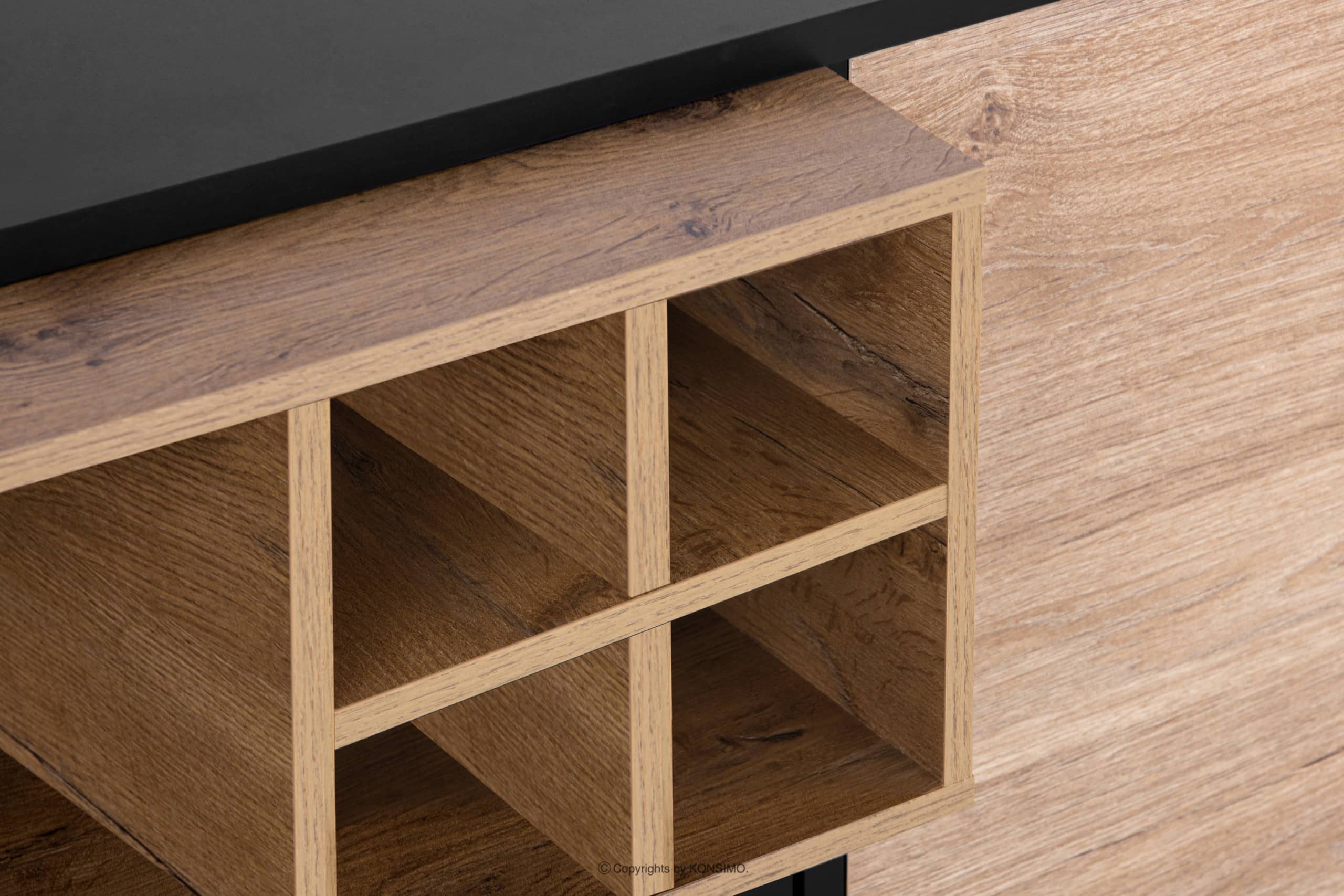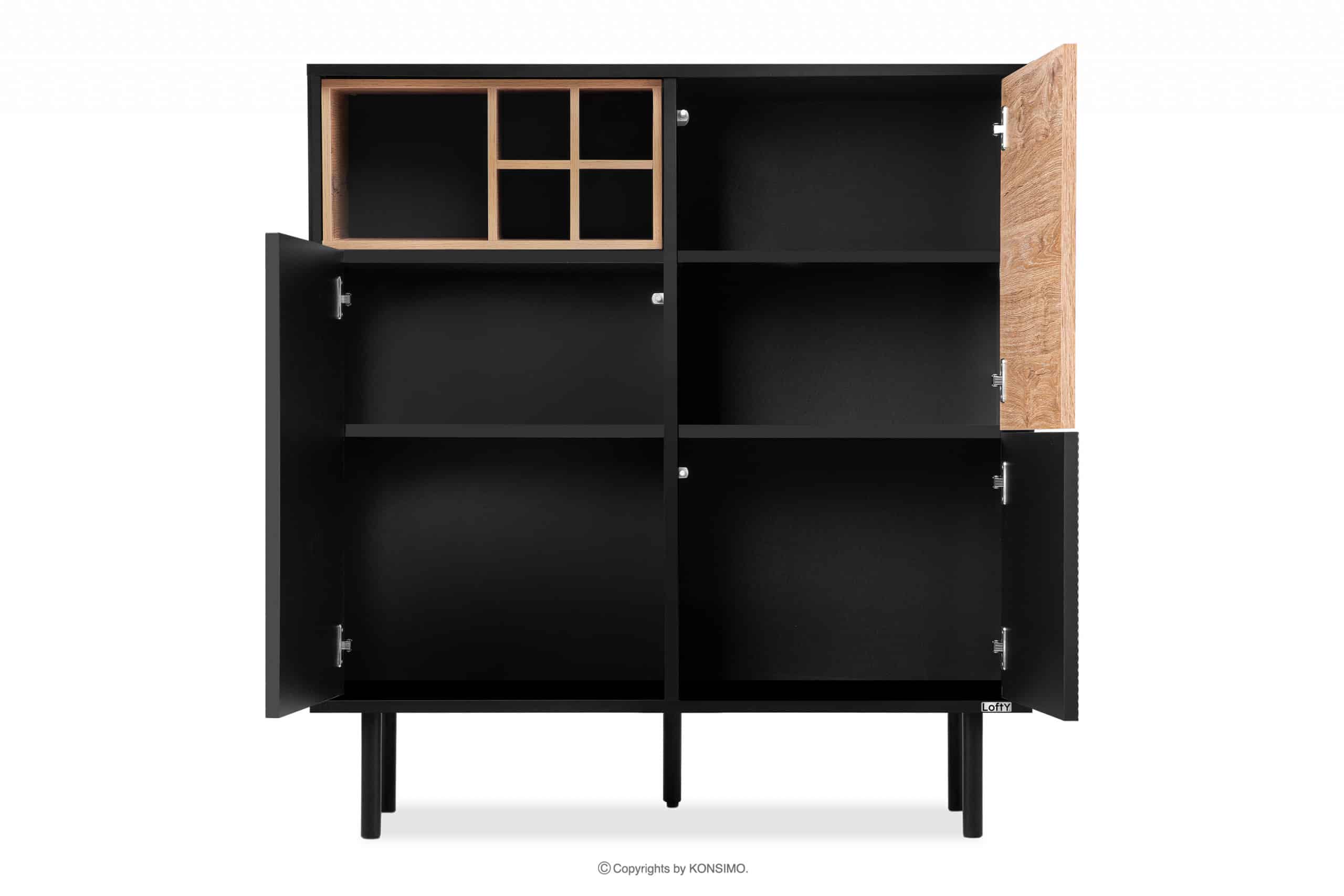 Die Loft-Kommode auf schwarzen hohen Beinen wurde mit außergewöhnlicher Sorgfalt für jedes Detail entworfen. Dank ihrer Konstruktion bietet sie Platz für viele Gegenstände des täglichen Gebrauchs wie Kleidung, Dokumente oder Bücher. Sie verfügt über drei große Schränke und Regale. Dank des push-to-open Türsystems behält die Kommode ihr elegantes Aussehen ohne überflüssigen Schmuck und ist gleichzeitig sehr funktional.
