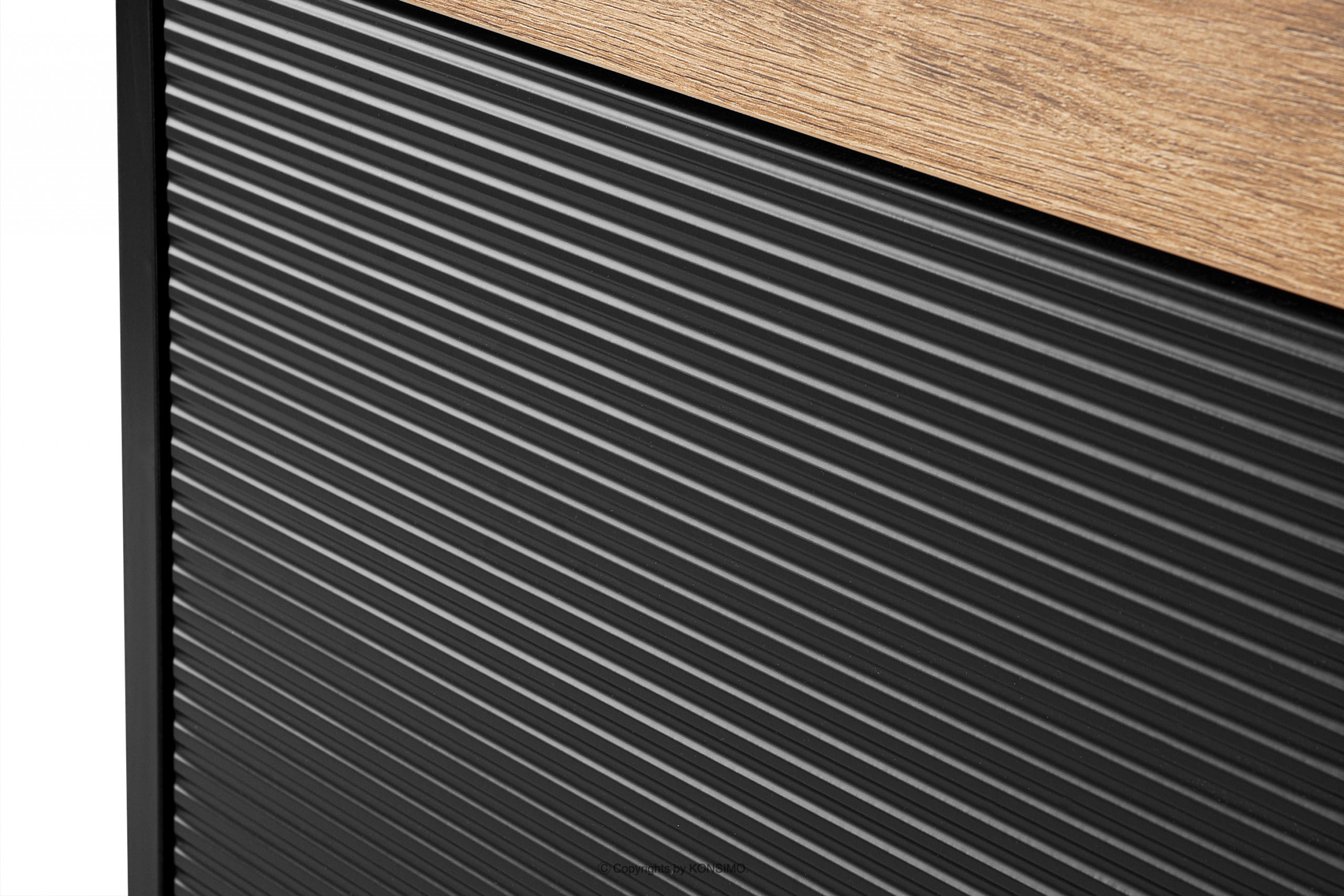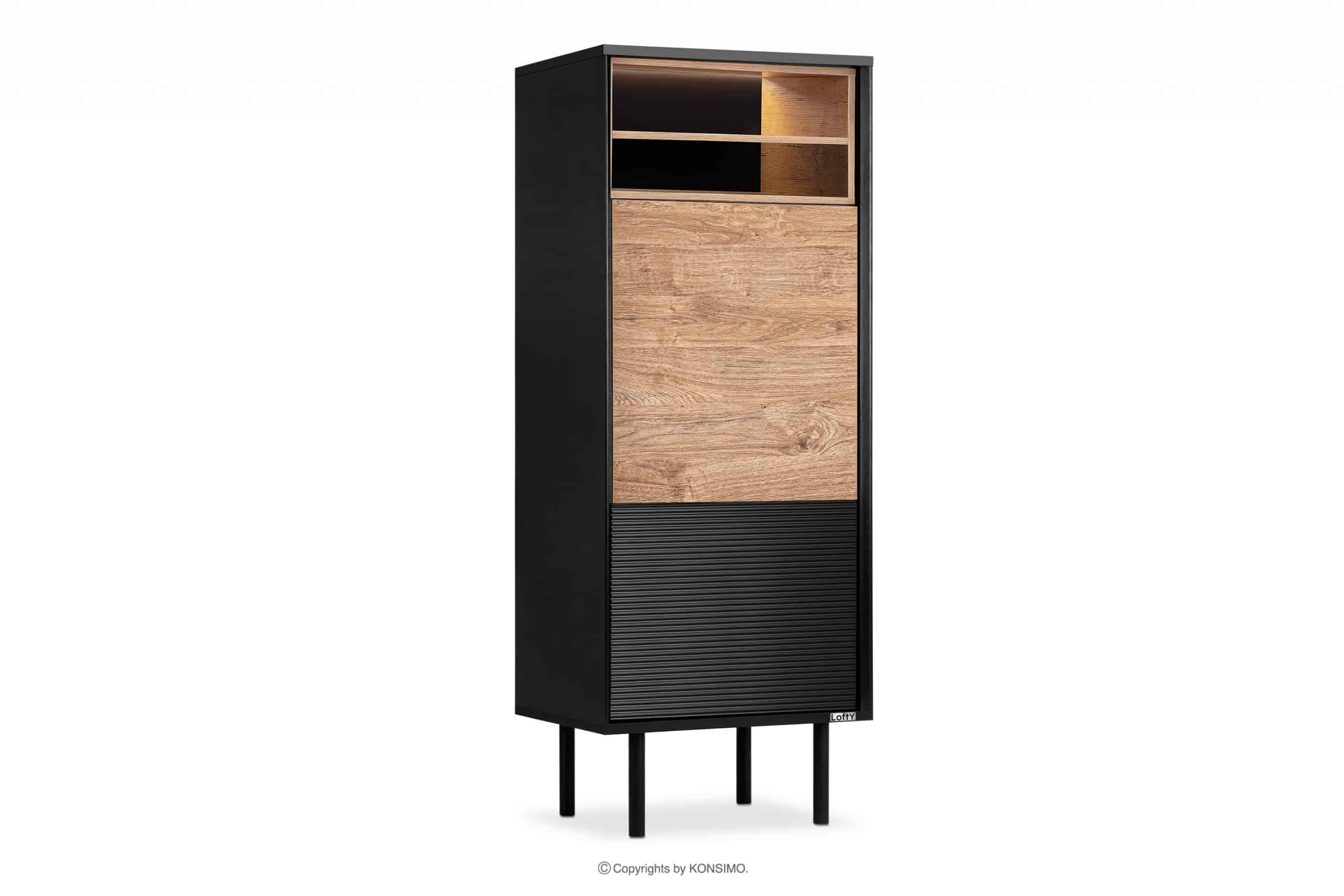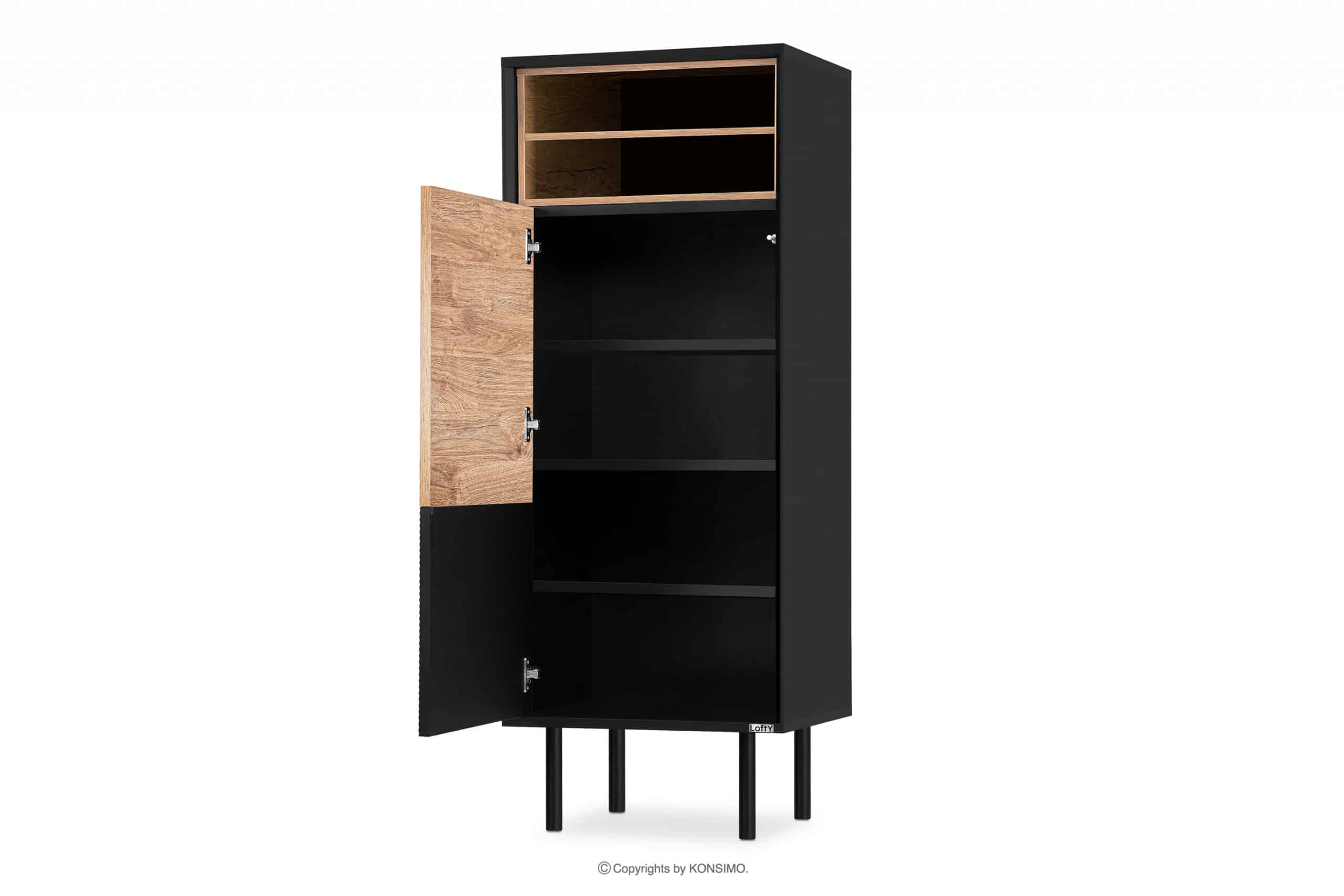 Das Regal mit schwarzer Riffelung wurde mit außergewöhnlicher Sorgfalt für jedes Detail entworfen. Dank seiner Konstruktion kann es viele alltägliche Gegenstände wie Kleidung, Dokumente oder Bücher aufnehmen. Es verfügt über mehrere geräumige Regale. Dank des push-to-open-Systems behält das Regal ein elegantes Aussehen ohne unnötige Griffe und ist dabei sehr funktional. Die Kombination von Schwarz mit laminiertem Eichenholz verleiht dem Raum Wärme und verleiht ihm einen außergewöhnlichen Charakter.