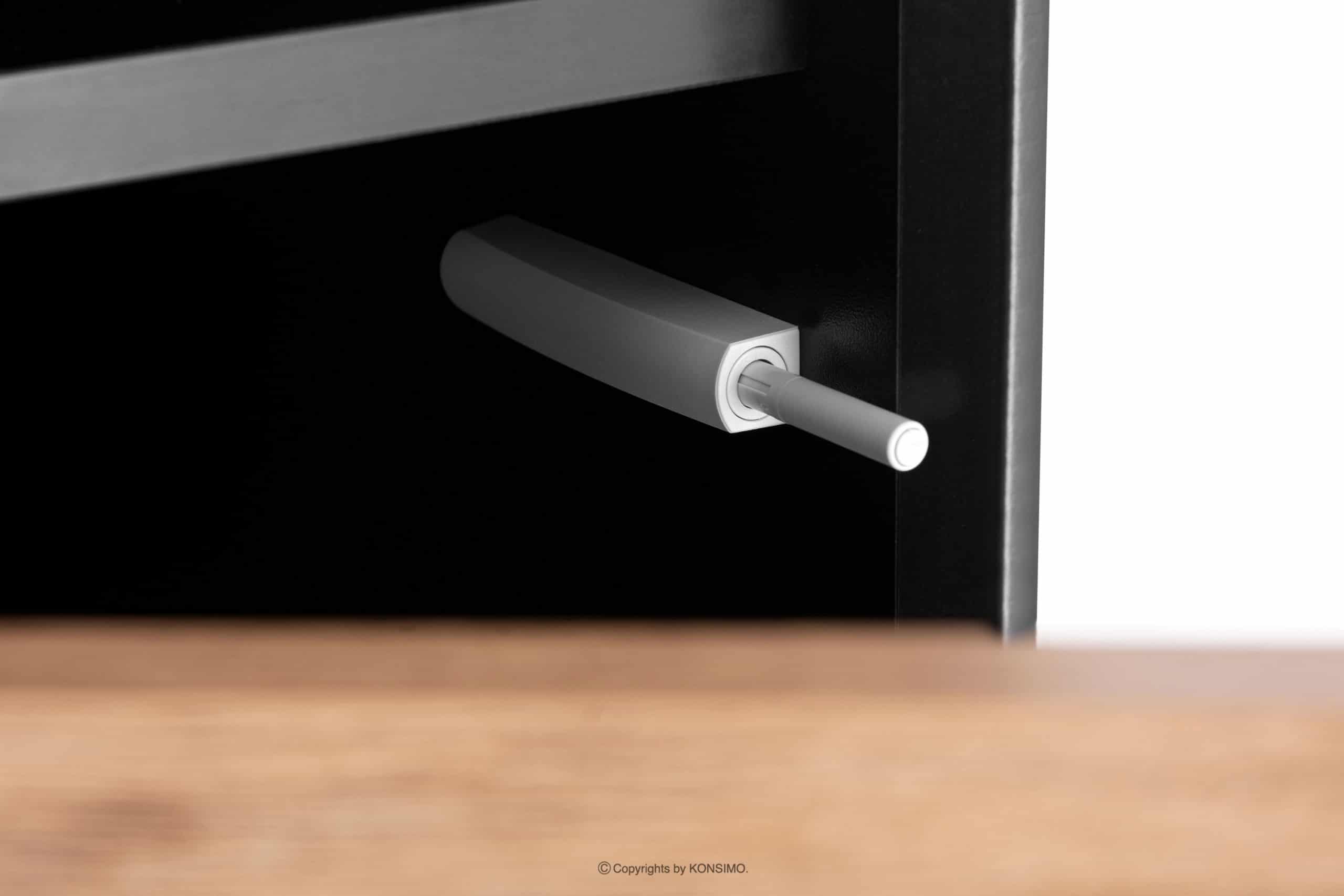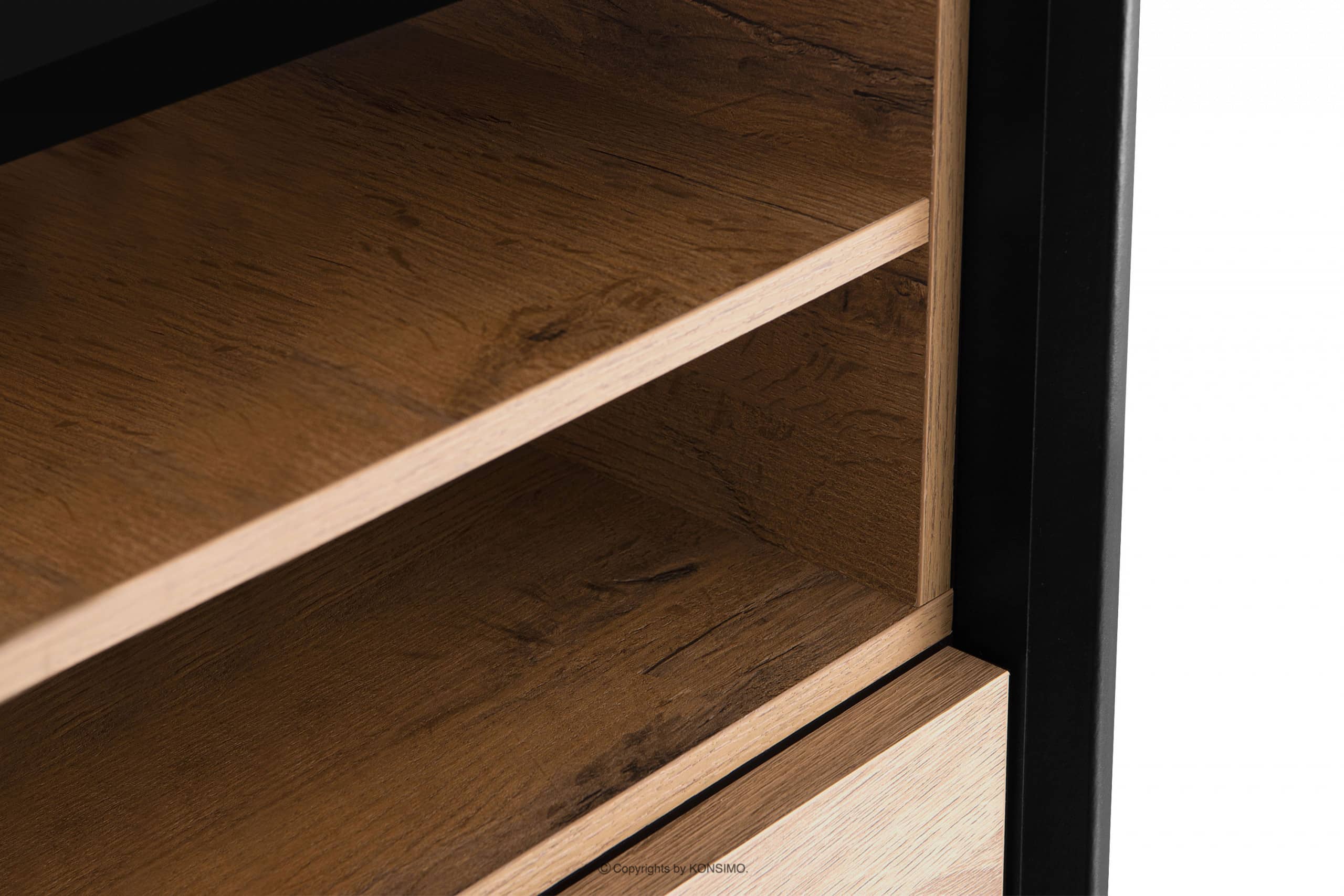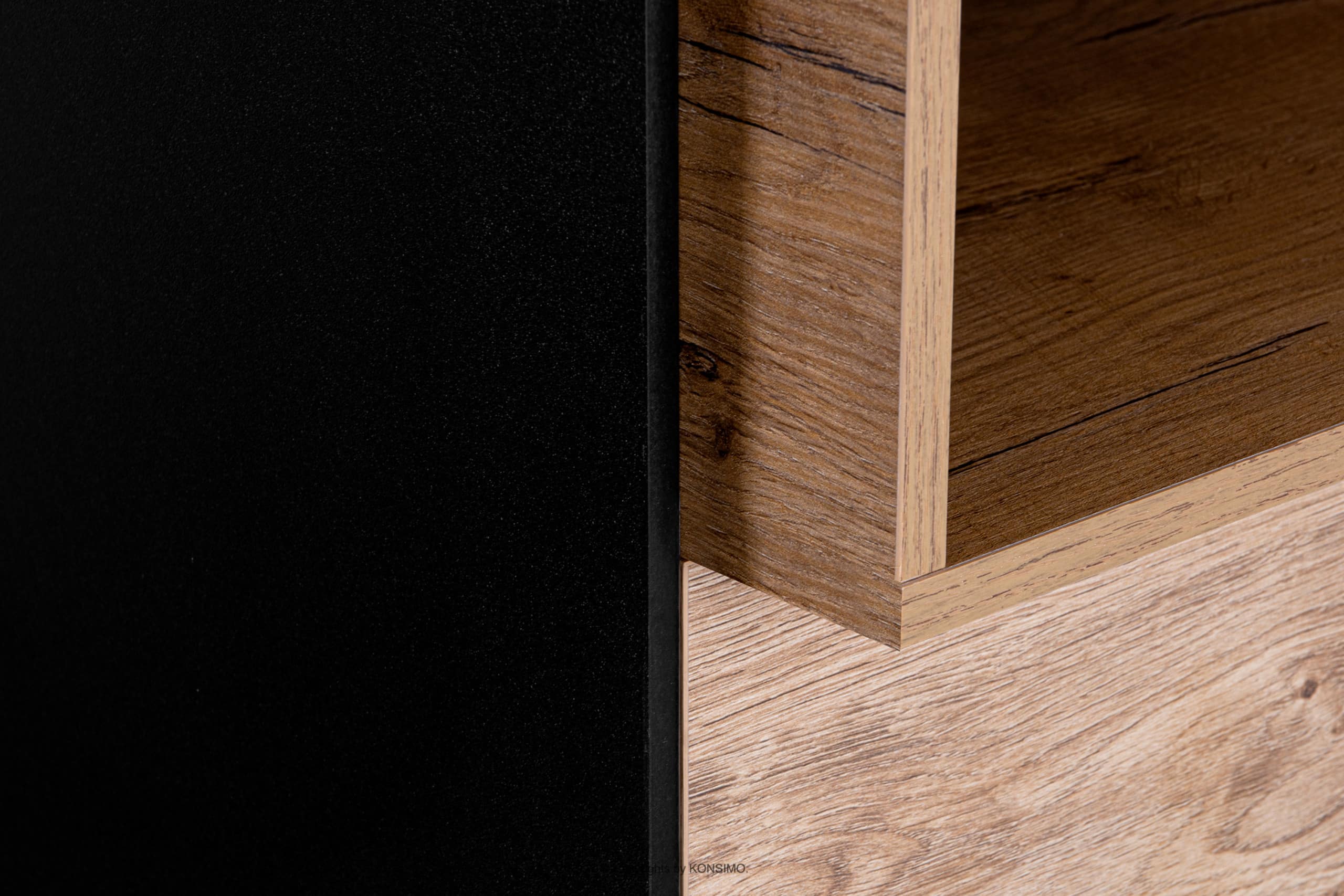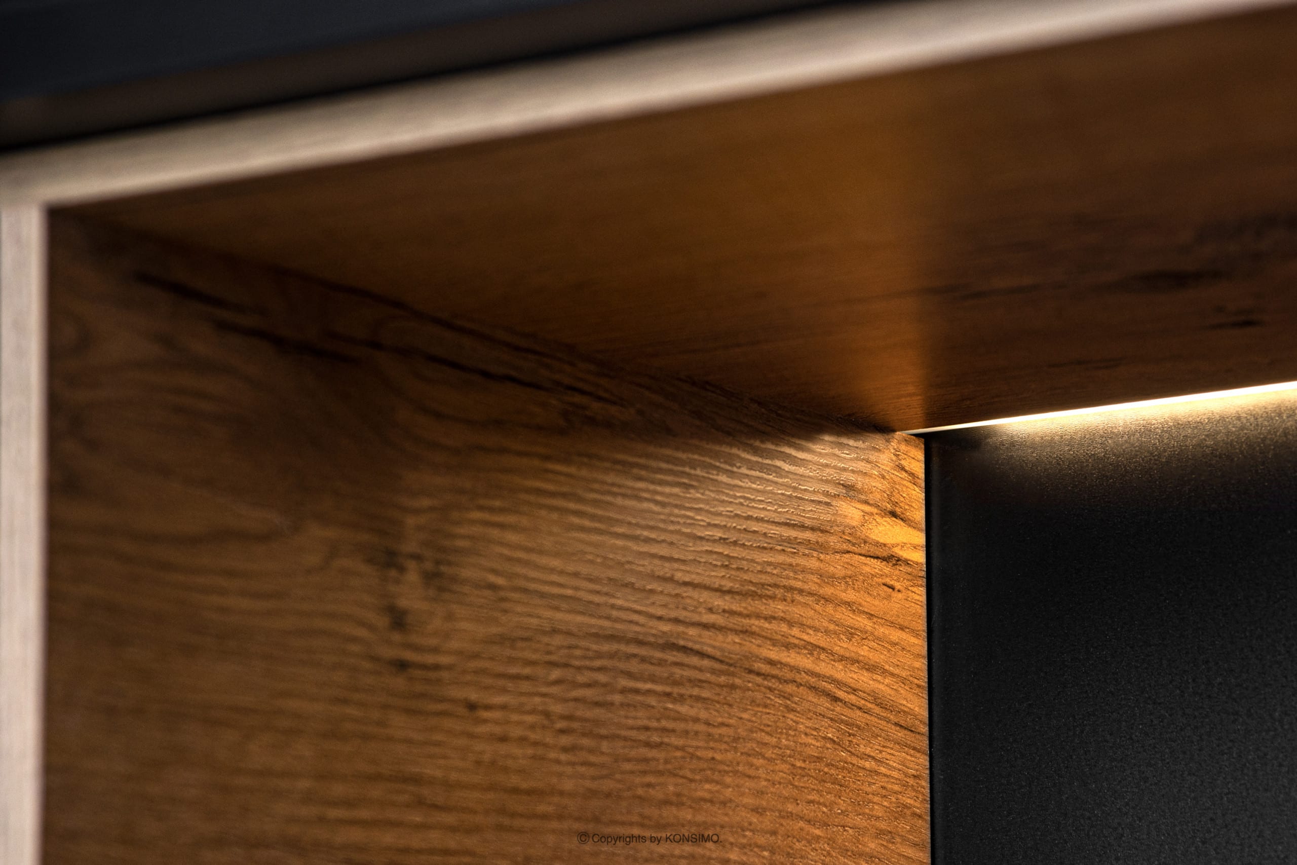 Das Regal mit schwarzer Riffelung wurde mit außergewöhnlicher Sorgfalt für jedes Detail entworfen. Dank seiner Konstruktion kann es viele alltägliche Gegenstände wie Kleidung, Dokumente oder Bücher aufnehmen. Es verfügt über mehrere geräumige Regale. Dank des push-to-open-Systems behält das Regal ein elegantes Aussehen ohne unnötige Griffe und ist dabei sehr funktional. Die Kombination von Schwarz mit laminiertem Eichenholz verleiht dem Raum Wärme und verleiht ihm einen außergewöhnlichen Charakter.