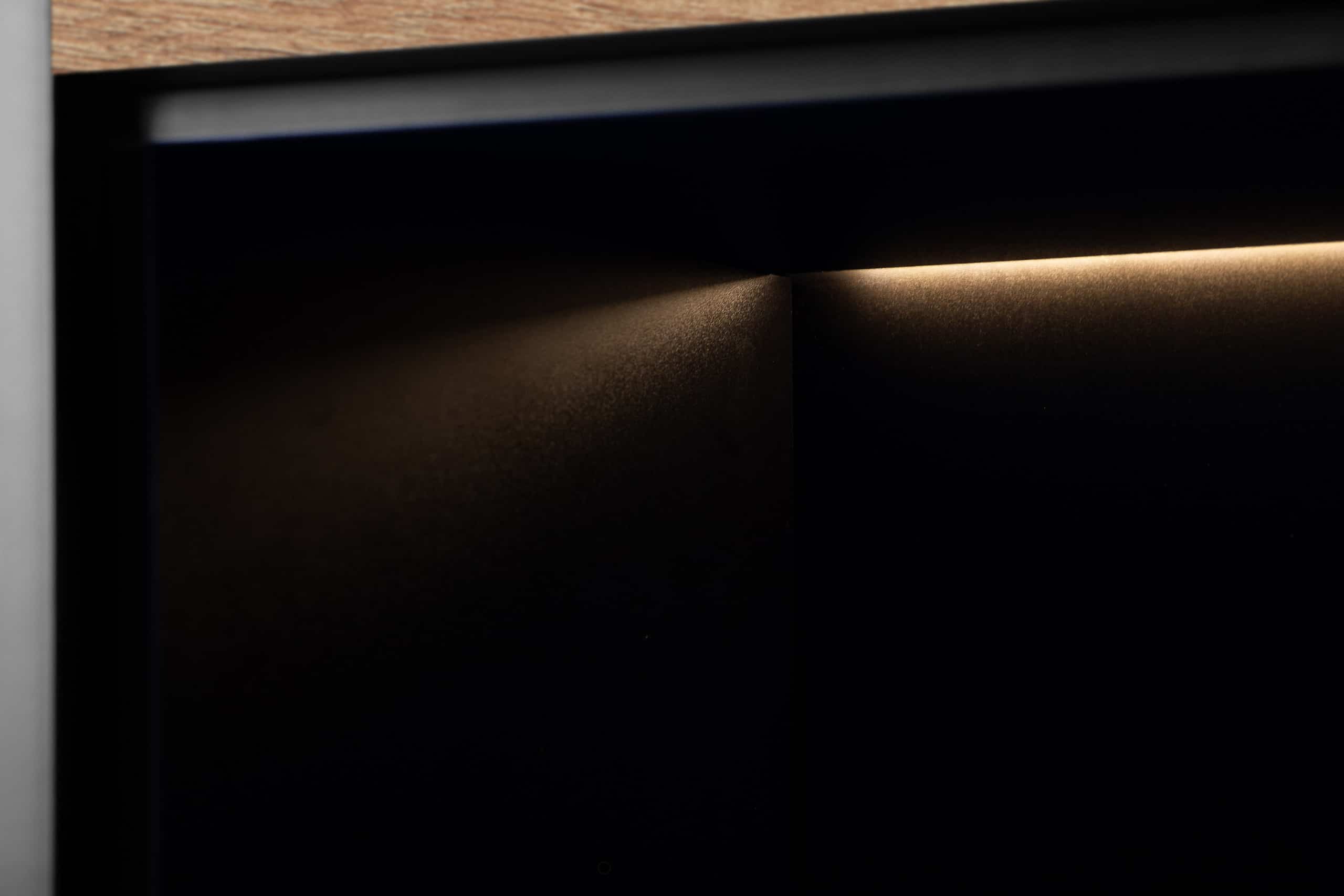 Der Raum mit dem hohen LOFTY-Regal gewinnt durch die Kombination der Farben etwas Wärme. Optional ist LED-Beleuchtung 12607.15.147 erhältlich.