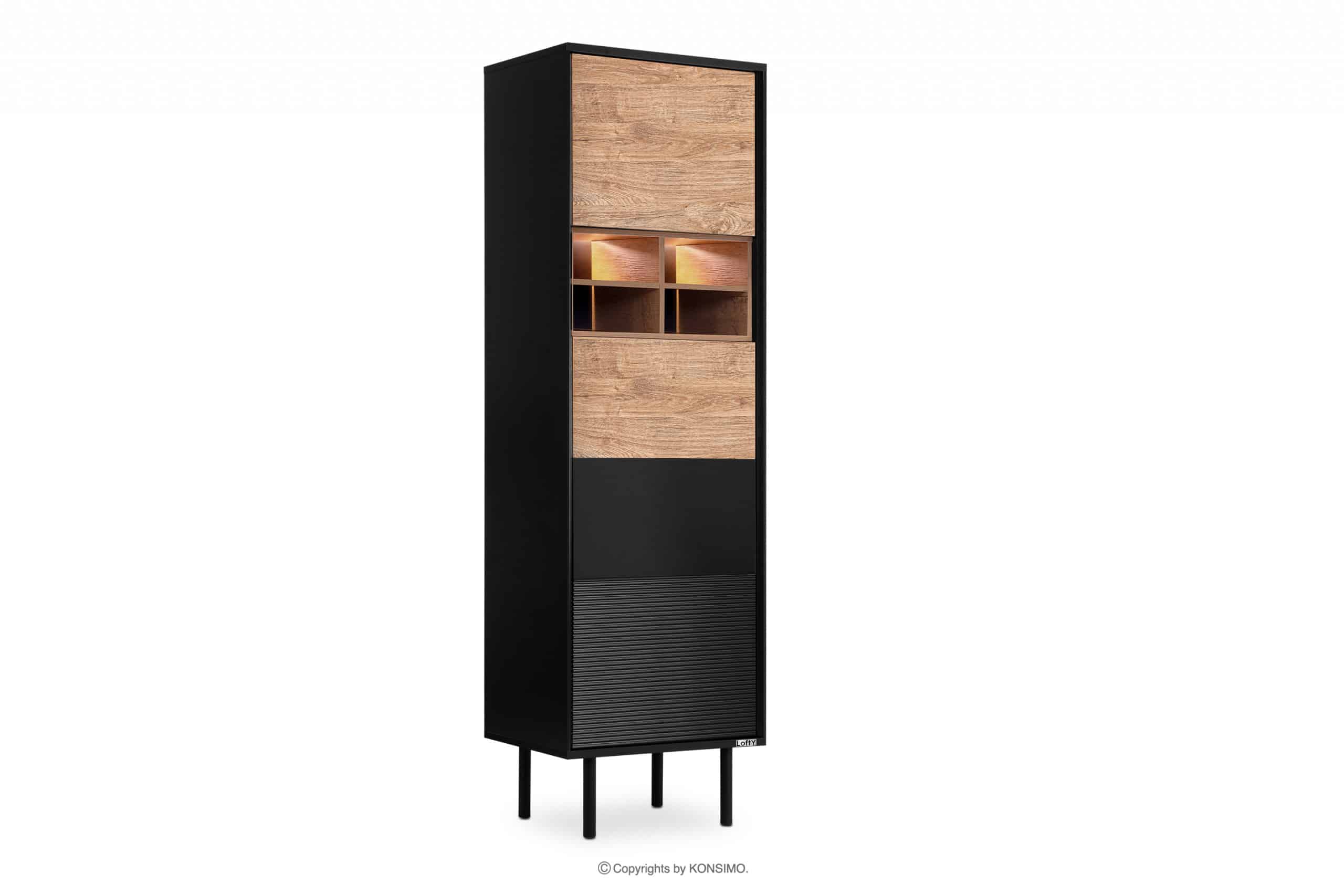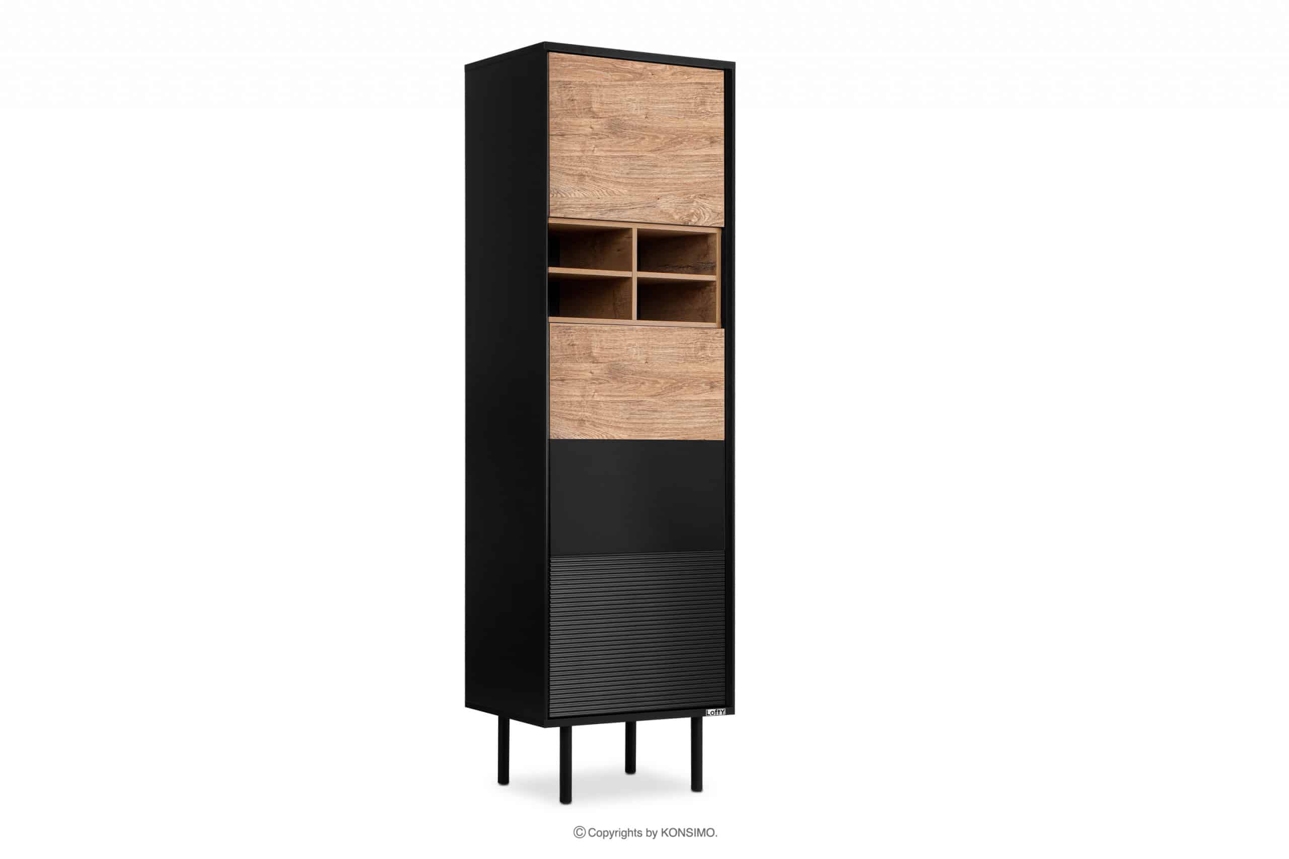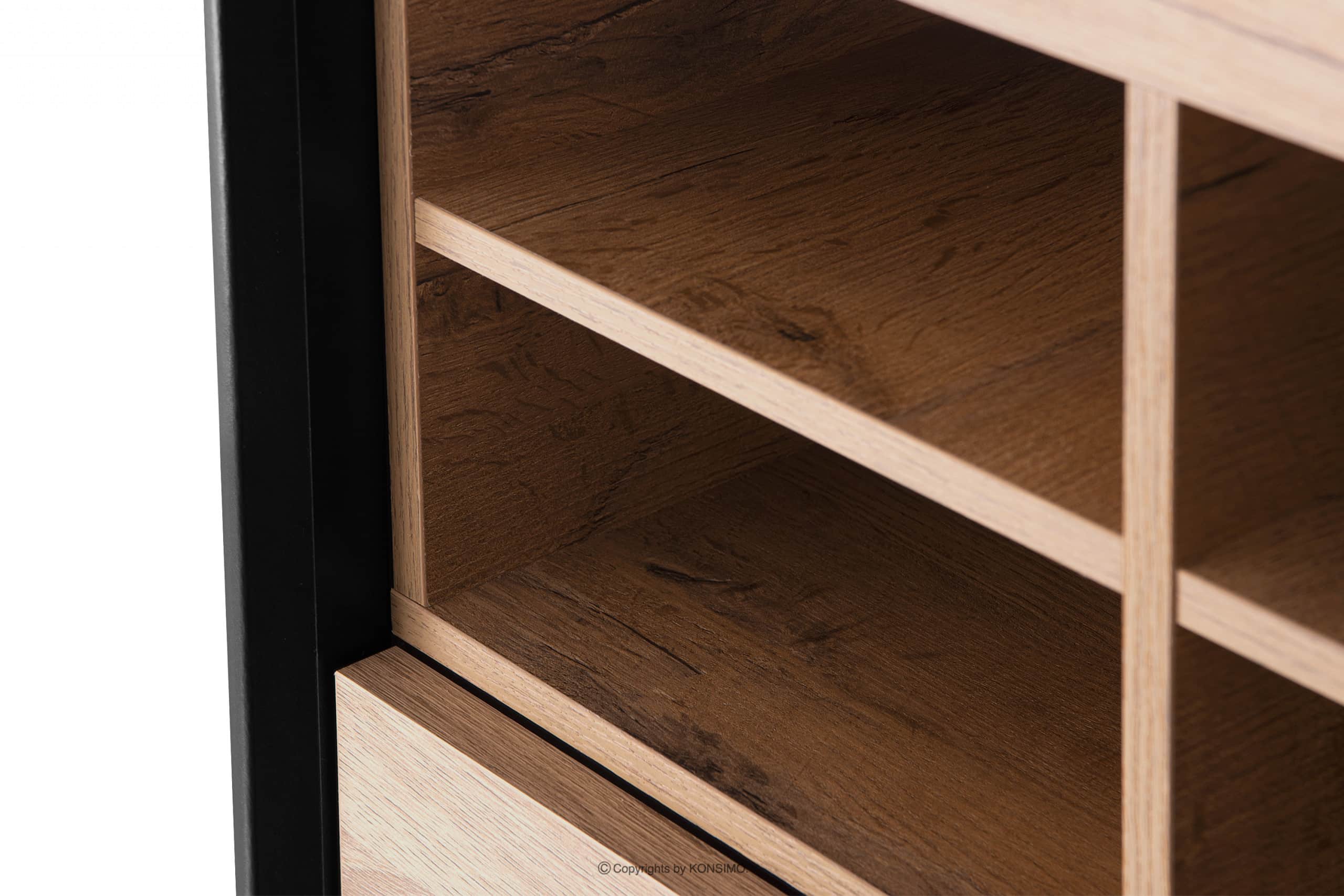 Das industrielle Loft-Regal ist ein Produkt, bei dem viel Wert auf eine hohe Haltbarkeit gelegt wurde. Es verfügt über mehrere Regale zur Aufbewahrung von Alltagsgegenständen. Die Möbel passen gut zu industriellen Innenräumen und die Farbkombinationen in Schwarz und Natur-Eiche passen zu vielen verschiedenen Farbschemata. Die Türen sind mit einem Push-to-Open-System ausgestattet, das sehr funktional ist und dem Regal überflüssigen Schmuck erspart.