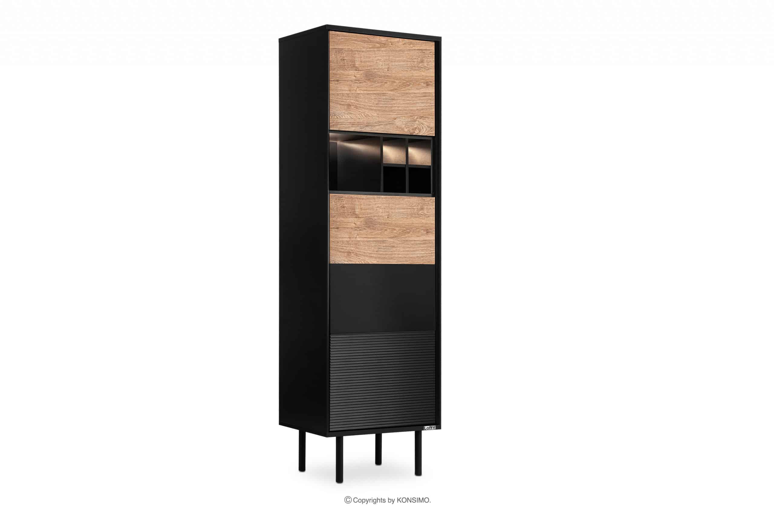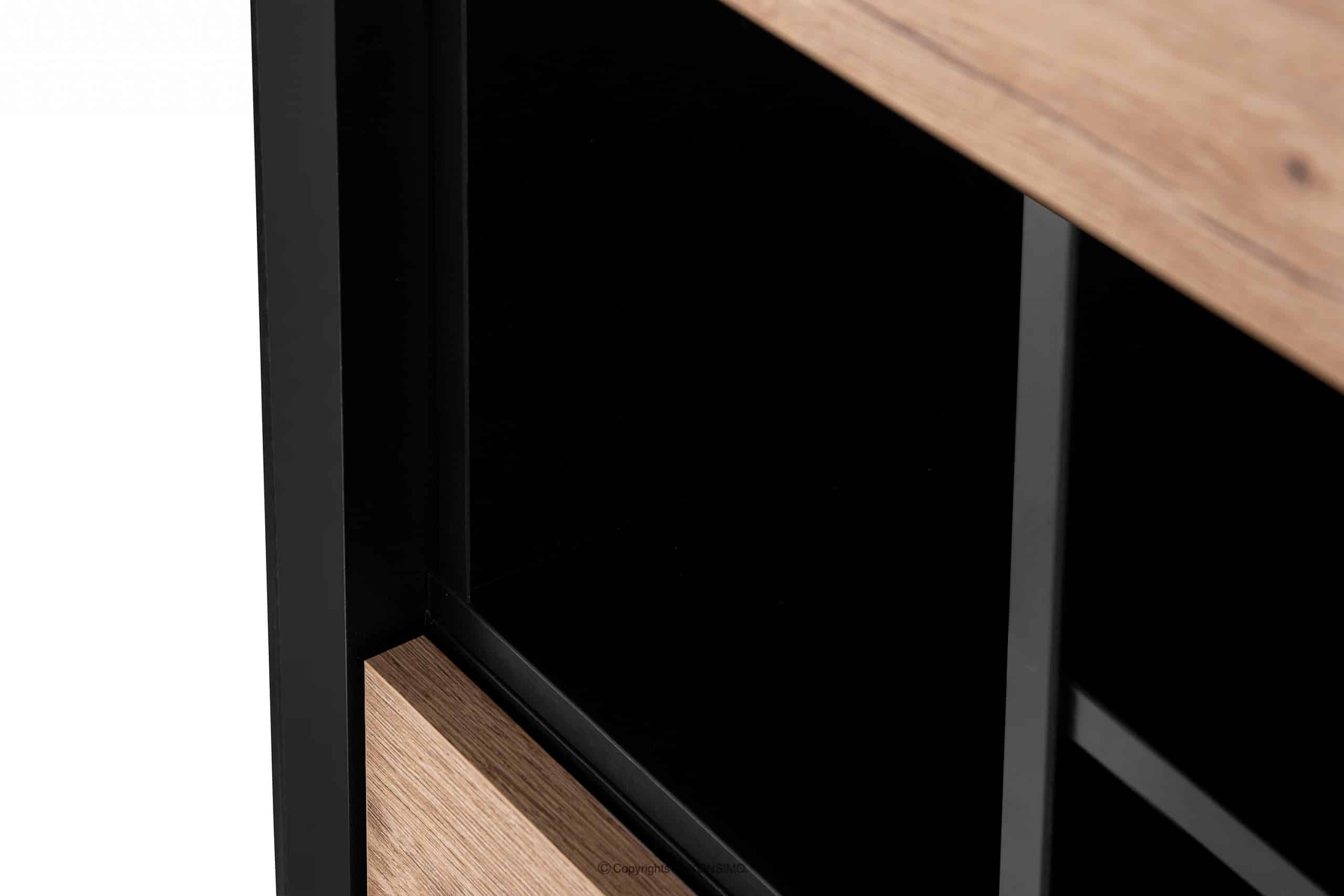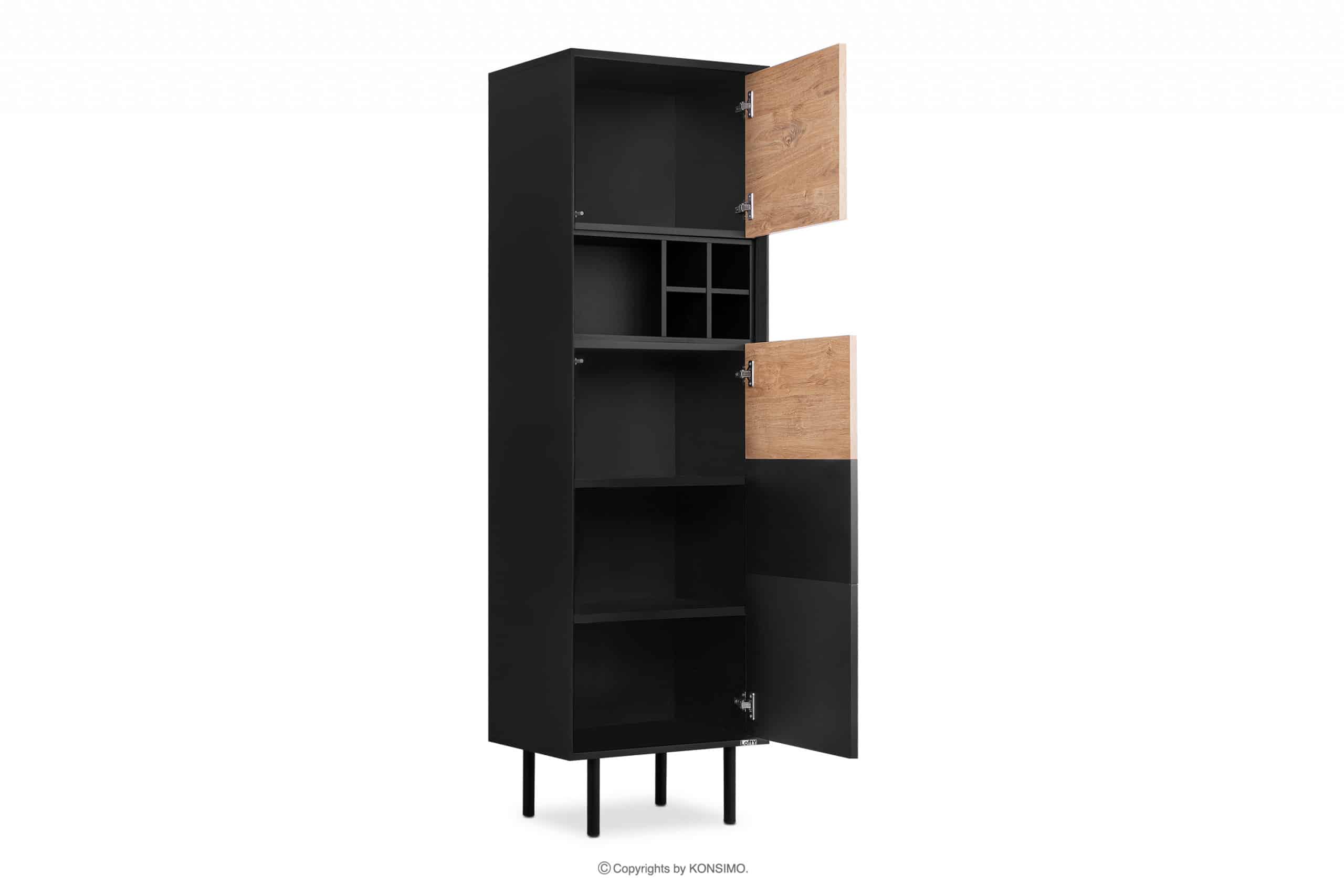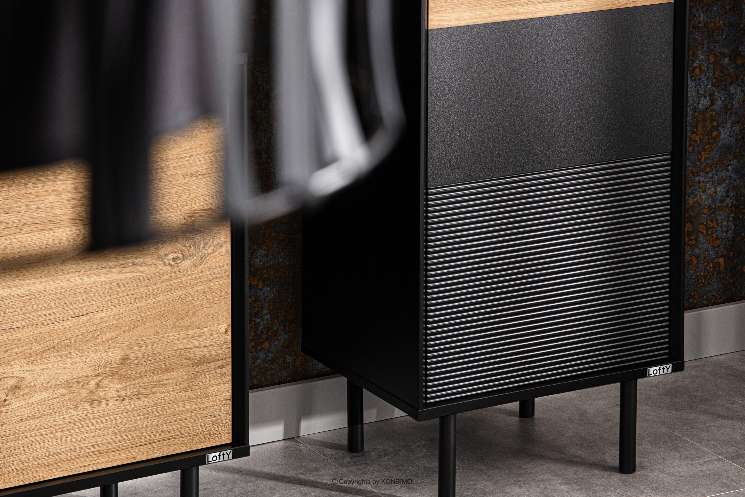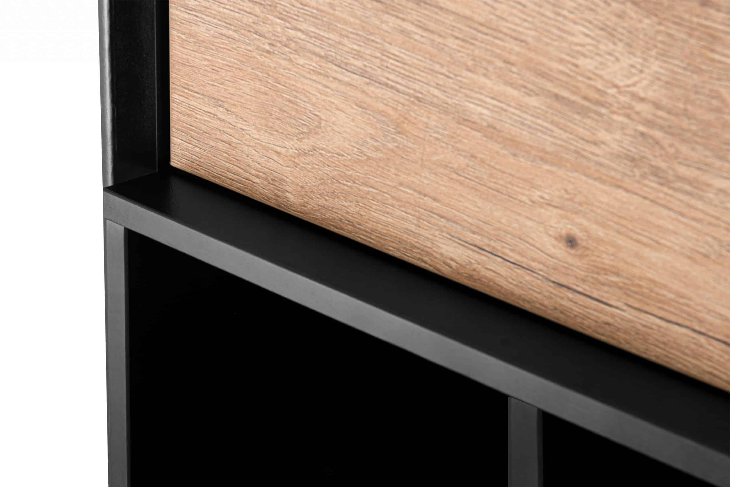 Das Regal Loft mit hohen Beinen ist ein Produkt, bei dem viel Wert auf Haltbarkeit gelegt wurde. Es verfügt über mehrere Regale zur Aufbewahrung von Alltagsgegenständen. Die Möbel passen gut zu industriellen Innenräumen, und die Farben Schwarz und natürliche Eiche passen zu vielen Innenraumfarben. Die Türen sind mit einem Push-to-Open-System ausgestattet, das sehr funktional ist und dem Schrank überflüssige Verzierungen nimmt.