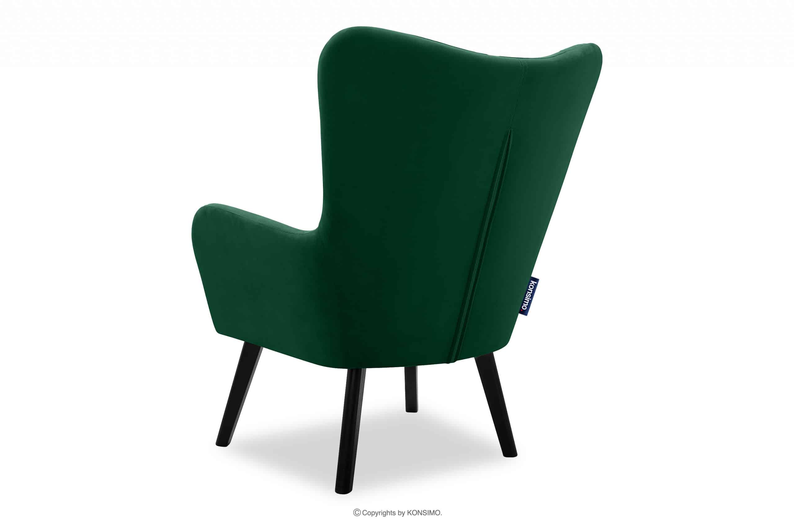 Ein stilvoller und komfortabler Sessel wird eine ideale Ergänzung für das gemütliche Wohnzimmer oder das elegante Schlafzimmer sein. Das ungewöhnliche Design erinnert an den skandinavischen und Retro-Stil und ermöglicht in Kombination mit lebendigen Farben eine interessante Gestaltung. Die Ohrensessel-Form ist eine echte zeitlose Klassik, die sich in jedem Raum bewährt. Der dunkelgrüne skandinavische Sessel aus Samt wird besonders den Liebhabern von bequemer Entspannung gefallen.
