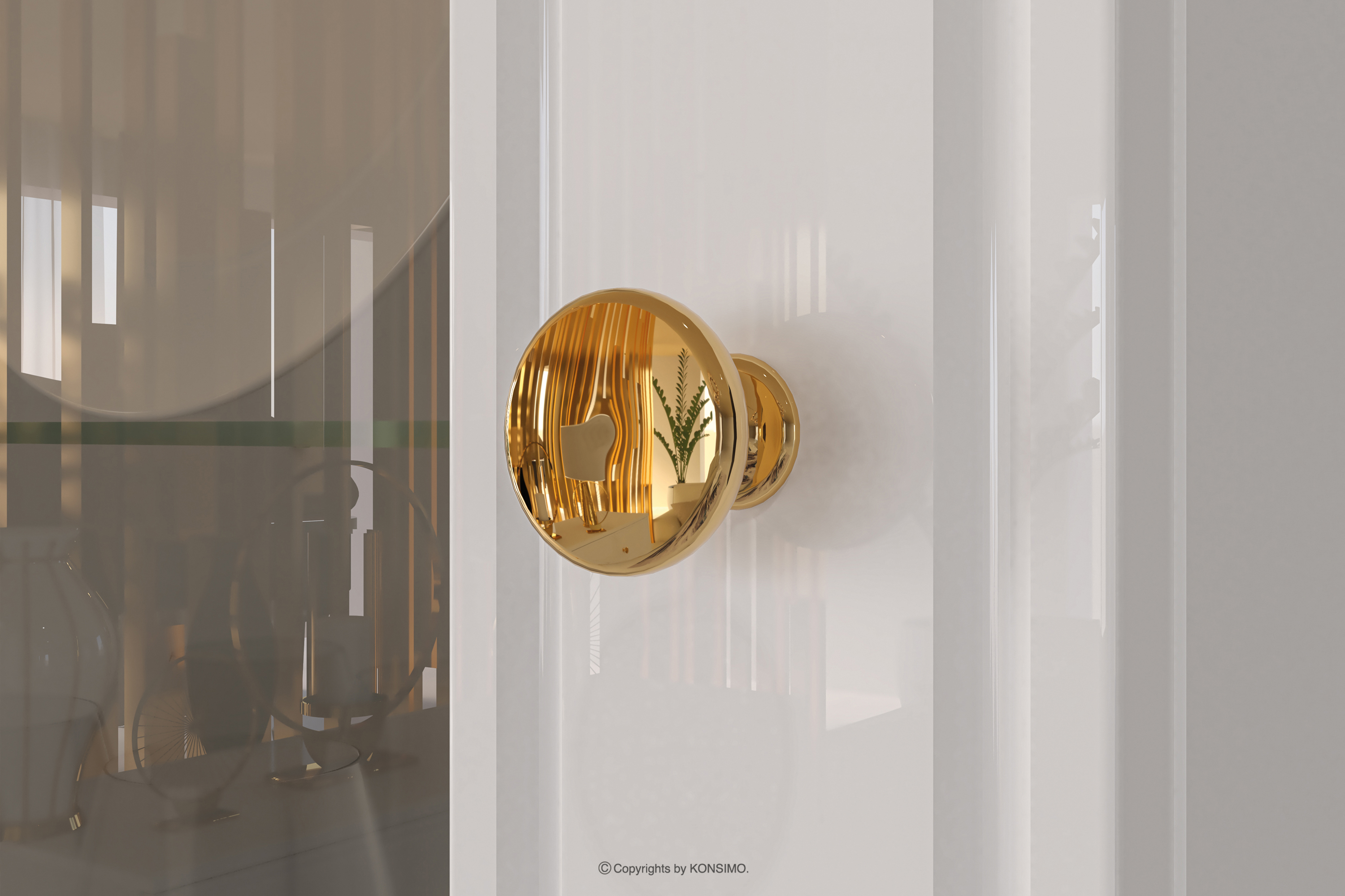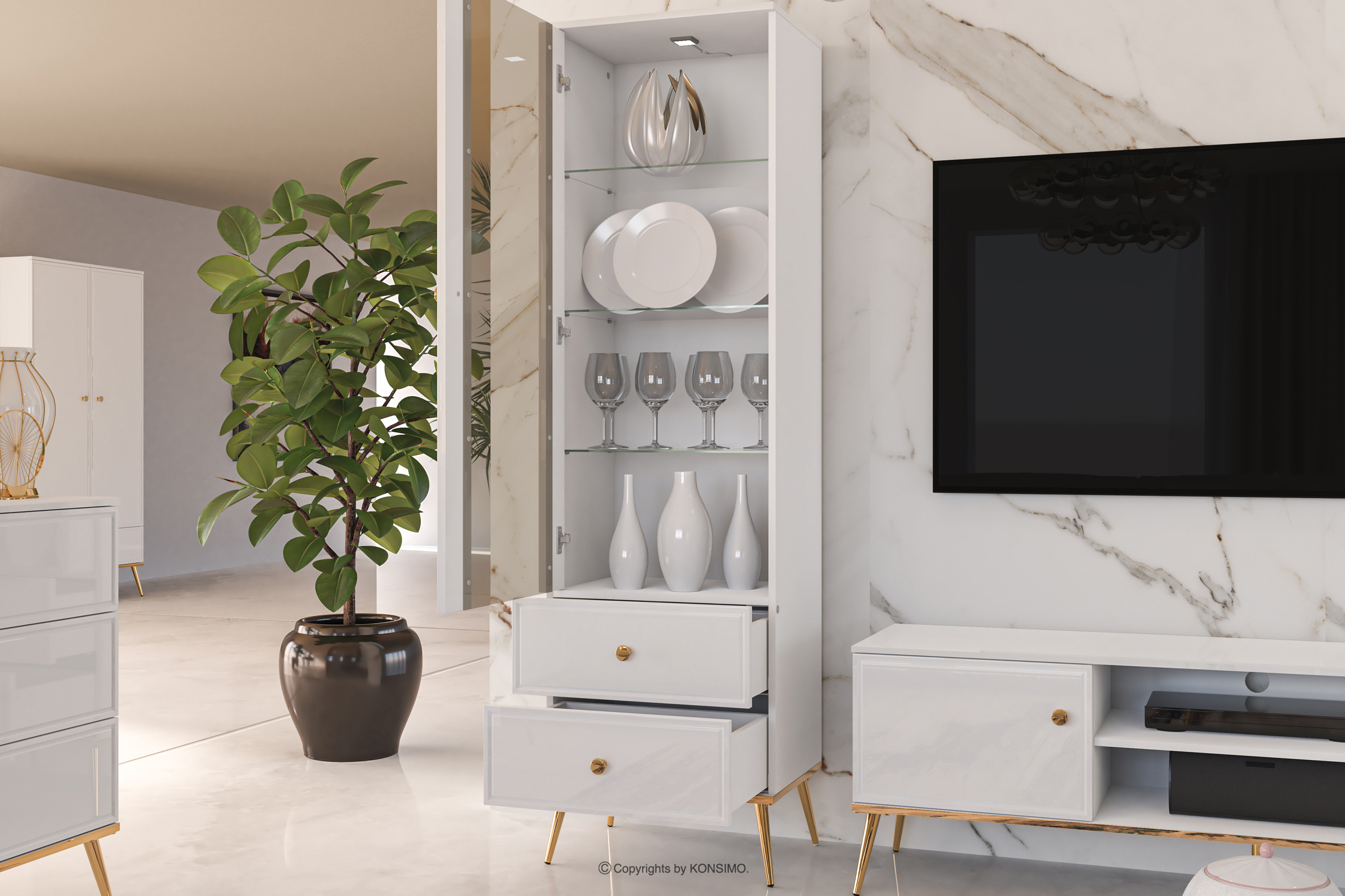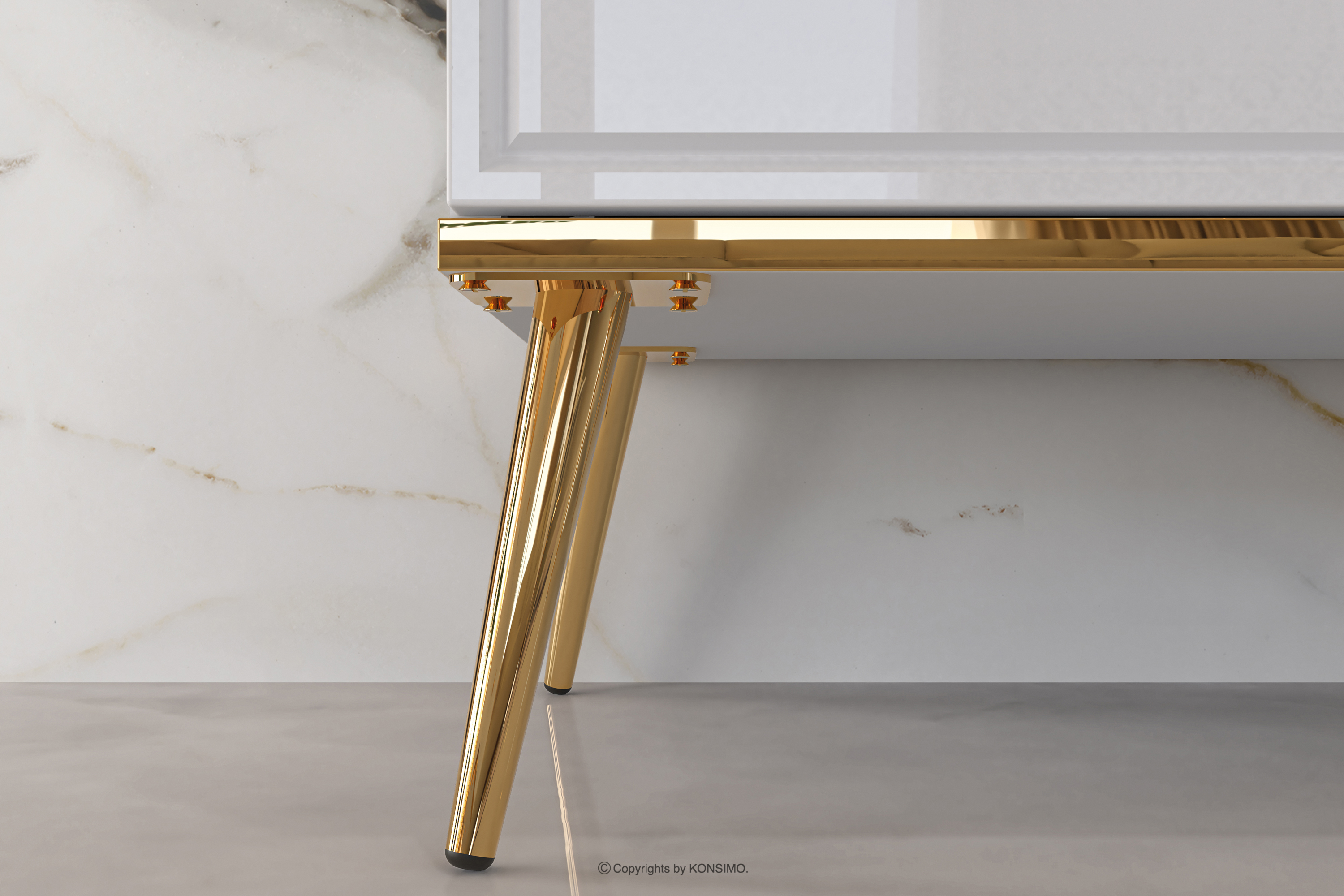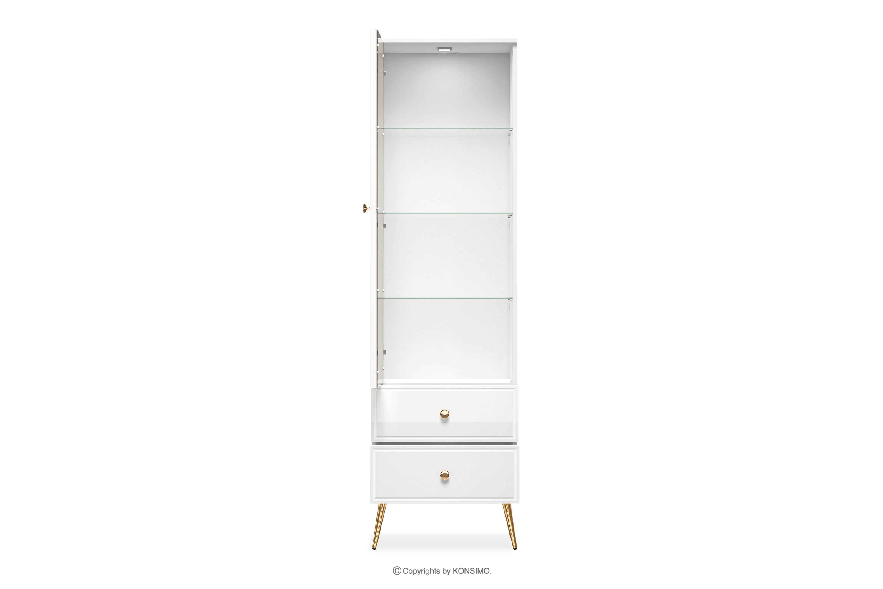 Die elegante Hochglanzvitrine auf hohen Beinen bringt einen Hauch von Eleganz in Ihr Zuhause. Für alle, die nicht nur Wert auf Stil, sondern auch auf Solidität legen, ist der Korpus aus laminierter Platte/MDF eine sichere Grundlage für jede Einrichtung. Der Hochglanz verleiht ihm einen unverwechselbaren Glanz, während die goldenen konischen Beine und Griffe wie das Tüpfelchen auf dem "i" wirken.