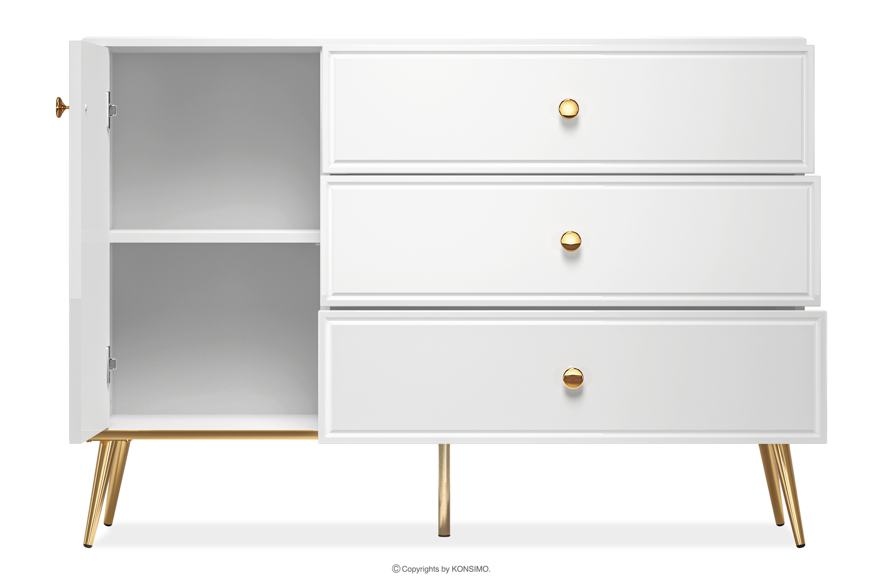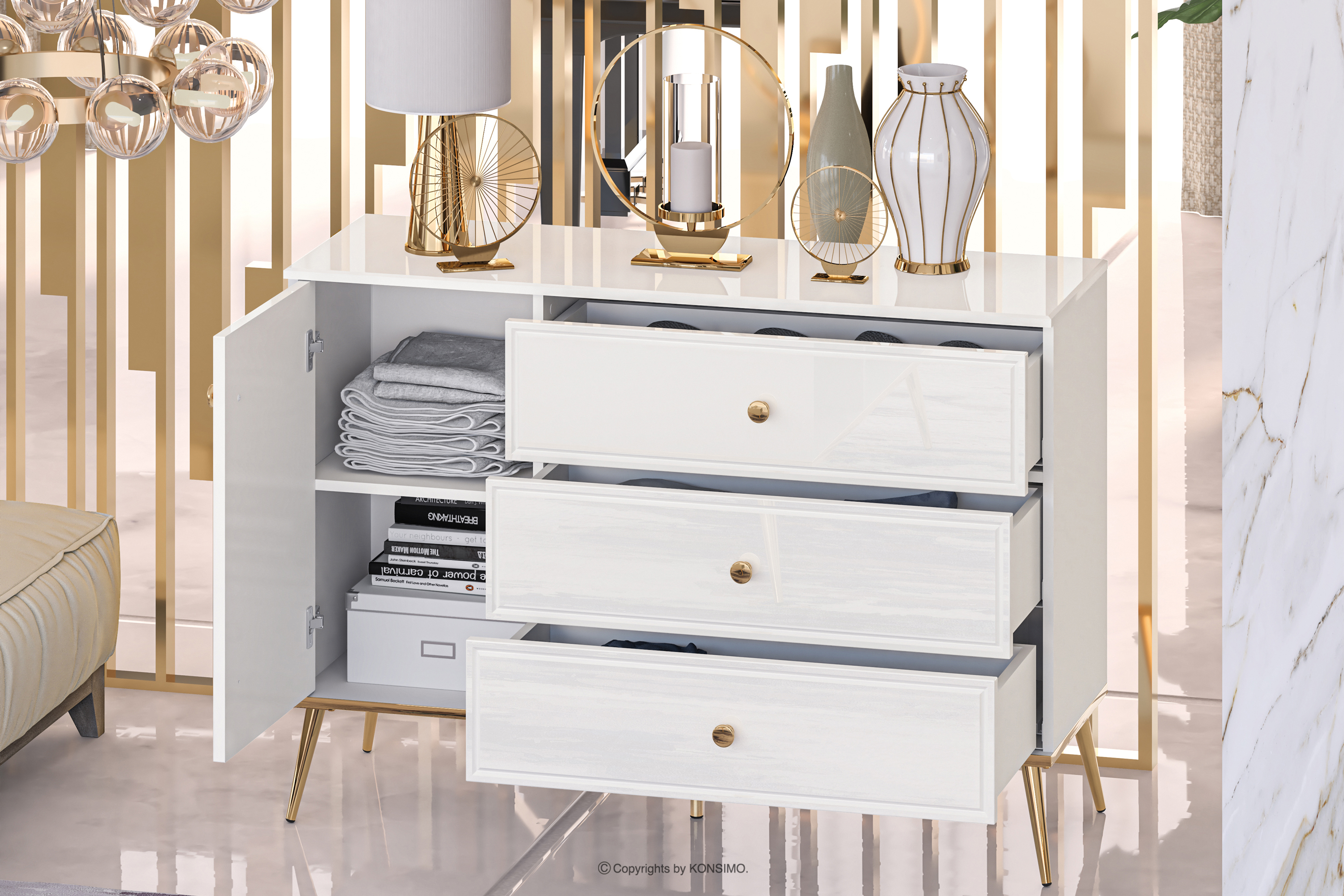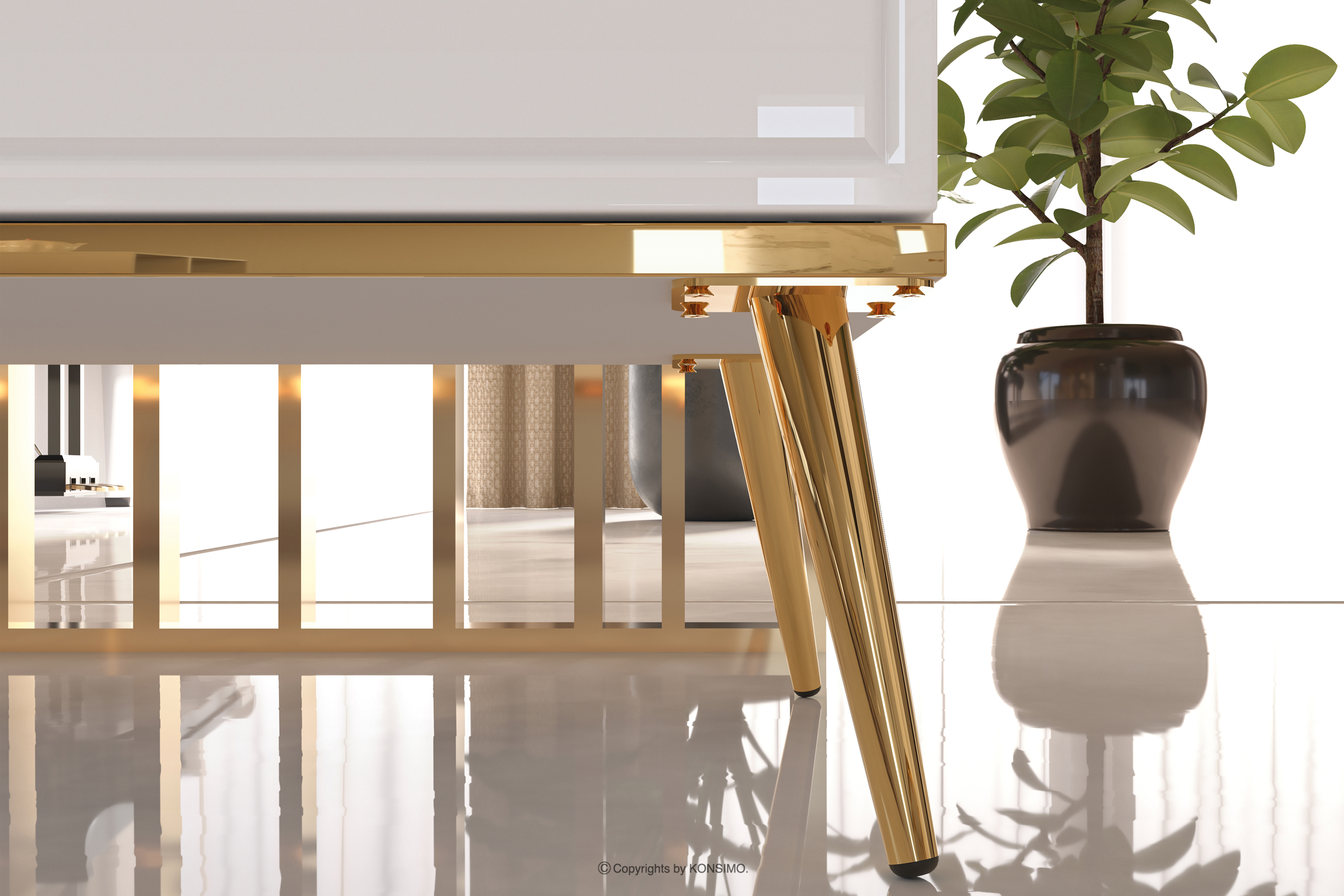 Die elegante Hochglanzkommode auf hohen Beinen bringt einen Hauch von Eleganz in Ihr Zuhause. Der Korpus aus laminierter Platte/MDF ist nicht nur stilvoll, sondern auch solide und bildet eine sichere Grundlage für jede Einrichtung. Der Hochglanz verleiht ihm einen unverwechselbaren Glanz, während die konischen Beine und Griffe in Gold wie ein Tüpfelchen auf dem "i" wirken.