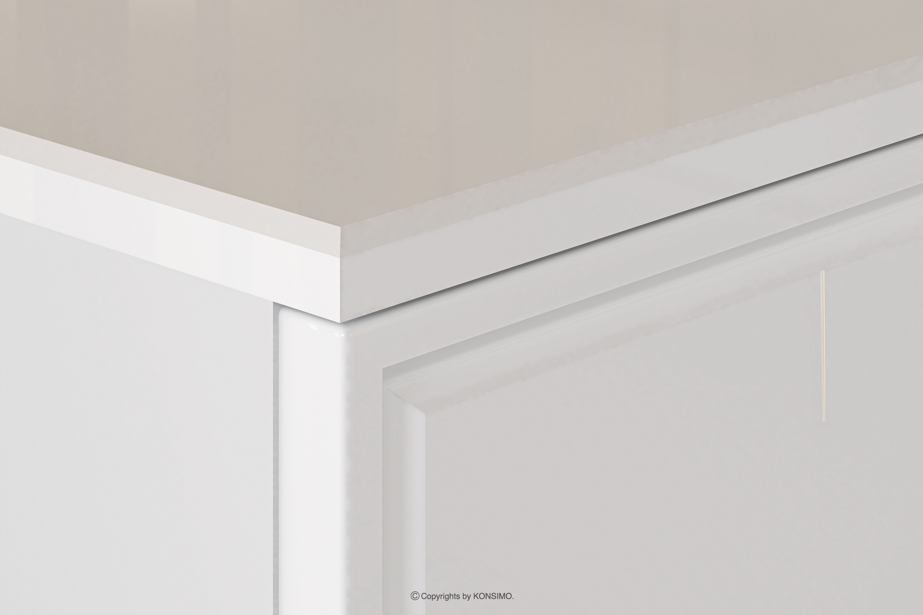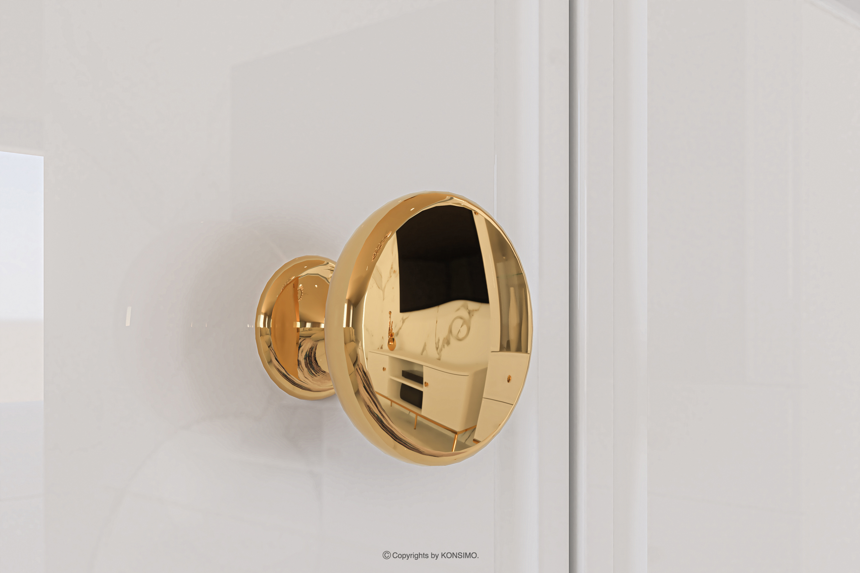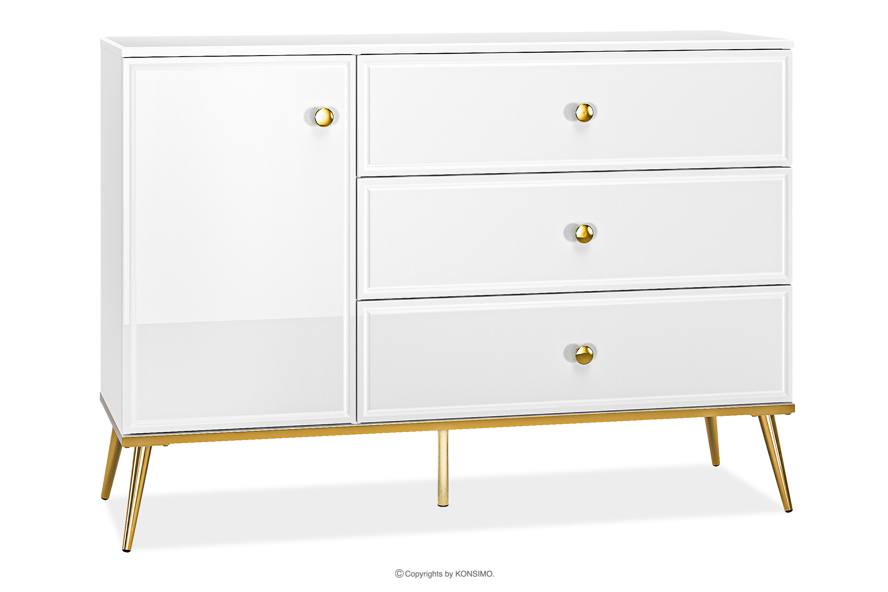 Die elegante Hochglanzkommode auf hohen Beinen bringt einen Hauch von Eleganz in Ihr Zuhause. Der Korpus aus laminierter Platte/MDF ist nicht nur stilvoll, sondern auch solide und bildet eine sichere Grundlage für jede Einrichtung. Der Hochglanz verleiht ihm einen unverwechselbaren Glanz, während die konischen Beine und Griffe in Gold wie ein Tüpfelchen auf dem "i" wirken.