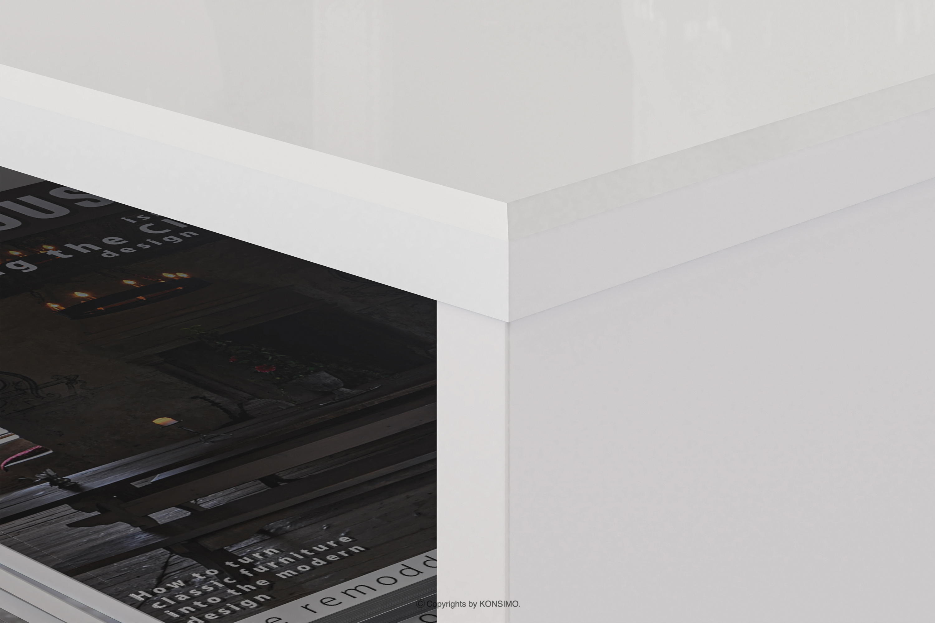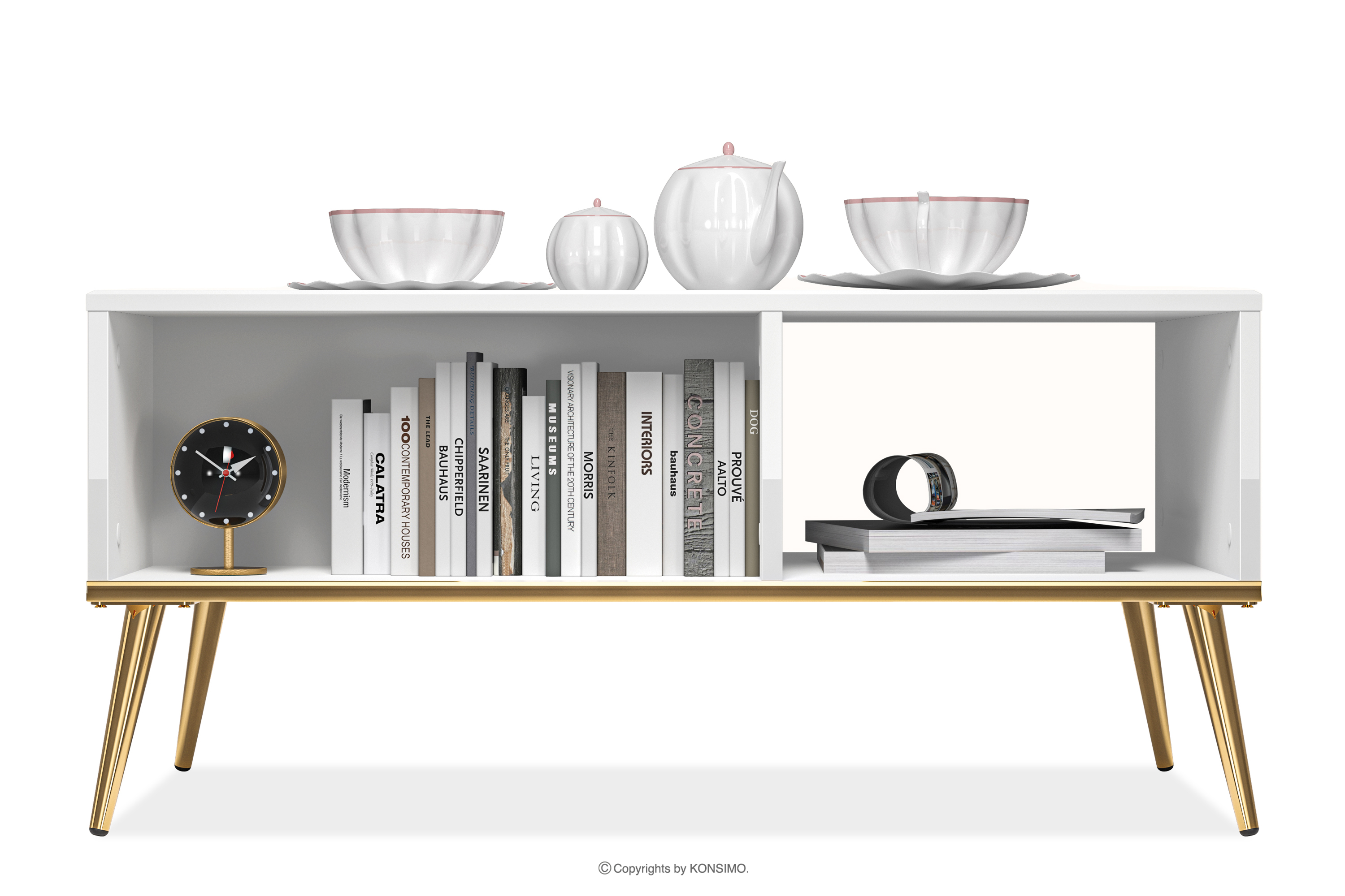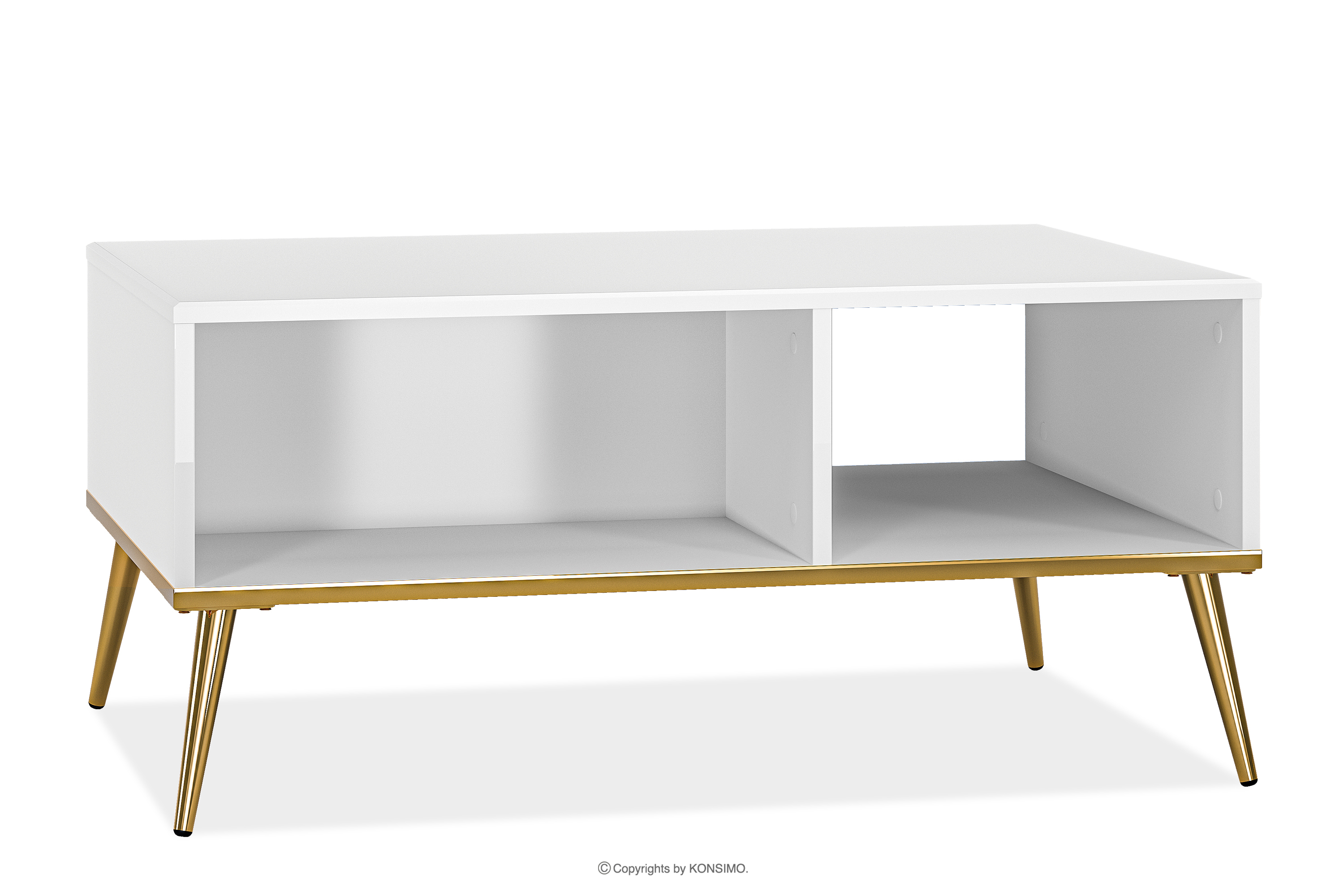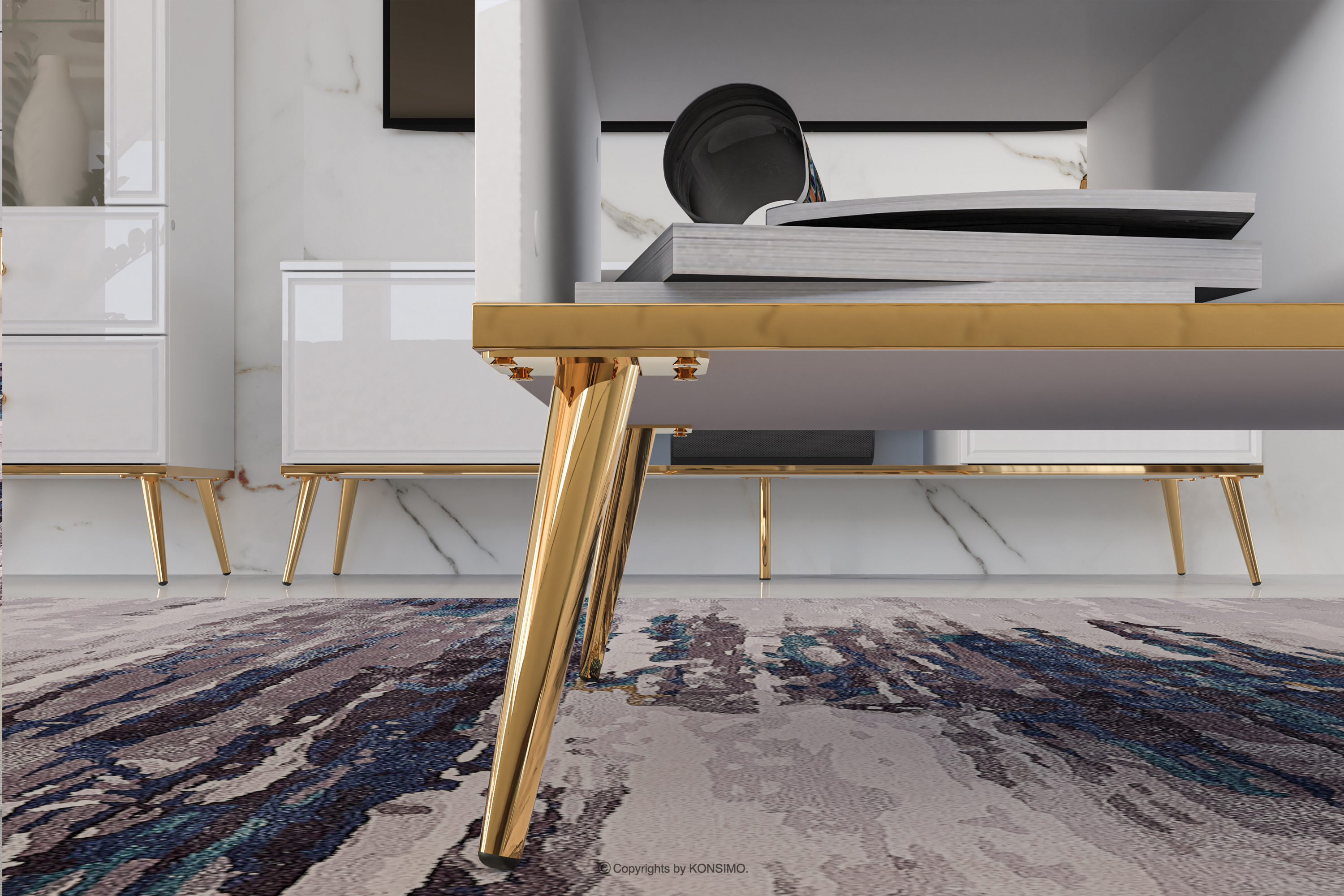 Der elegante, glänzende Couchtisch auf hohen Beinen bringt Eleganz in Ihr Zuhause. Der Korpus aus laminierter Platte/MDF ist nicht nur stilvoll, sondern auch solide und bildet eine sichere Grundlage für jede Einrichtung. Der Hochglanz verleiht ihm einen unverwechselbaren Glanz, während die konischen Beine und Griffe in Gold wie ein Tüpfelchen auf dem "i" wirken.