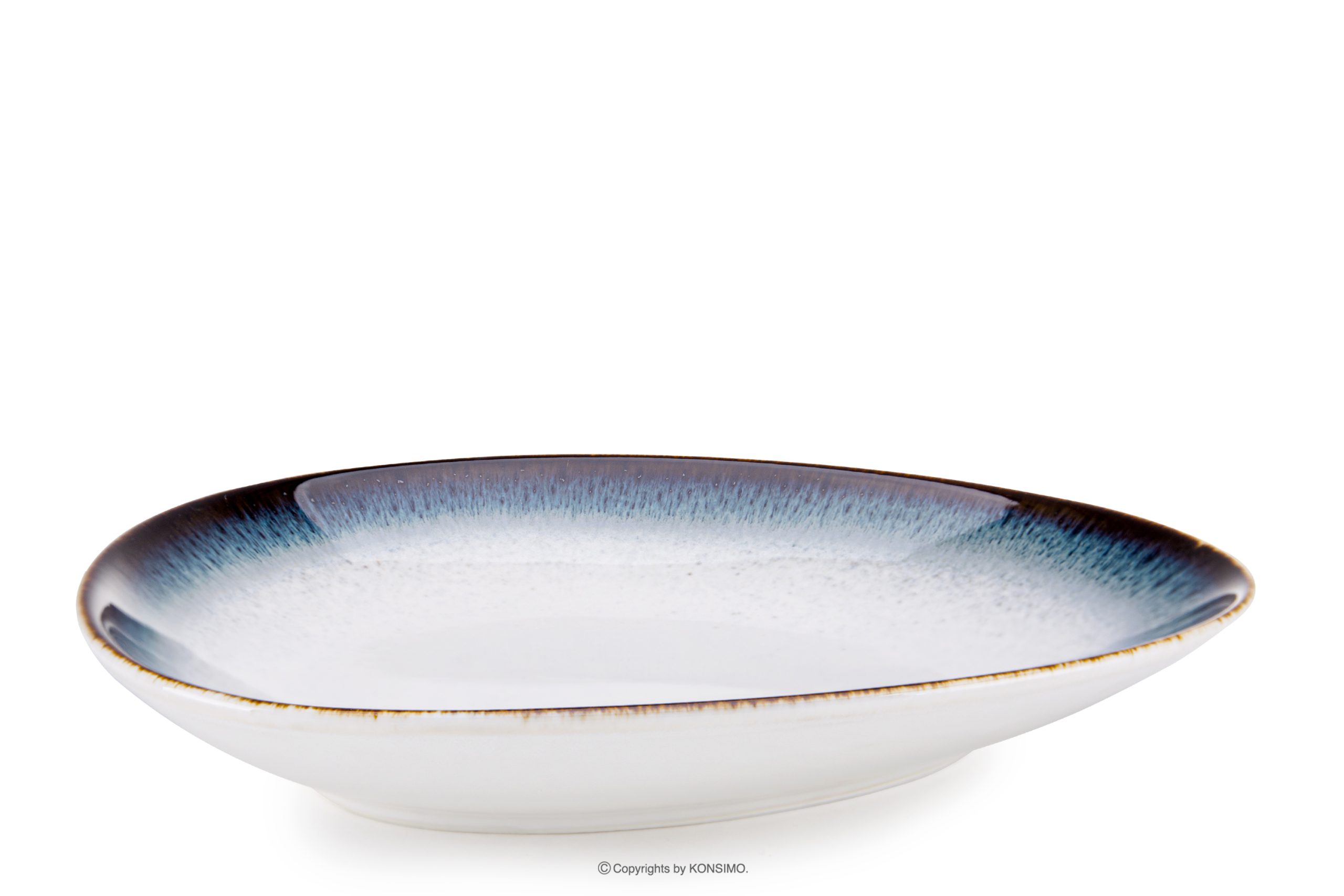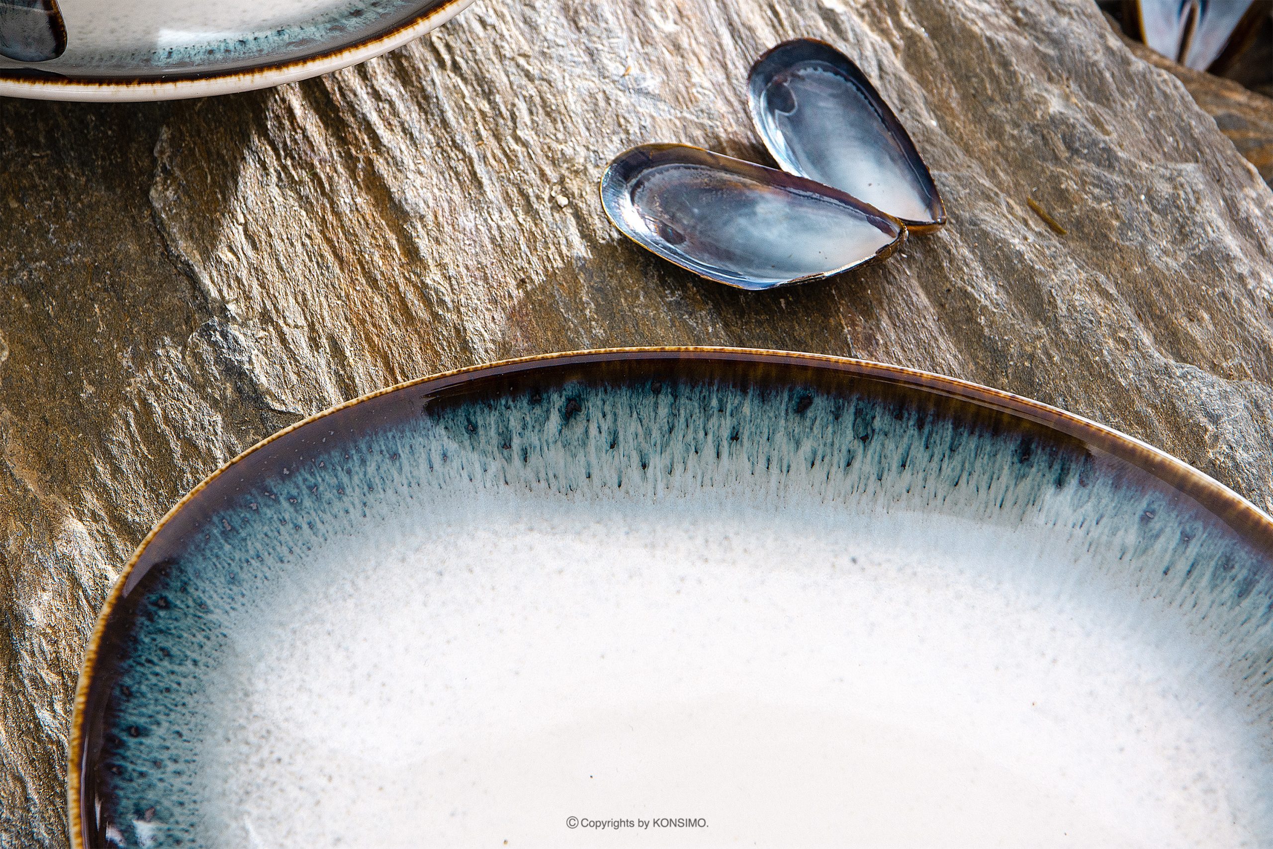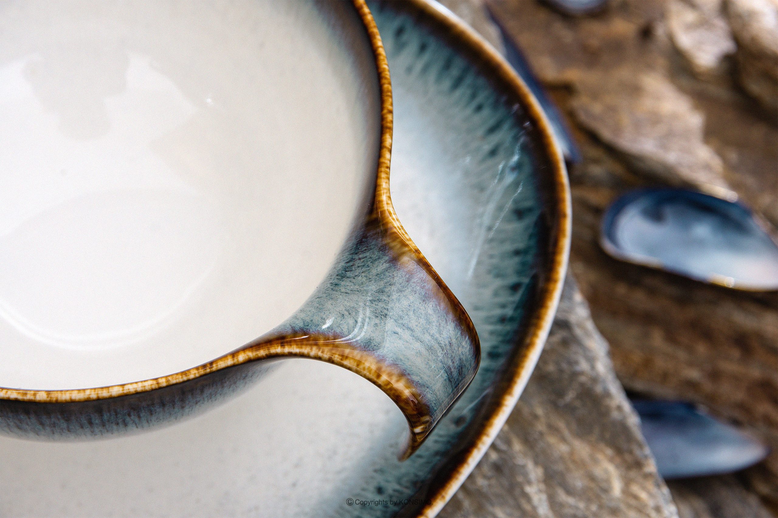 Diese einzigartig gestaltete Brühe wurde geschaffen, um Farbe auf den gedeckten Tisch zu bringen. Sie ist aus hochwertigem Porzellan gefertigt und passt gut zu maritimen, nautischen und skandinavischen Themen. Eine Besonderheit ist die Technik des Auftragens des Musters mit einer reaktiven Glasur. Das macht jedes Stück zu einem Unikat und ermöglicht es, dass sich die einzelnen Stücke voneinander unterscheiden.