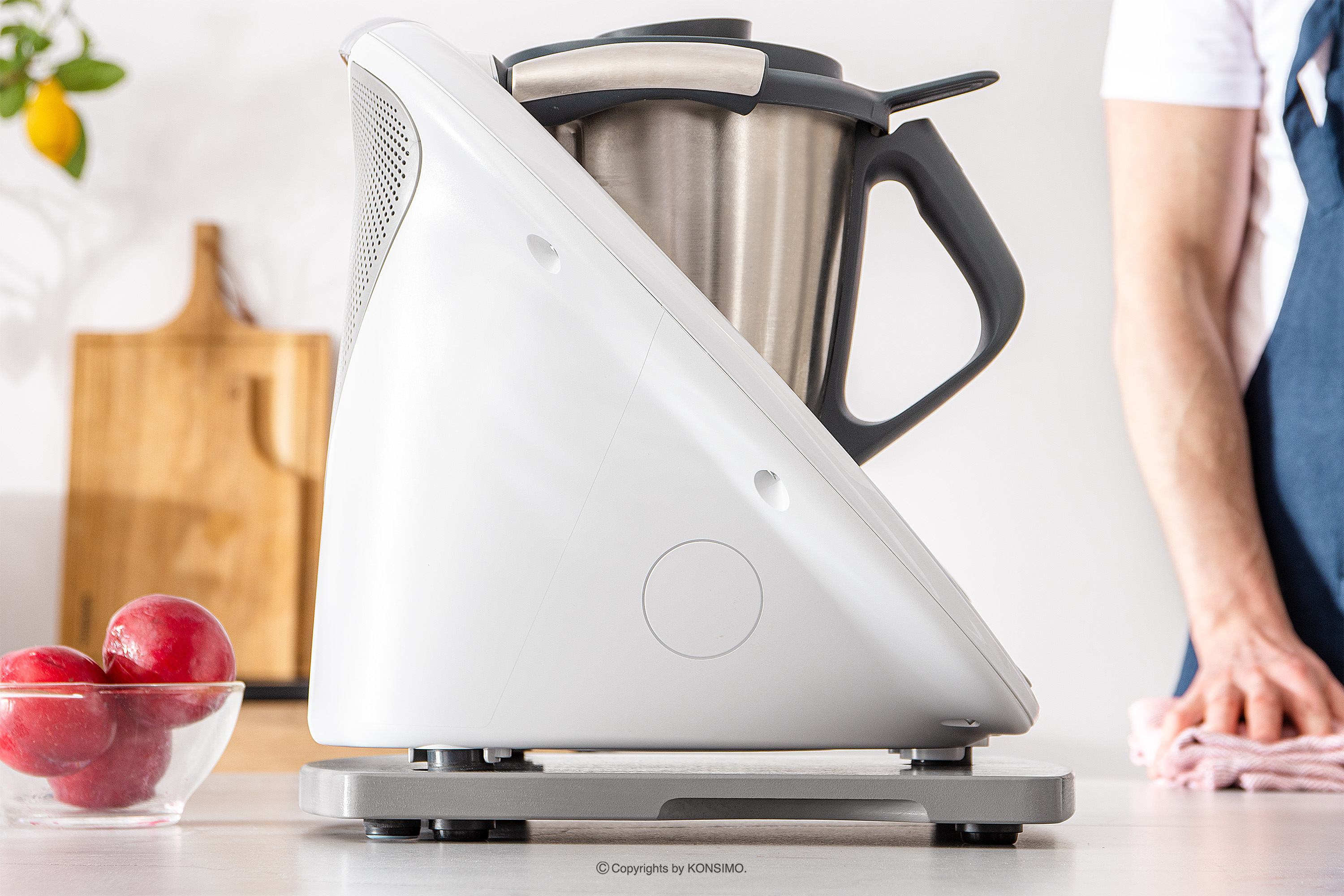 Der Boden der Platte ist mit drei perfekt angeordneten Thermomix TM5- und TM6-Füßen ausgestattet, die dafür sorgen, dass das Gerät stabil bleibt und sich während des Gebrauchs nicht bewegt. Darüber hinaus ist die Platte mit zwei Teflongleitern an der Unterseite ausgestattet, die das Gerät in alle Richtungen bewegen können. Egal, ob Sie den Thermomix seitlich verschieben oder in eine andere Richtung drehen müssen, unser Brett gibt Ihnen die Freiheit und den Komfort, das Gerät zu bedienen. Um die Stabilität und den Komfort weiter zu erhöhen, ist das Brett mit vier rutschfesten Gummifüßen ausgestattet, die die Vibrationen während des Gebrauchs dämpfen. Dank dieser Füße bleibt der Thermomix auch bei intensiven Kochvorgängen sicher an seinem Platz, ohne sich zu bewegen.