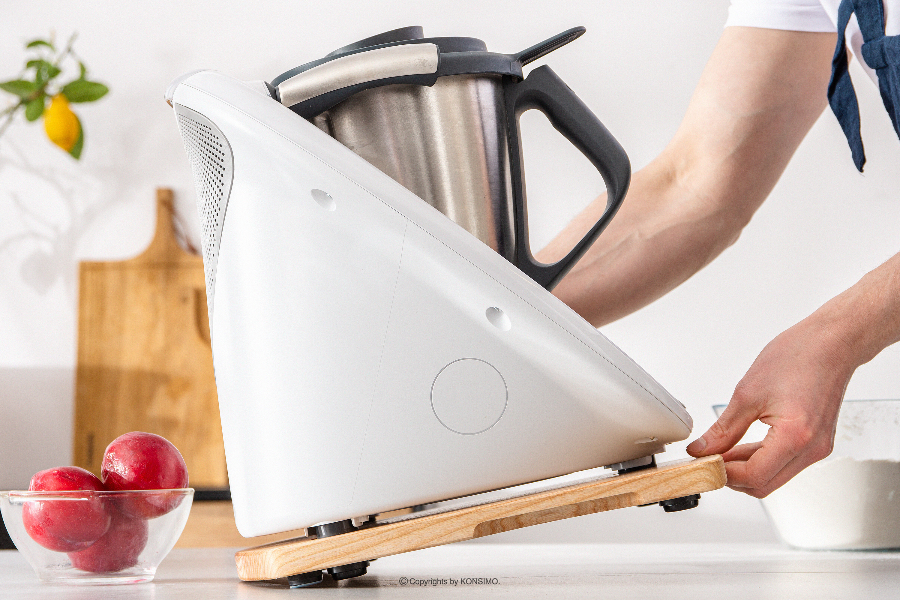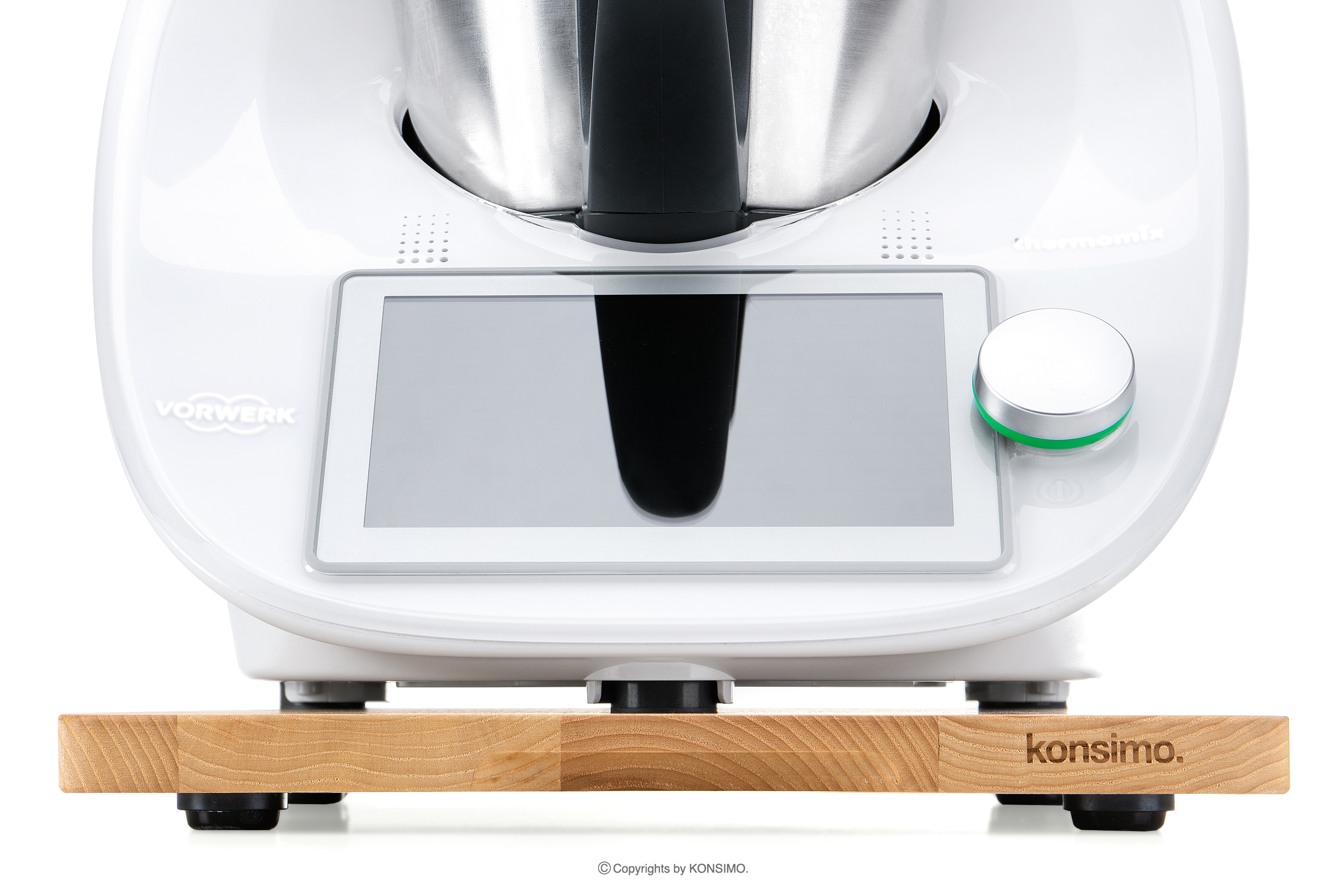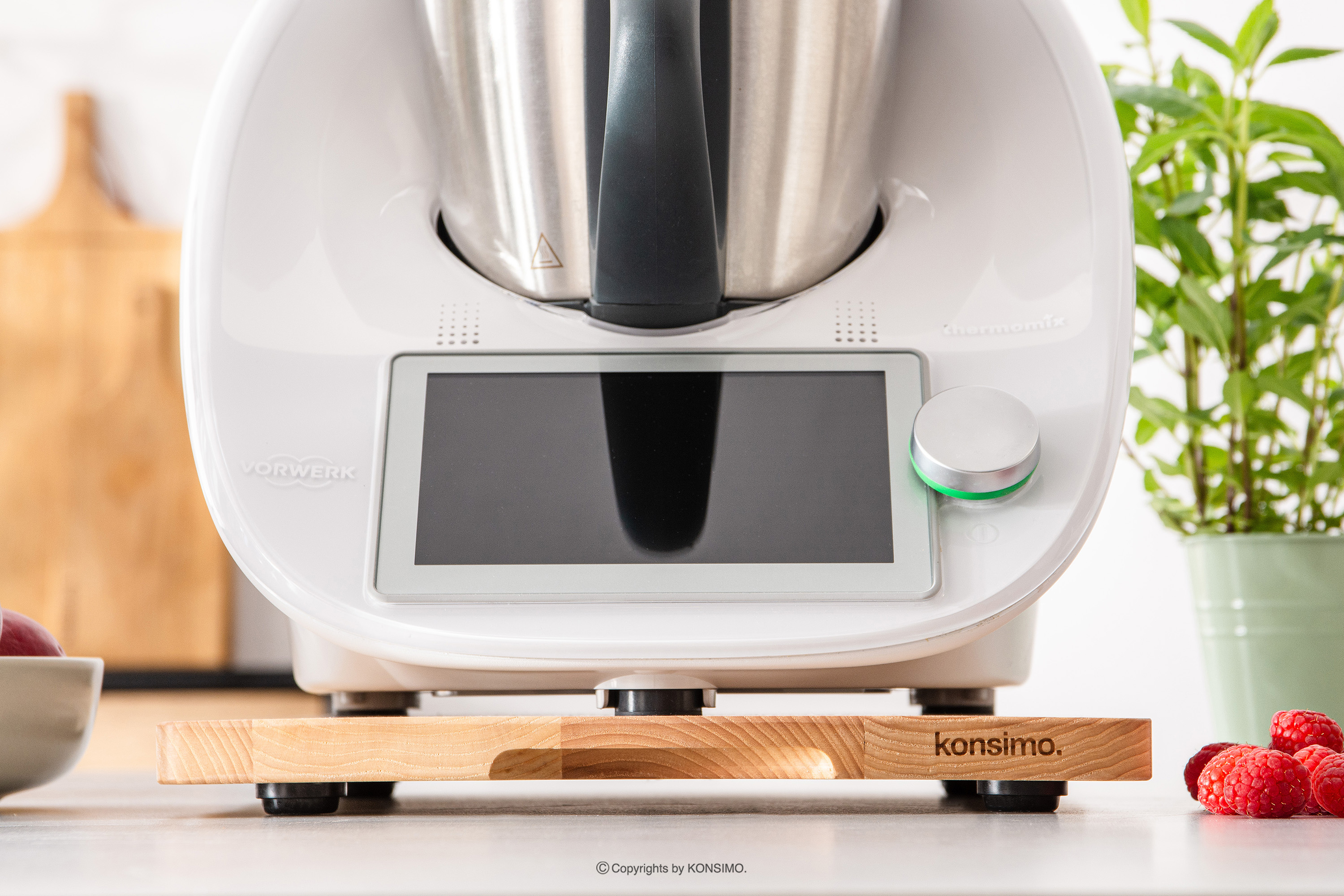Der Boden der Platte ist mit drei perfekt angeordneten Thermomix TM5- und TM6-Füßen ausgestattet, die dafür sorgen, dass das Gerät stabil bleibt und sich während des Gebrauchs nicht bewegt. Darüber hinaus ist die Platte mit zwei Teflongleitern an der Unterseite ausgestattet, die das Gerät in alle Richtungen bewegen können. Egal, ob Sie den Thermomix seitlich verschieben oder in eine andere Richtung drehen müssen, unser Brett gibt Ihnen die Freiheit und den Komfort, das Gerät zu bedienen. Um die Stabilität und den Komfort weiter zu erhöhen, ist das Brett mit vier rutschfesten Gummifüßen ausgestattet, die die Vibrationen während des Gebrauchs dämpfen. Dank dieser Füße bleibt der Thermomix auch bei intensiven Kochvorgängen sicher an seinem Platz, ohne sich zu bewegen.
