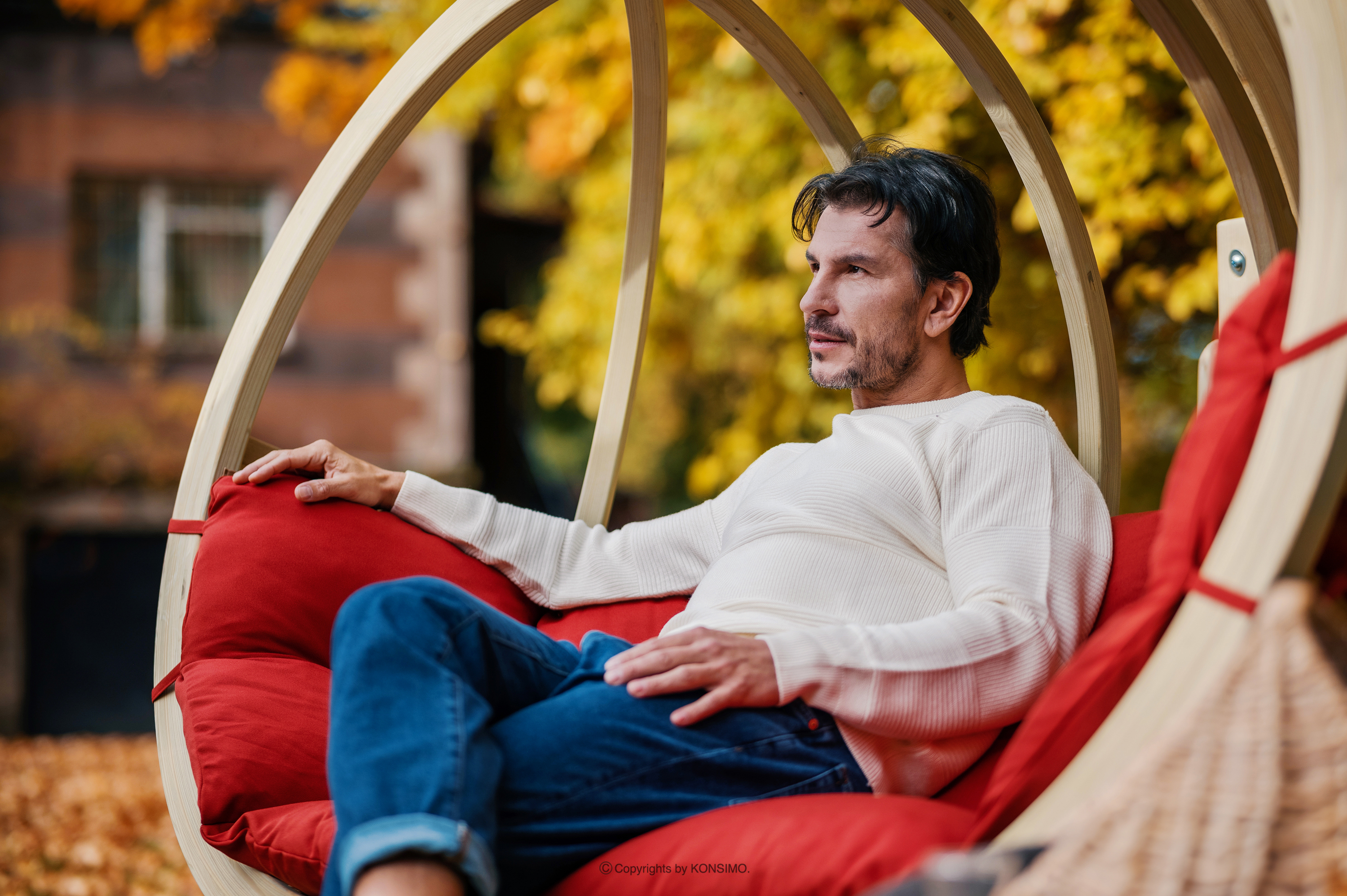 für das Produkt Roter Kokon-Doppel-Hängesessel aus Holz