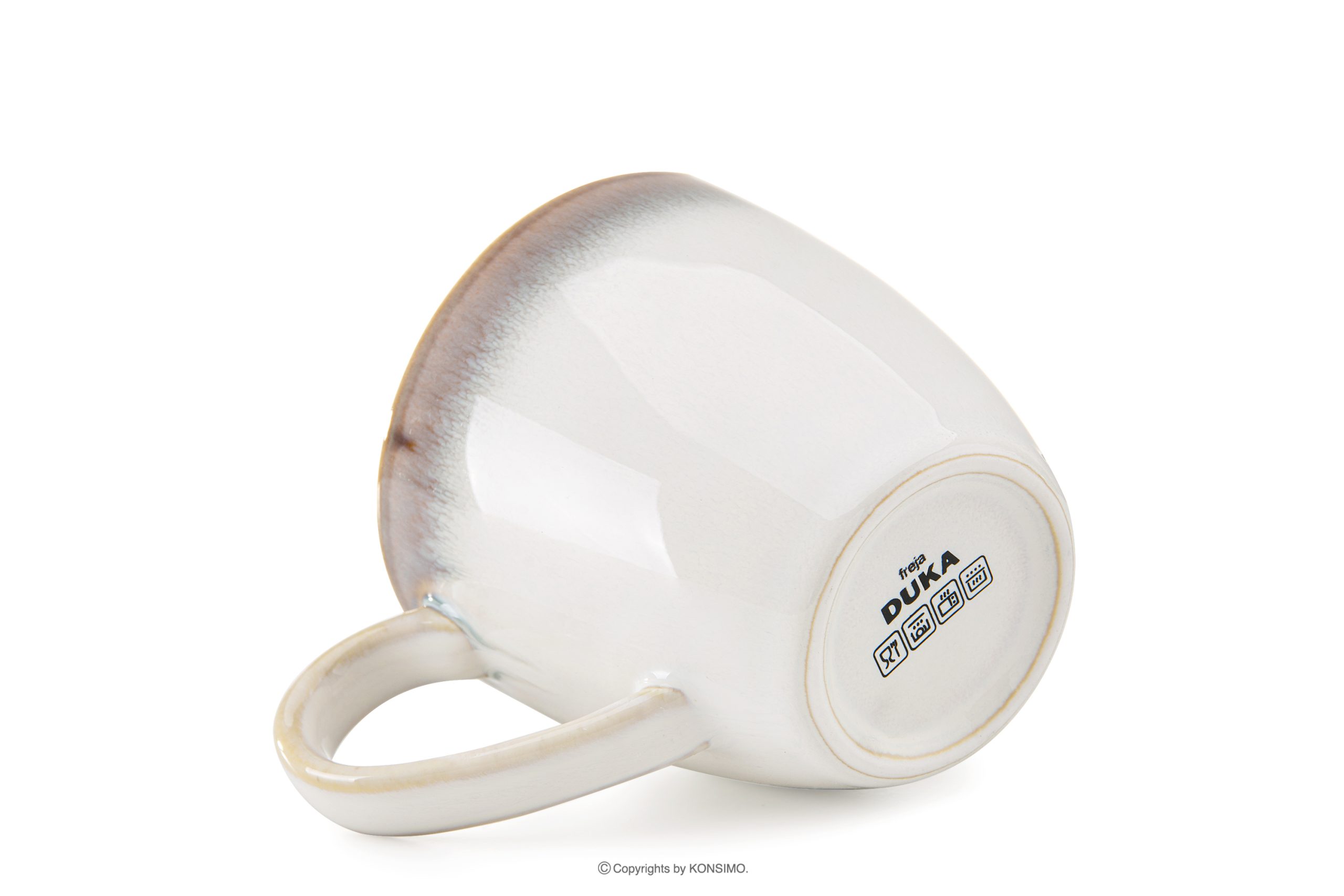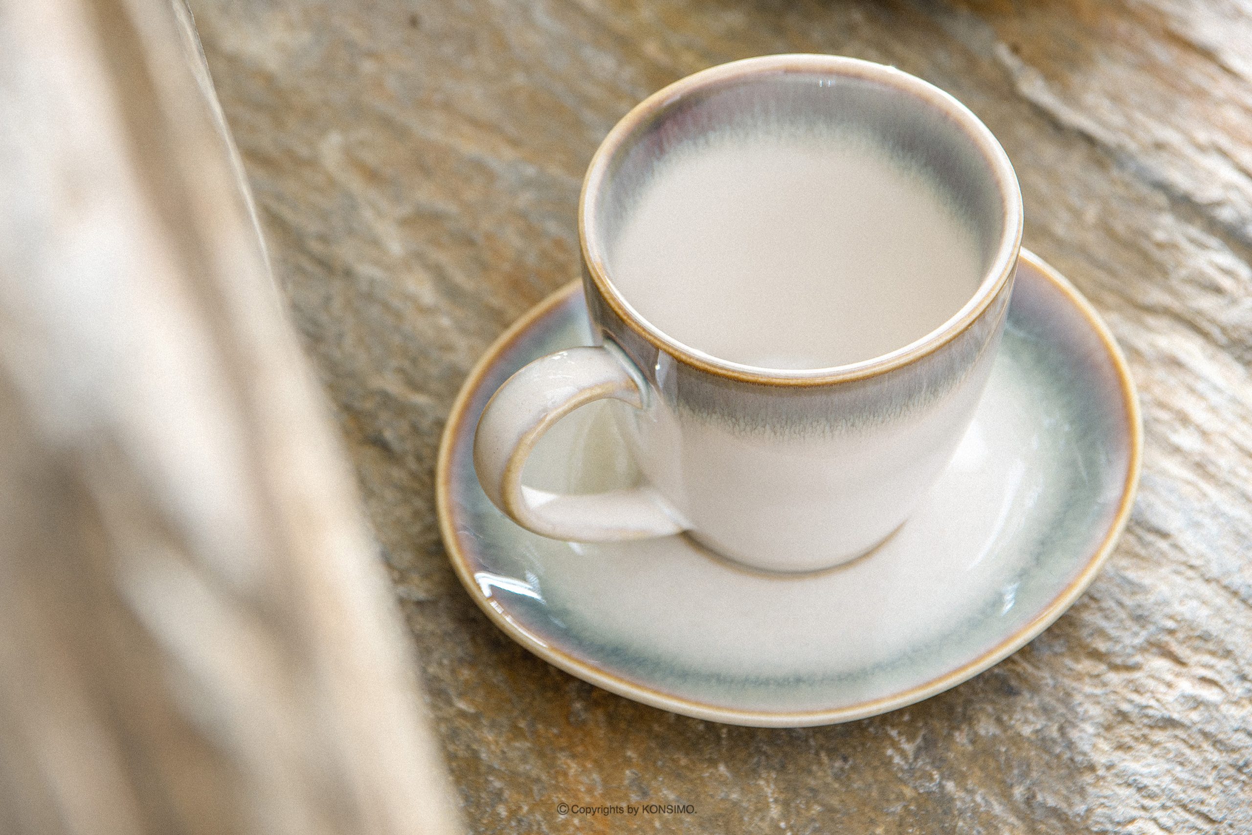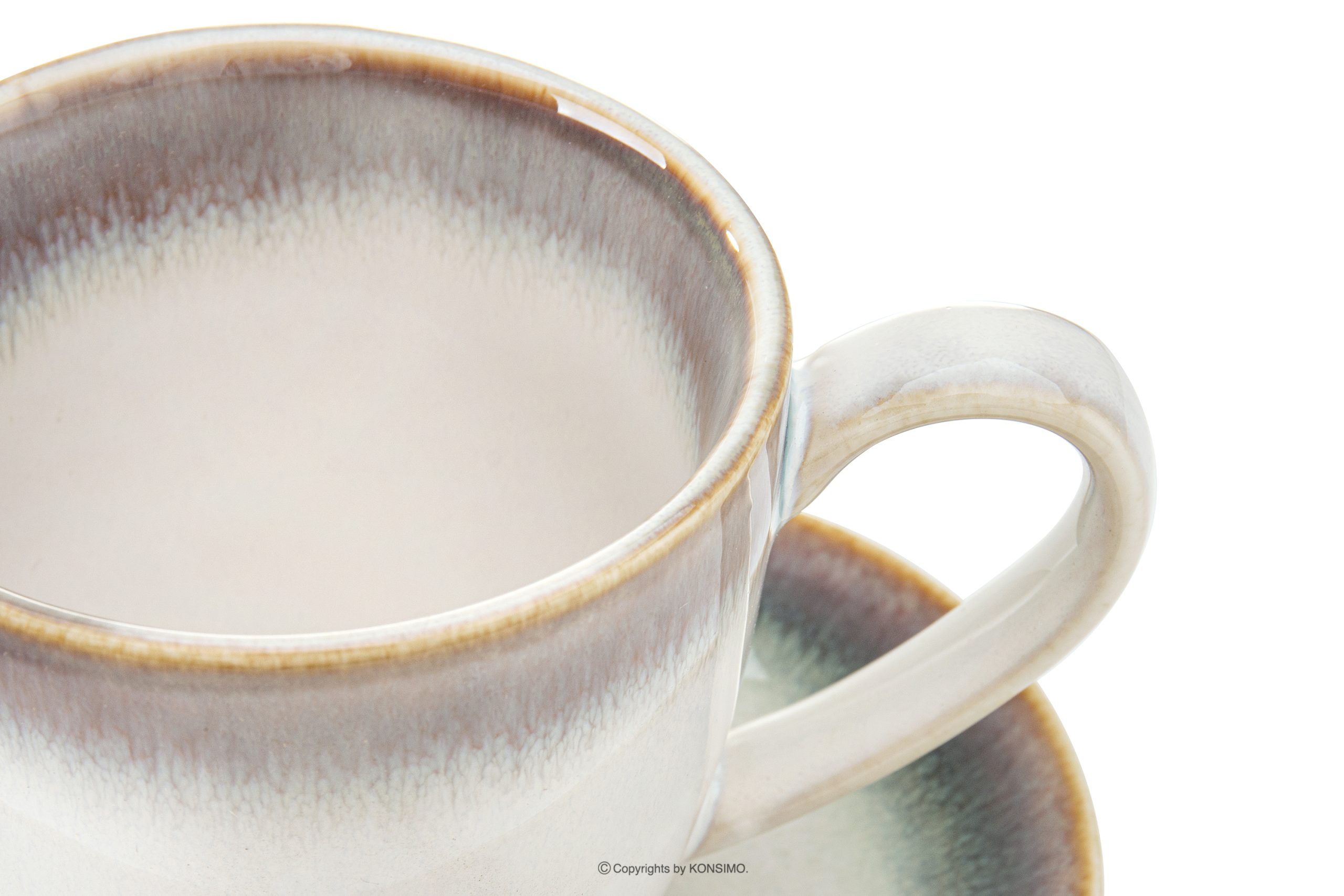 Die Tasse mit Untertasse aus der Kollektion FREJA ist ein echter Ausdruck des skandinavischen Stils. Das Geschirr ist aus feinem Porzellan gefertigt und besticht nicht nur durch sein ungewöhnliches Muster, sondern auch durch sein einzigartiges Design, das perfekt in ein modernes Interieur passt. Dank der reaktiven Glasurtechnik ist jedes Stück ein Unikat.