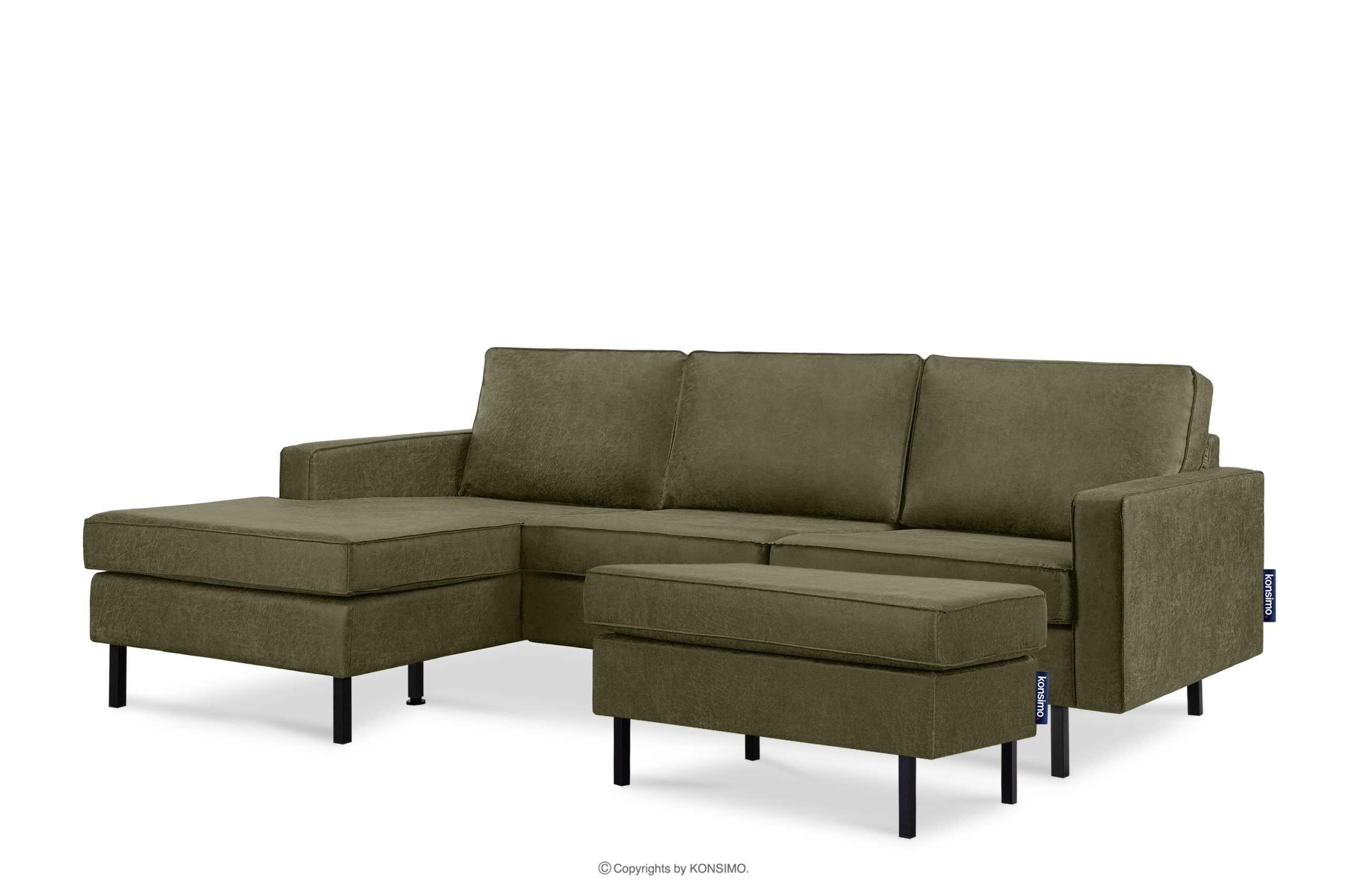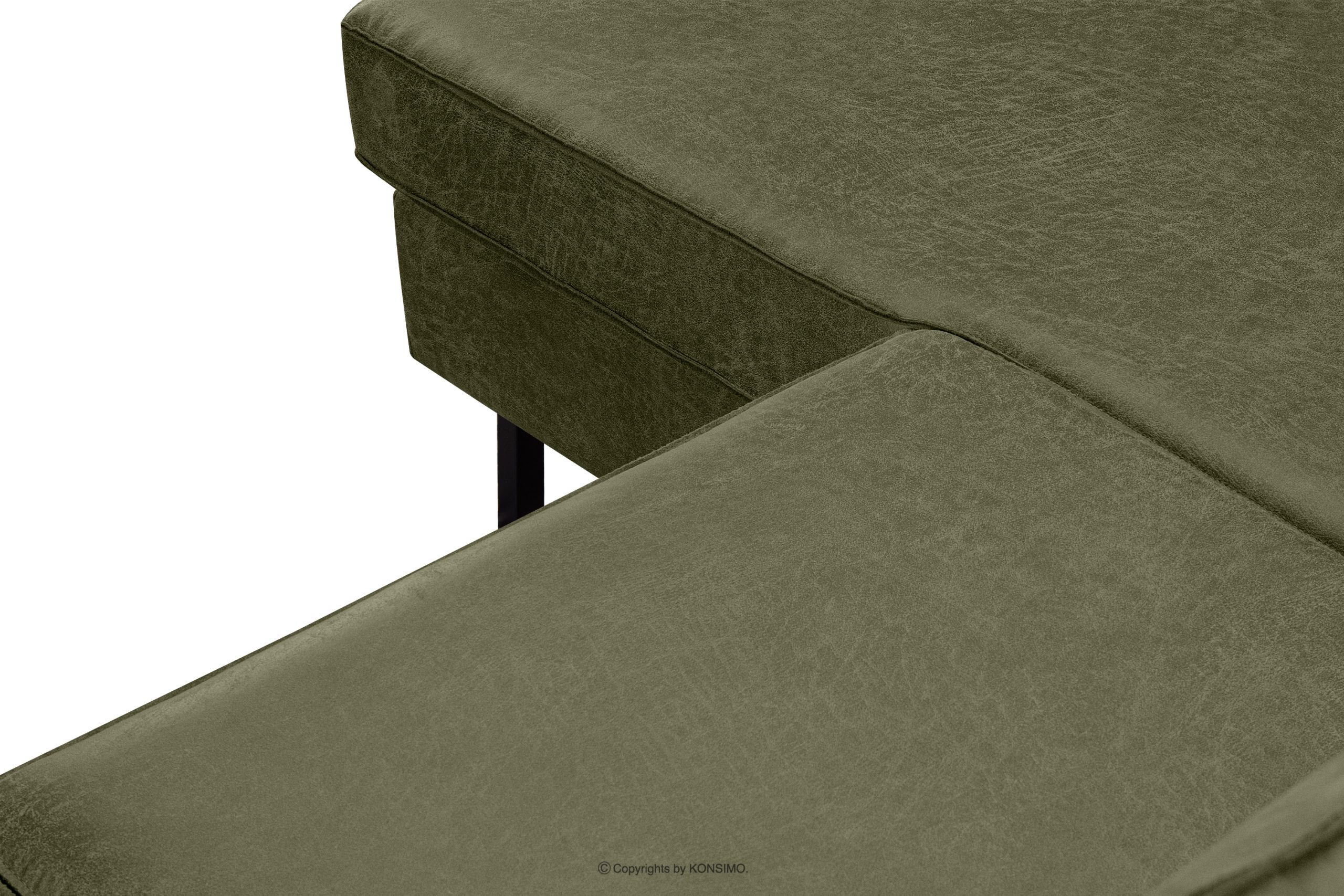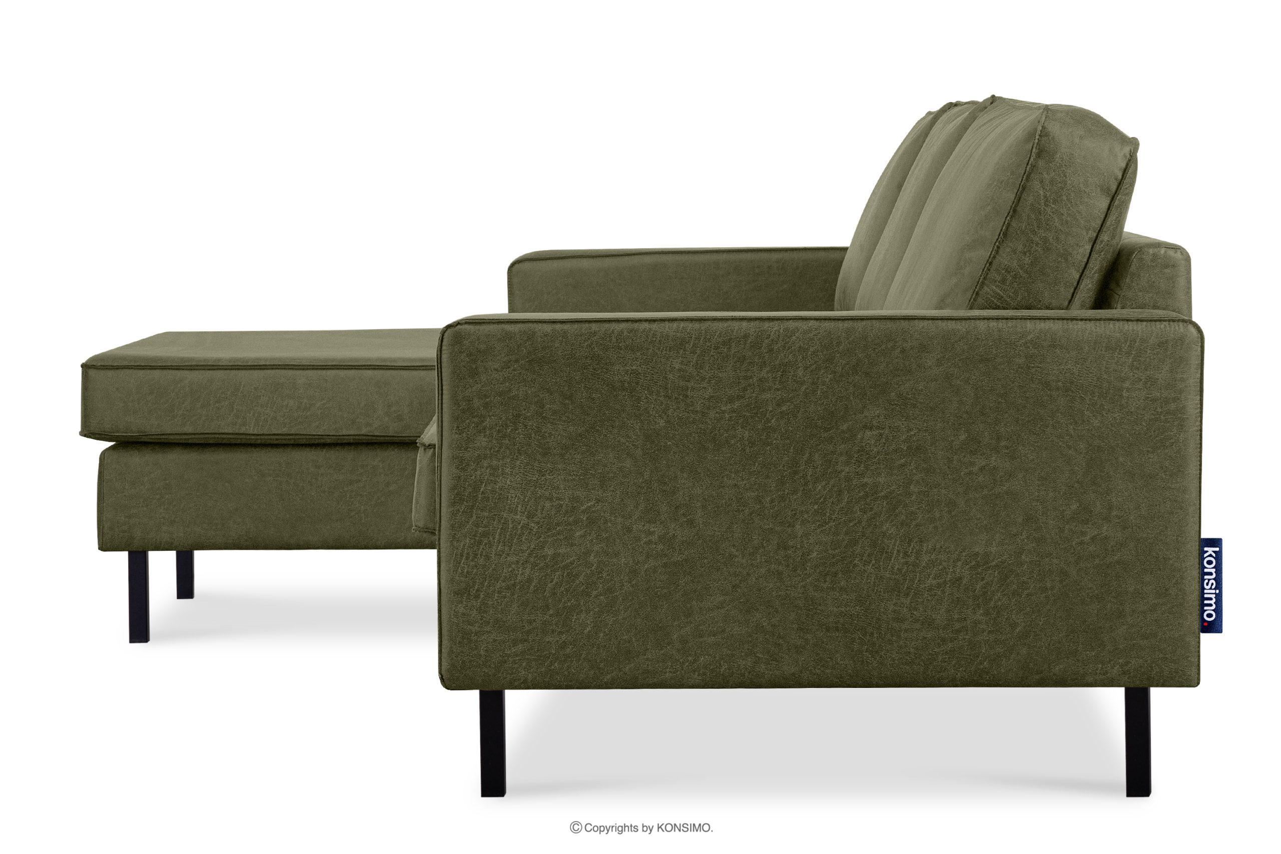 Das linke Ecksofa im Loft-Stil mit Ottomane grün ist eine ideale Lösung für große und kleine Räume. Das einzigartige Design und die hochwertige Verarbeitung machen es zu einem Möbelstück, das nicht nur ästhetisch erfreut, sondern auch Komfort und Bequemlichkeit bietet. Das Ecksofa verfügt außerdem über schwarze Metallfüße, die perfekt zum Loft- und Vintage-Stil passen.