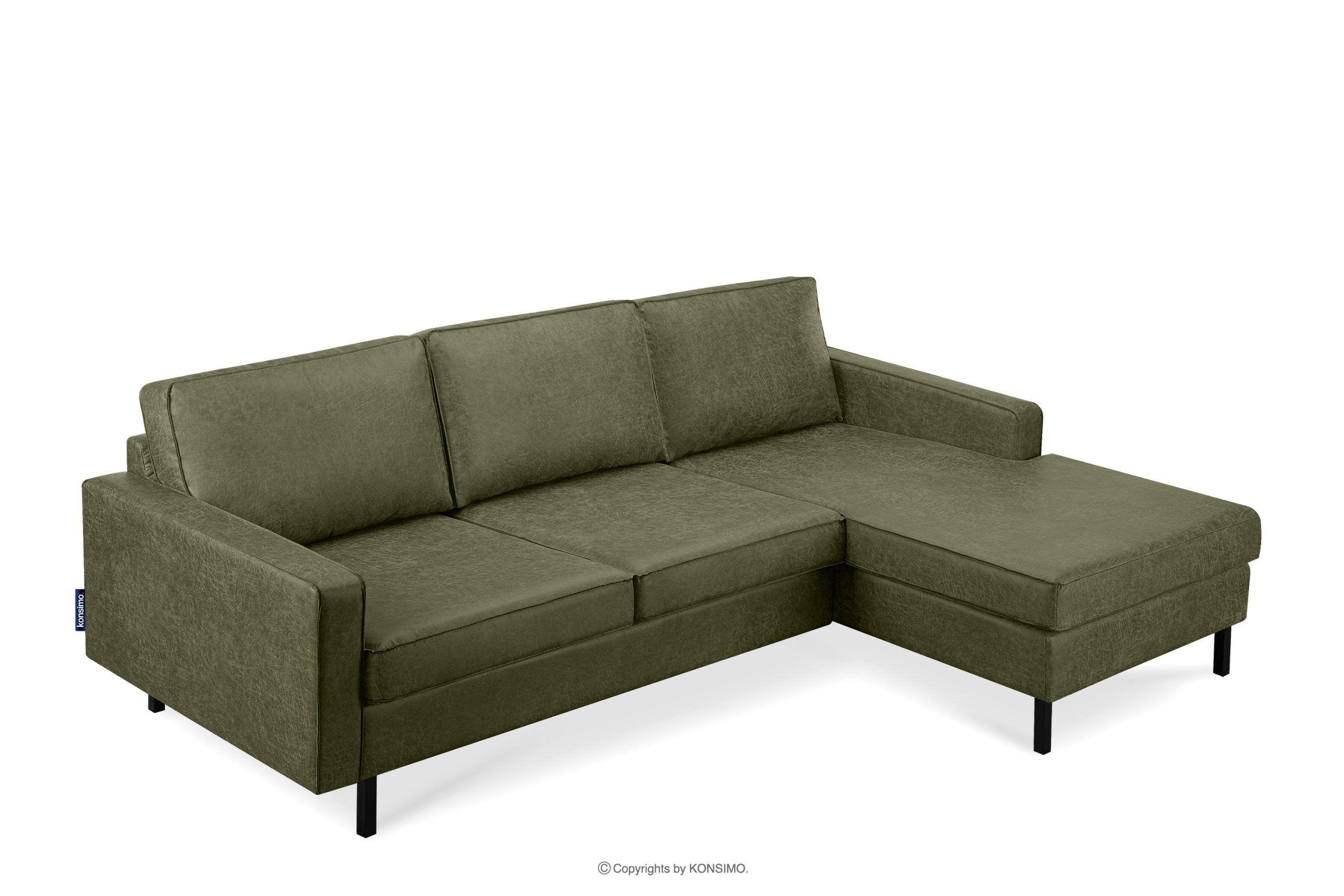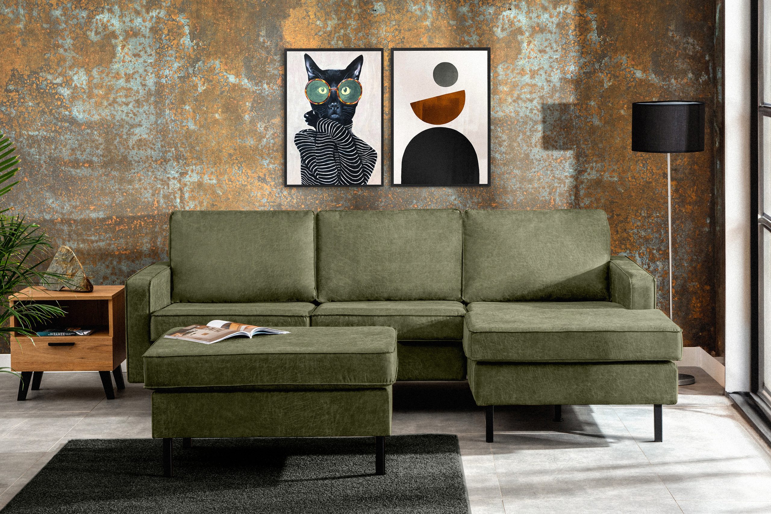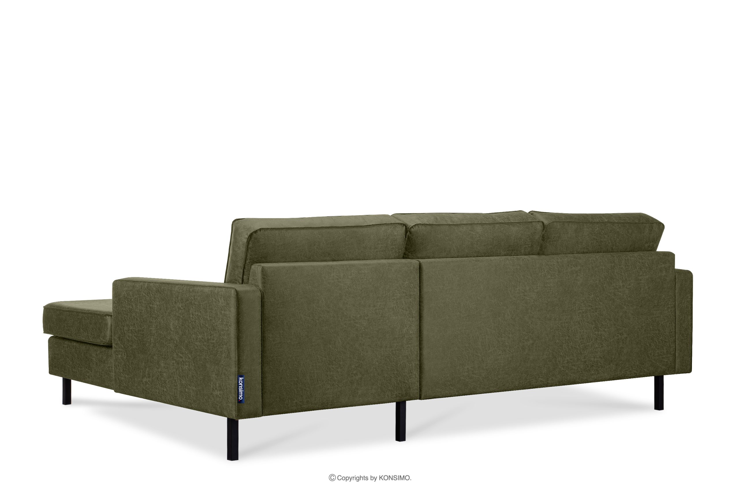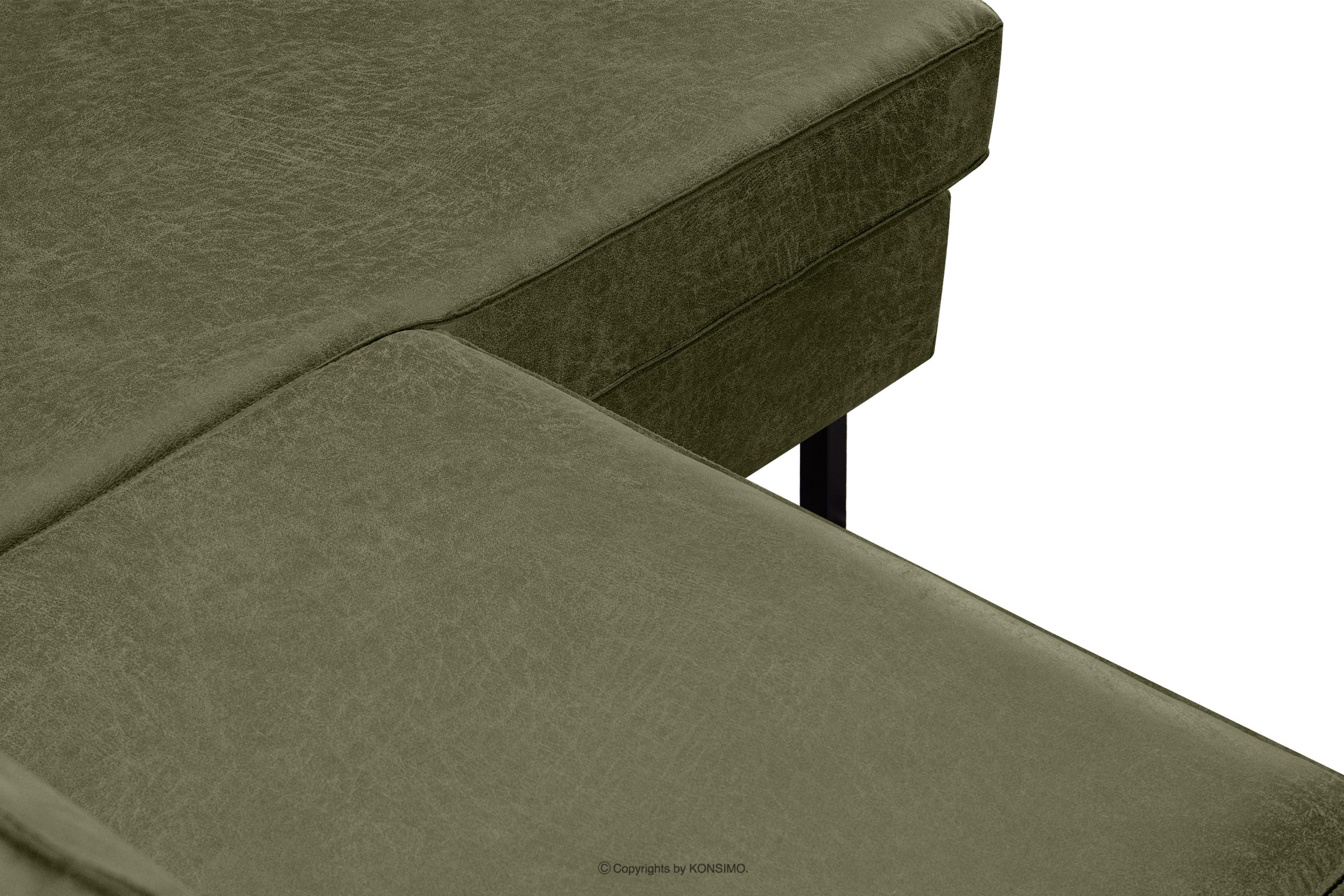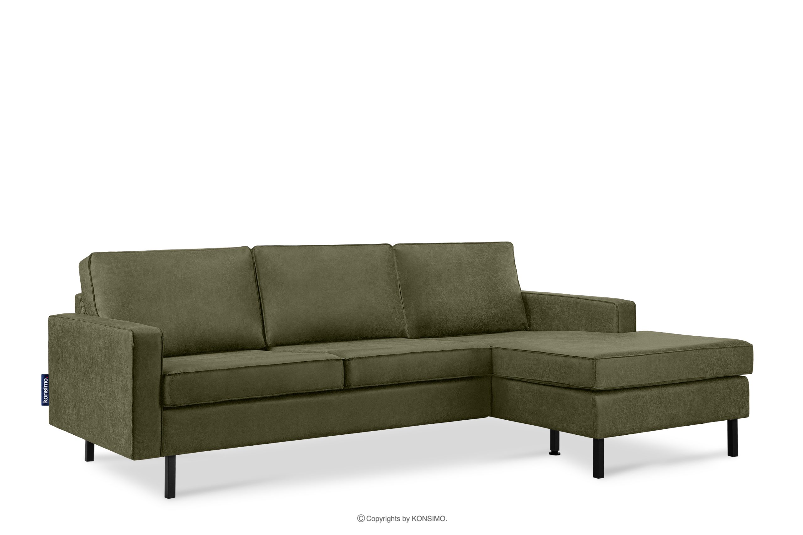 Das rechte Ecksofa im Loft-Stil mit Ottomane grün ist eine ideale Lösung für große und kleine Räume. Sein einzigartiges Design und die hochwertige Verarbeitung machen es zu einem Möbelstück, das nicht nur ästhetisch ansprechend ist, sondern auch Komfort und Bequemlichkeit bietet. Das Ecksofa verfügt außerdem über schwarze Metallfüße, die perfekt zum Loft- und Vintage-Stil passen.