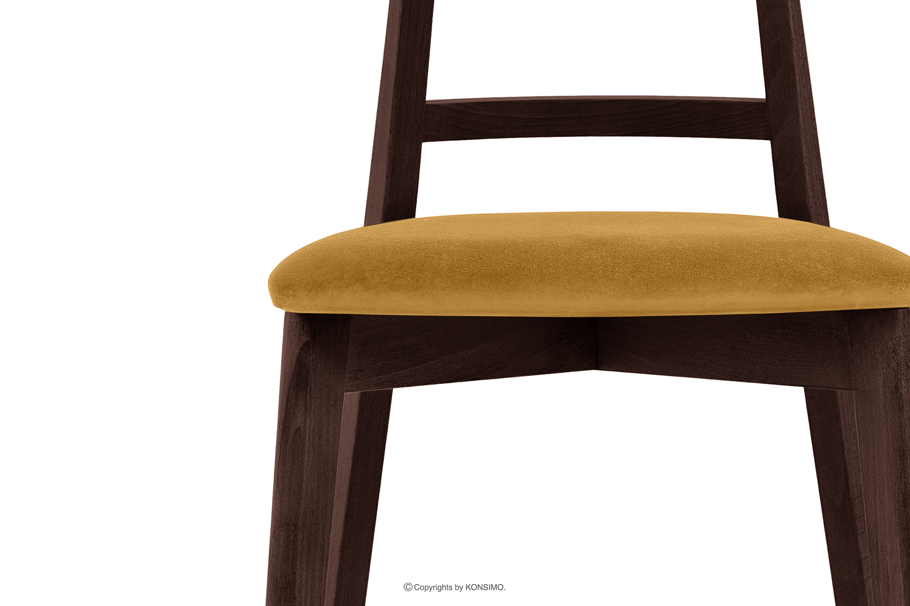 Der 2er-Stuhl aus gelbem Velours in Mahagoni strahlt nicht nur einen einzigartigen Stil aus, sondern erfüllt auch die höchsten Ansprüche an Komfort und Funktionalität. Die Stuhlbeine sind aus massivem Buchenholz gefertigt, was zu seiner Stärke und seinem subtilen Charme beiträgt. Das Holz fügt sich perfekt in den klassischen Vintage-Stil ein und macht das Produkt zu einem praktischen Möbelstück.