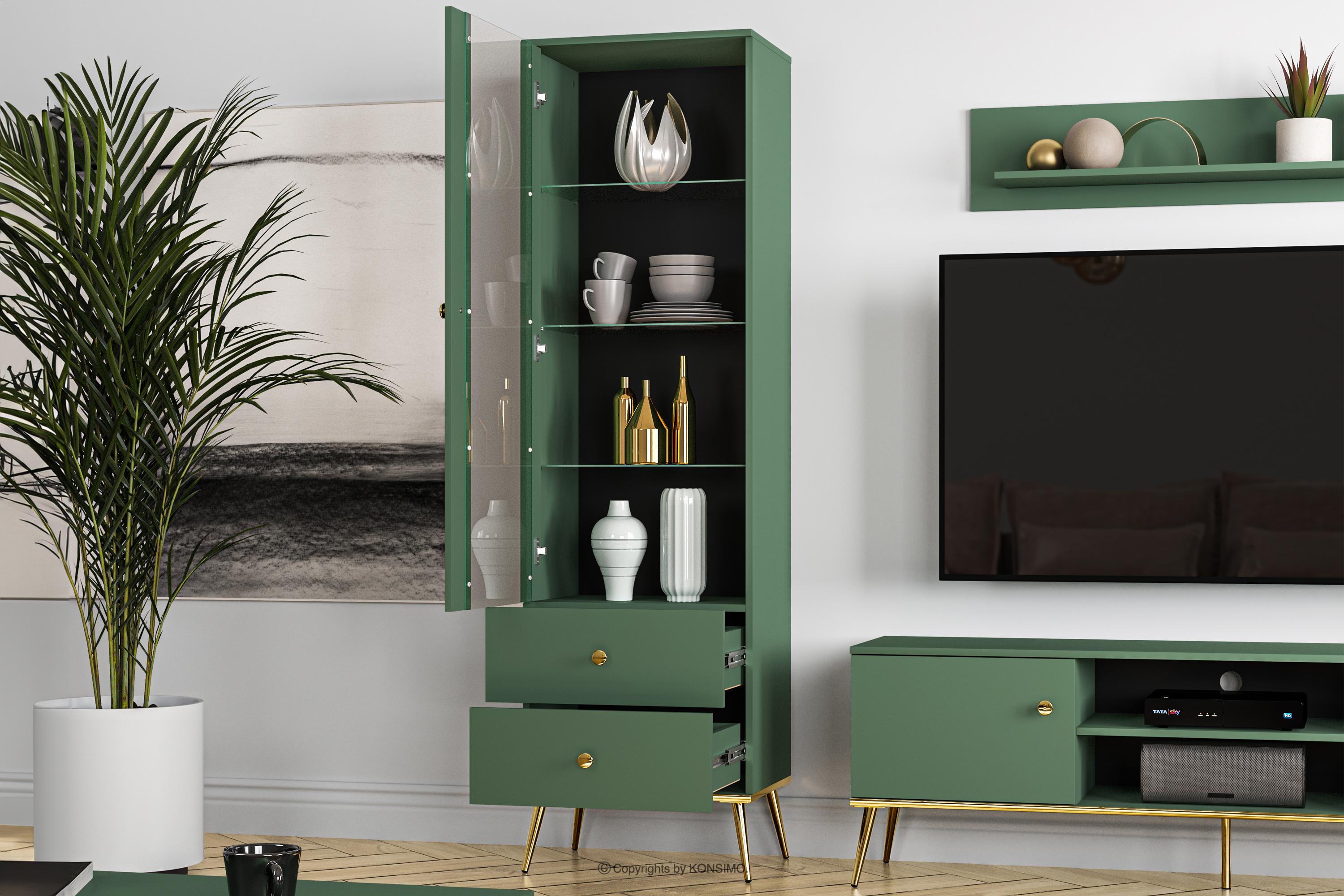 Die hohe grüne Vitrine mit goldenen Beinen bringt einen Hauch von Chic in Ihr Interieur. Der Korpus aus laminierter Platte wurde für Liebhaber von elegantem Stil und Solidität entworfen und bietet eine solide Grundlage für jeden Raum. Die goldfarbenen, konischen Beine und Griffe sind wie das Tüpfelchen auf dem i. Und das ist noch nicht alles!