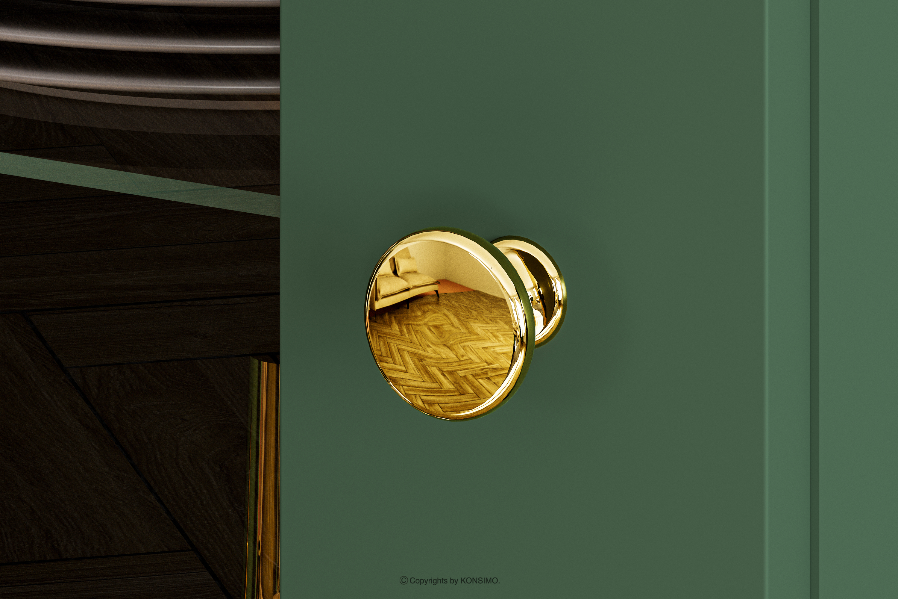 Die laminierte Platte Front besticht nicht nur durch ihr Aussehen, sondern garantiert auch ein gleichbleibendes Erscheinungsbild über viele Jahre. Goldfarbene Akzente in Form von Griffen und Füßen tragen nicht nur zum Charme bei, sondern schmücken auch den grünen Massivholzkorpus auf zarte Weise. Die solide Konstruktion und sorgfältige Verarbeitung lassen ihn nicht nur seine Funktion erfüllen, sondern auch zum Hauptdarsteller einer eleganten Raumgestaltung werden. Die Vollauszüge in den Schubladen ermöglichen eine mühelose Benutzung, und die erhöhte Belastbarkeit dank des verstärkten Bodens sorgt dafür, dass die Kommode nicht nur beeindruckt, sondern auch praktischen Ansprüchen gerecht wird.