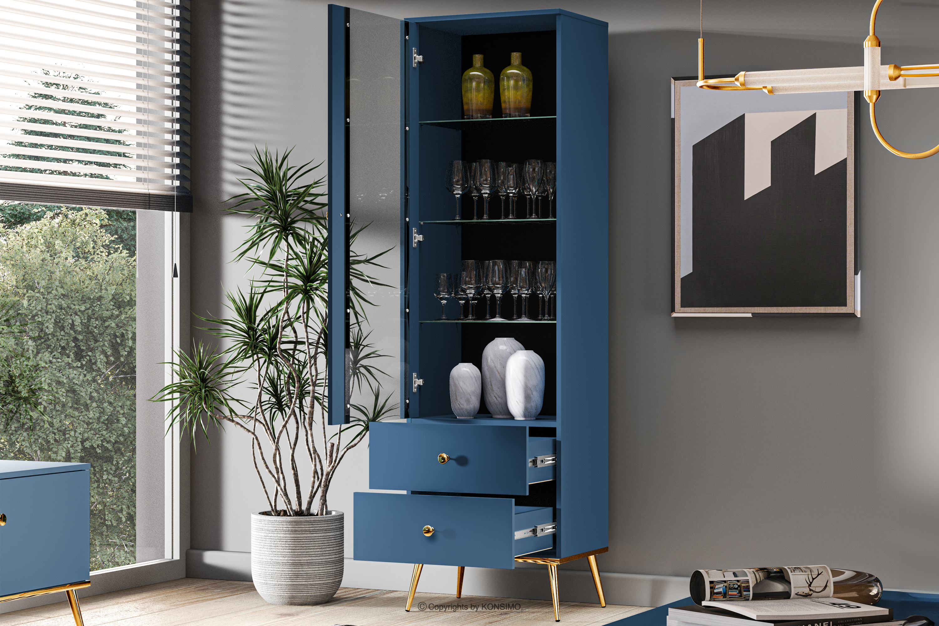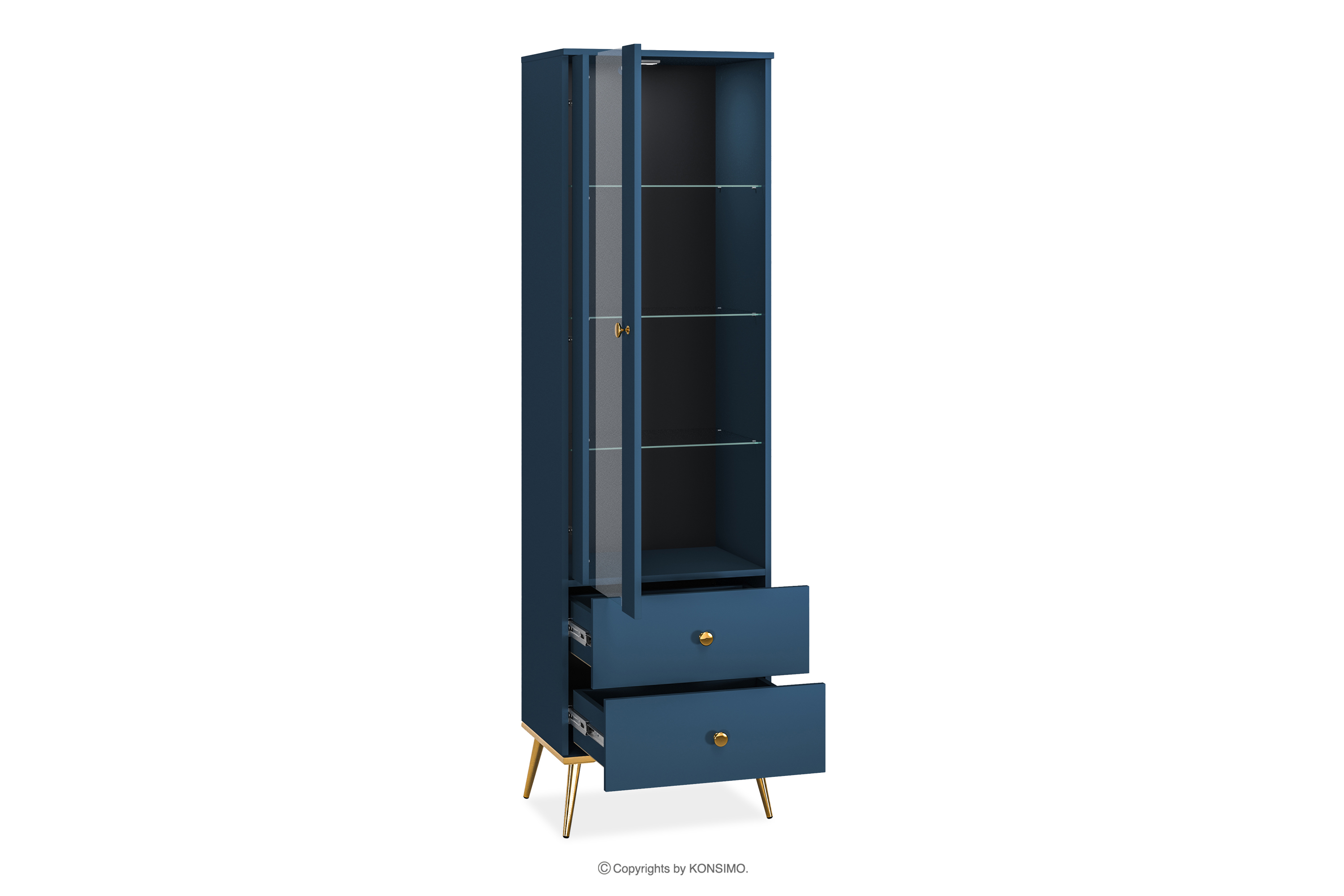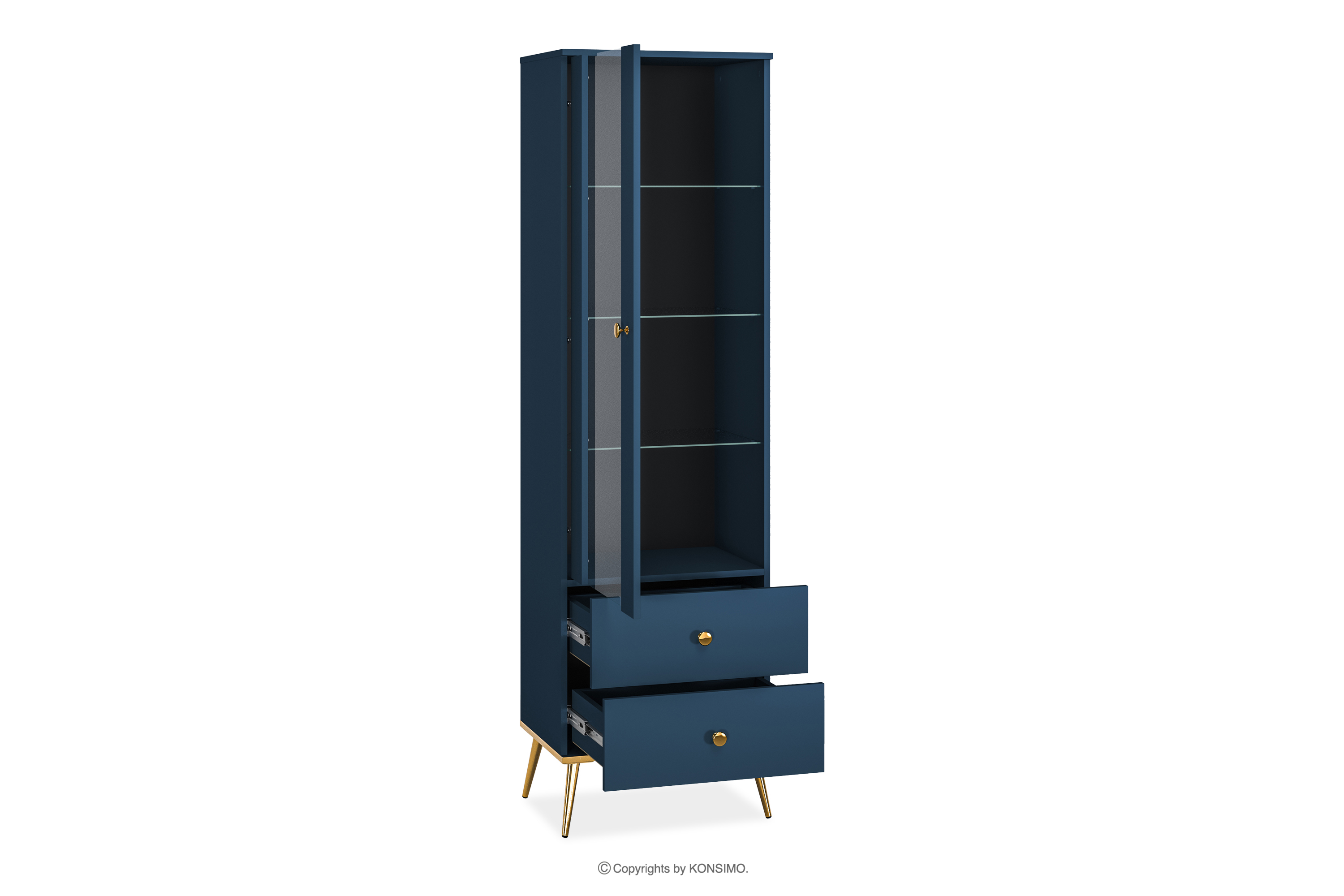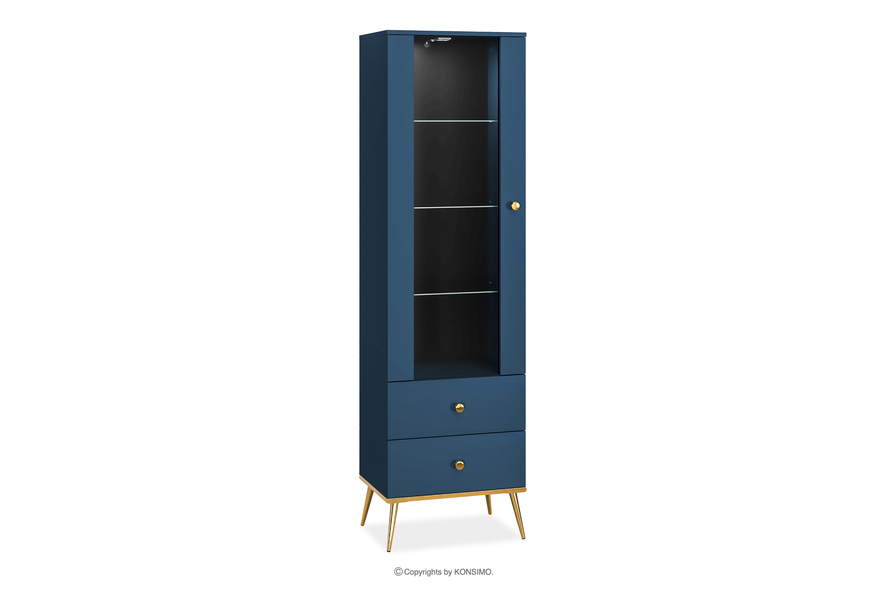 Die marineblaue Vitrine auf hohen goldenen Beinen bringt einen Hauch von Chic in Ihre Einrichtung. Der Korpus aus laminierter Platte bietet eine solide Grundlage für jeden Raum und ist für Liebhaber des eleganten Stils und der Solidität gleichermaßen geeignet. Die goldfarbenen, konischen Beine und Griffe sind wie das Tüpfelchen auf dem i.