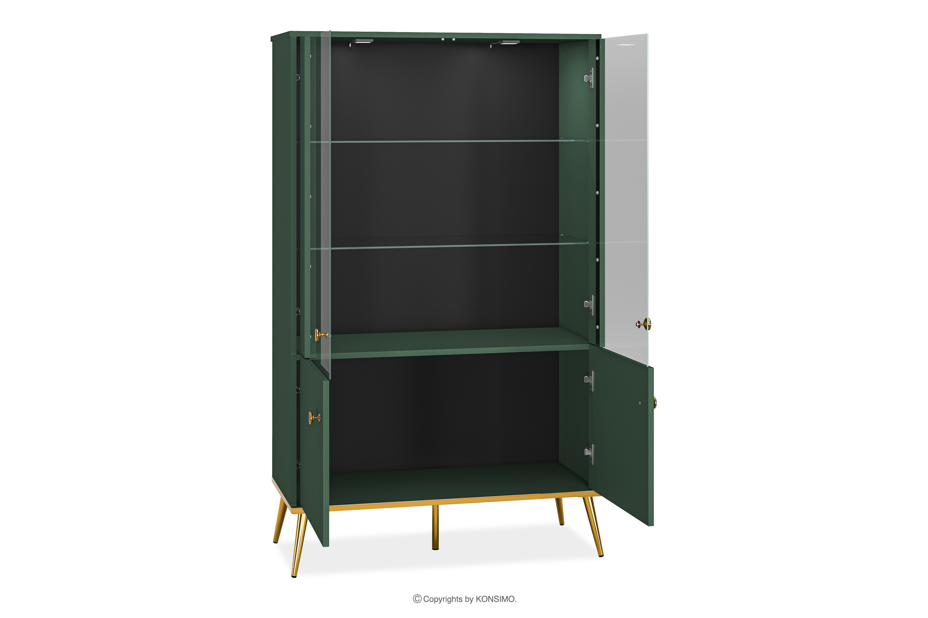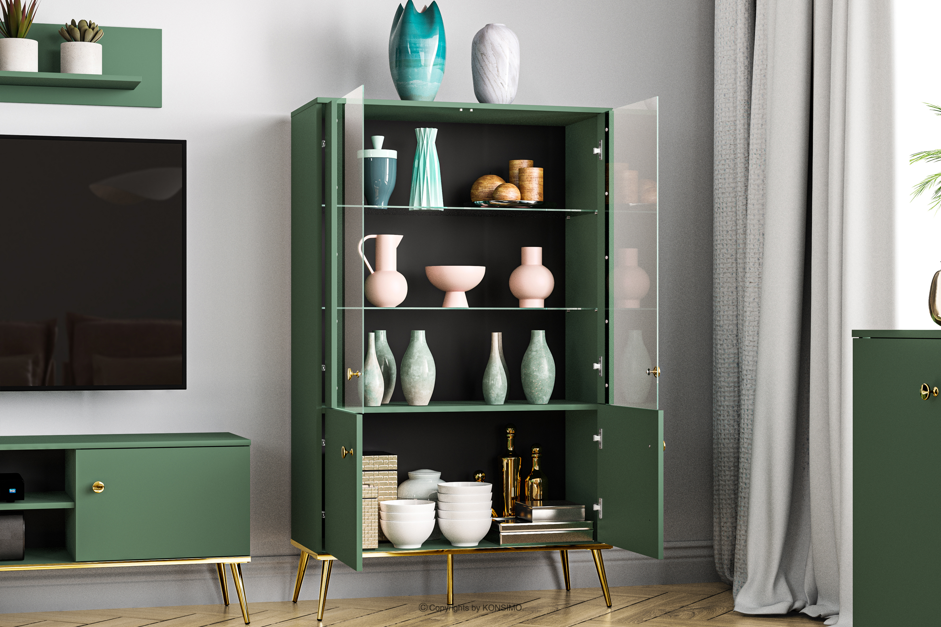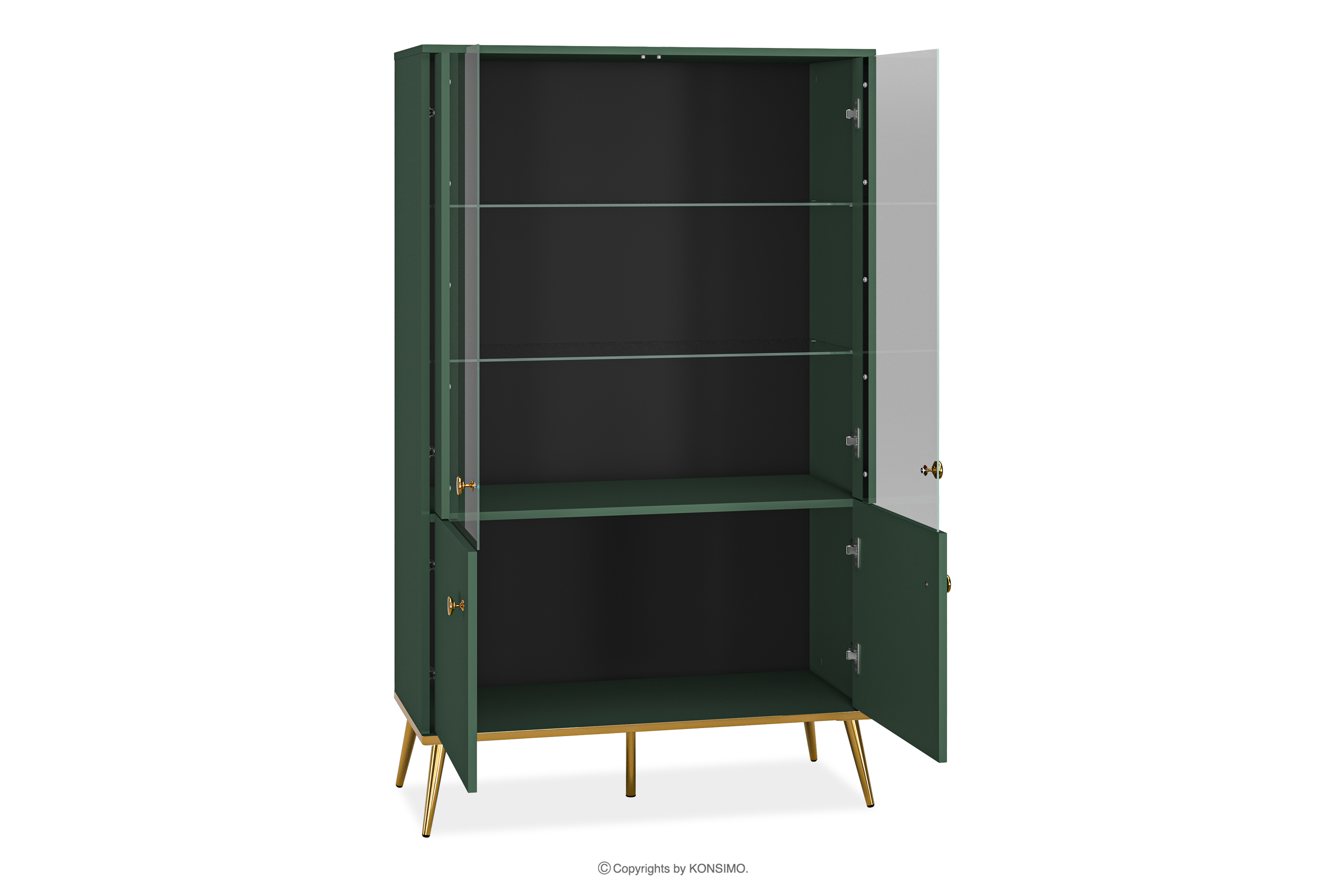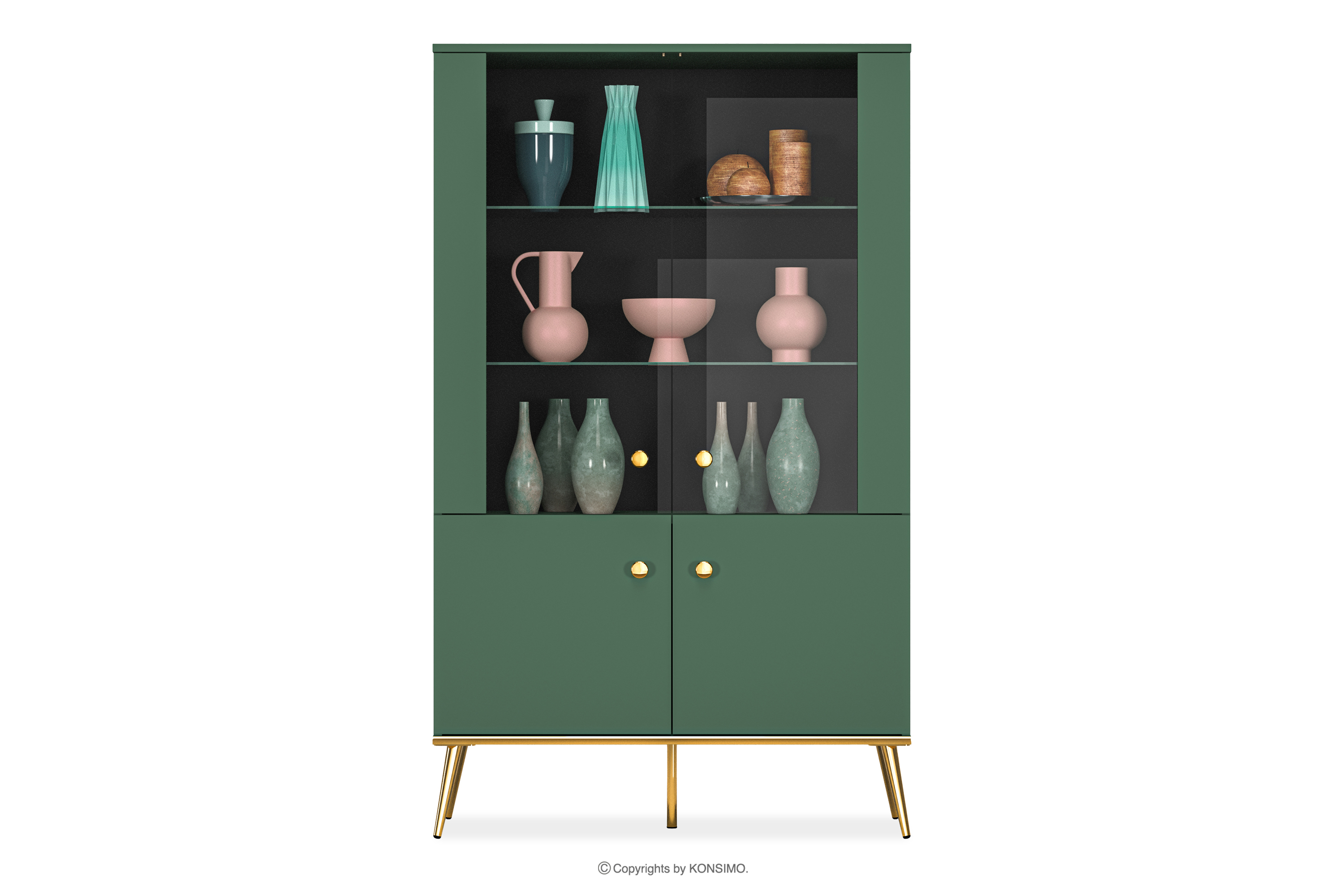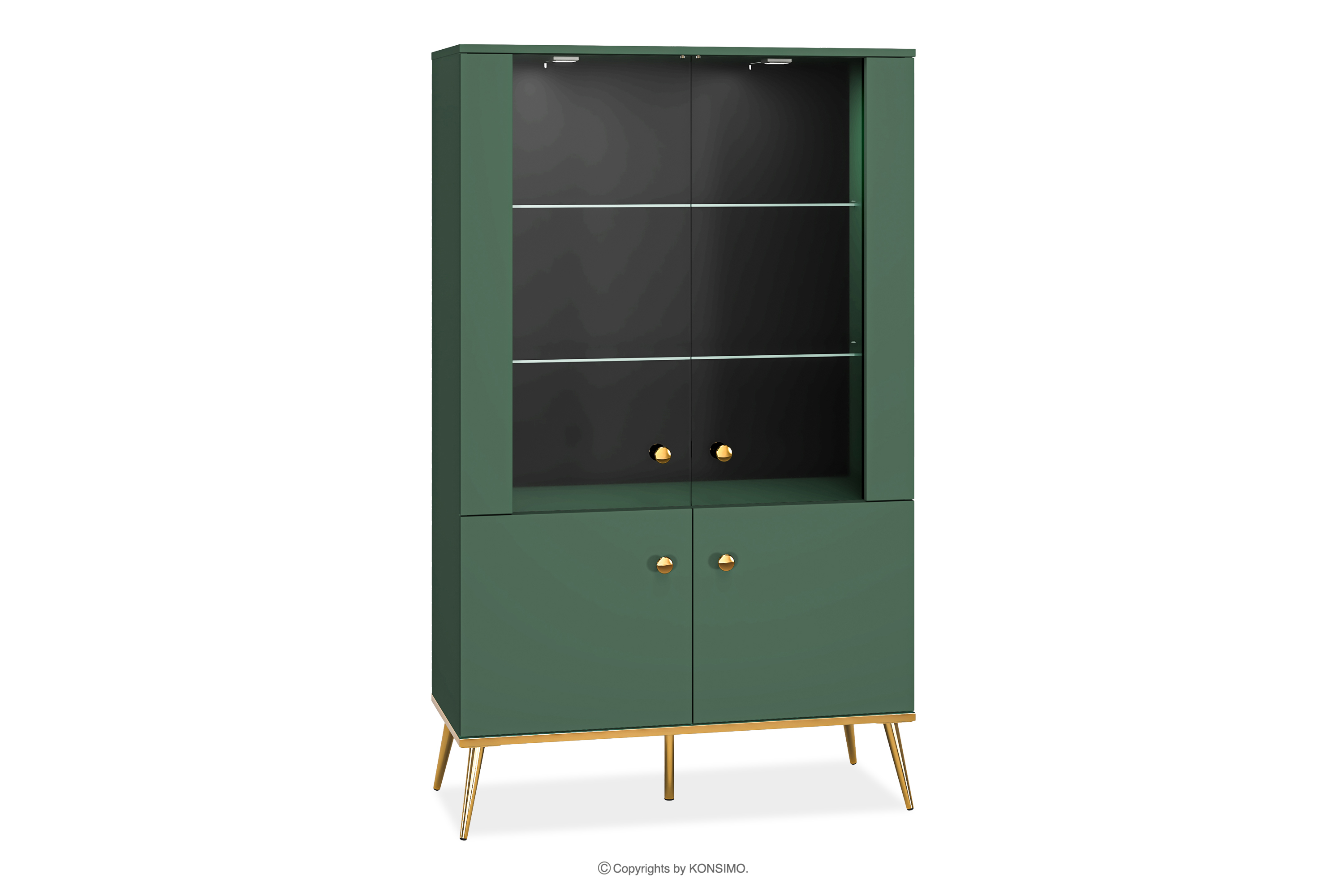 Die grüne Vitrine auf hohen goldenen Beinen bringt einen Hauch von Chic in Ihr Interieur. Der Korpus aus laminierter Platte ist für Liebhaber von Eleganz und Solidität konzipiert und bietet eine solide Grundlage für jeden Raum. Die goldfarbenen, konischen Beine und Griffe sind wie das Tüpfelchen auf dem i. Und das ist noch nicht alles!