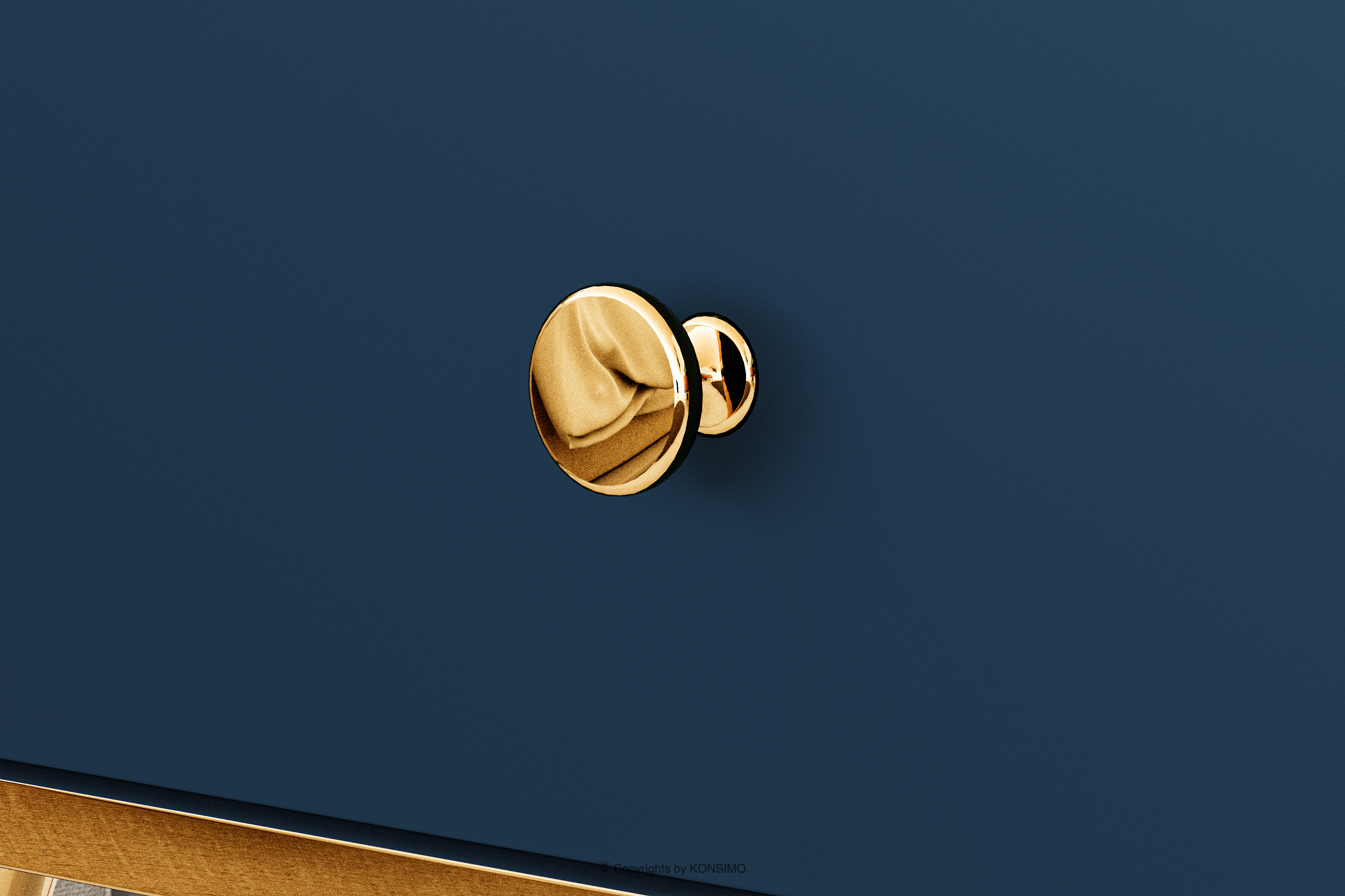 Die laminierte Platte-Front besticht nicht nur durch ihr Aussehen, sondern garantiert auch ein gleichbleibendes Erscheinungsbild über viele Jahre. Goldfarbene Akzente in Form von Griffen und Füßen tragen nicht nur zum Charme bei, sondern schmücken auch das dunkelblaue Massivholz auf zarte Weise. Die solide Konstruktion und sorgfältige Verarbeitung lassen ihn nicht nur seine Funktion erfüllen, sondern auch zum Hauptdarsteller einer eleganten Raumgestaltung werden. Die Vollauszüge in den Schubladen ermöglichen eine mühelose Nutzung, und die erhöhte Belastbarkeit dank des verstärkten Bodens sorgt dafür, dass die Kommode nicht nur beeindruckt, sondern auch praktischen Ansprüchen gerecht wird.