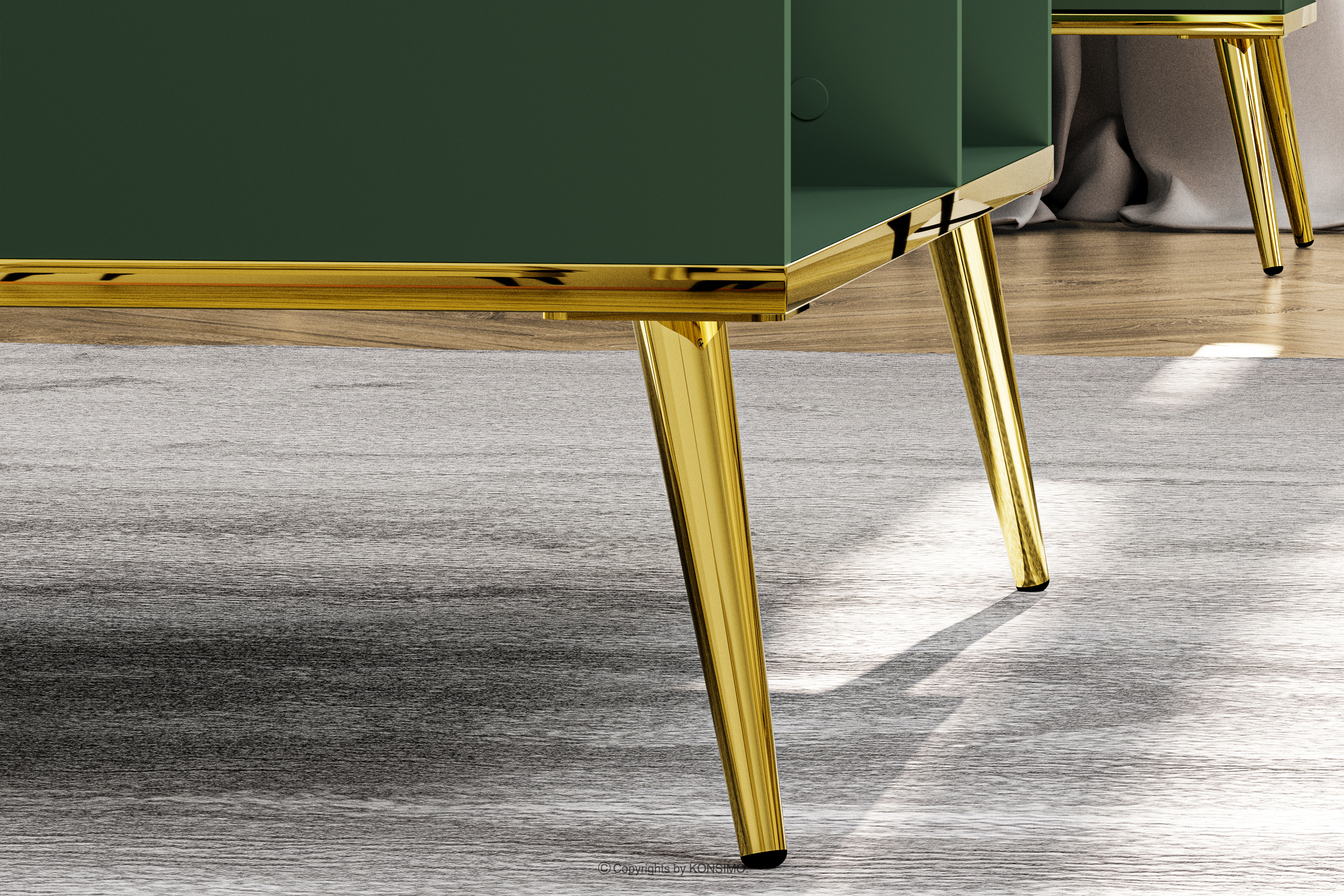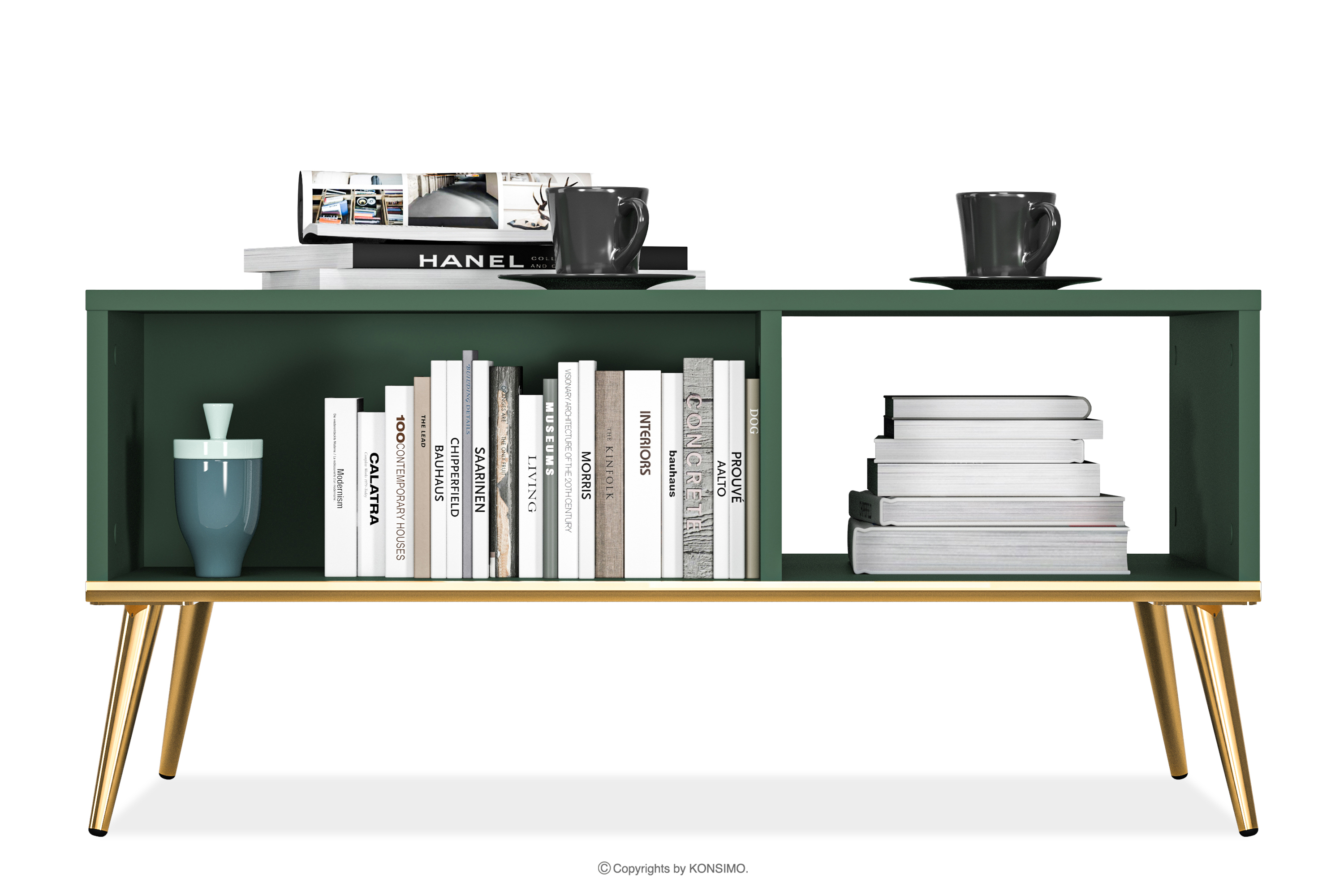 Der grüne Couchtisch auf hohen goldenen Beinen bringt einen Hauch von Chic in Ihre Einrichtung. Der Korpus aus laminierter Platte bietet eine solide Grundlage für jeden Raum und ist sowohl für Liebhaber des eleganten Stils als auch der Robustheit geeignet. Die goldenen, konischen Beine und Griffe sind das Tüpfelchen auf dem i.