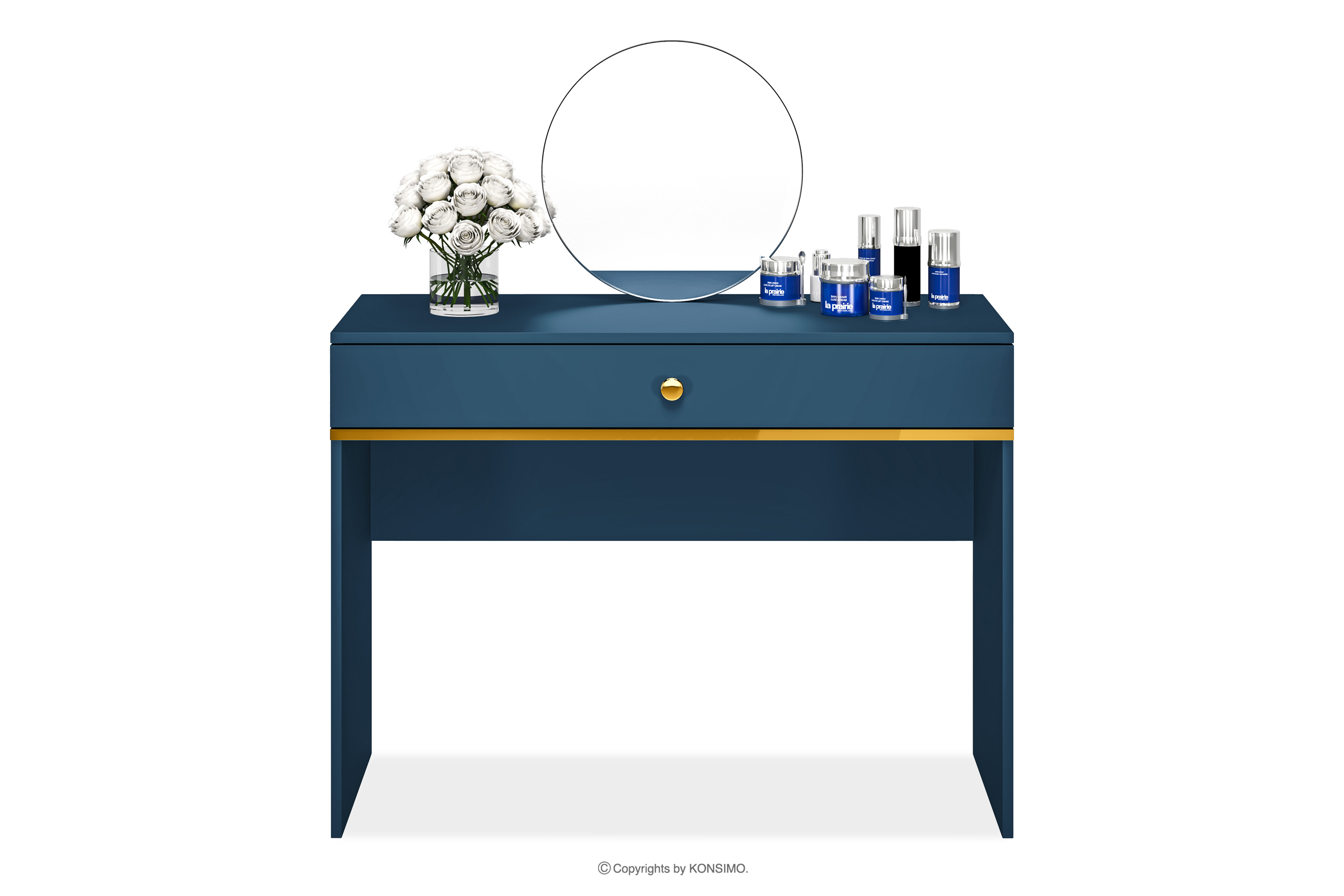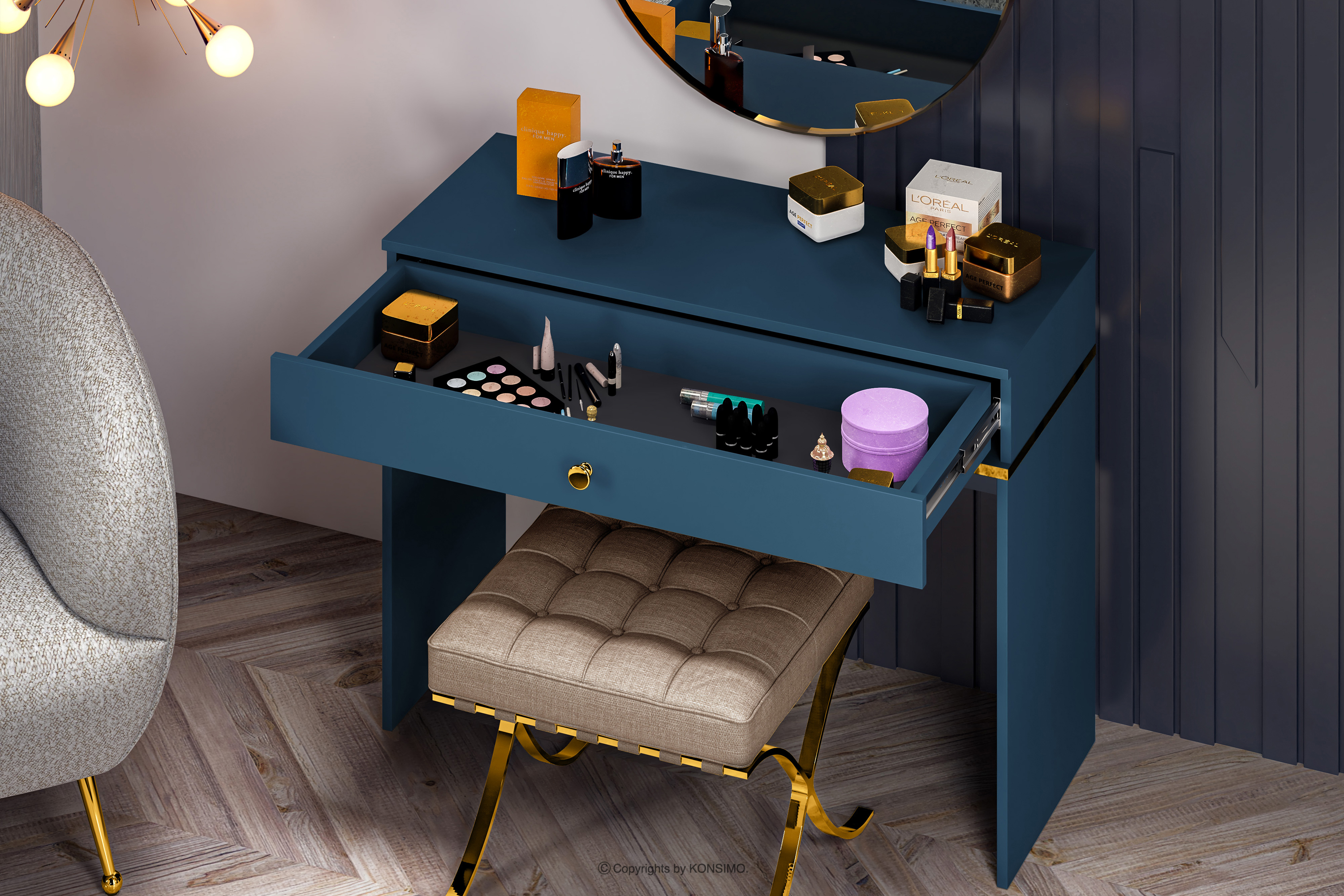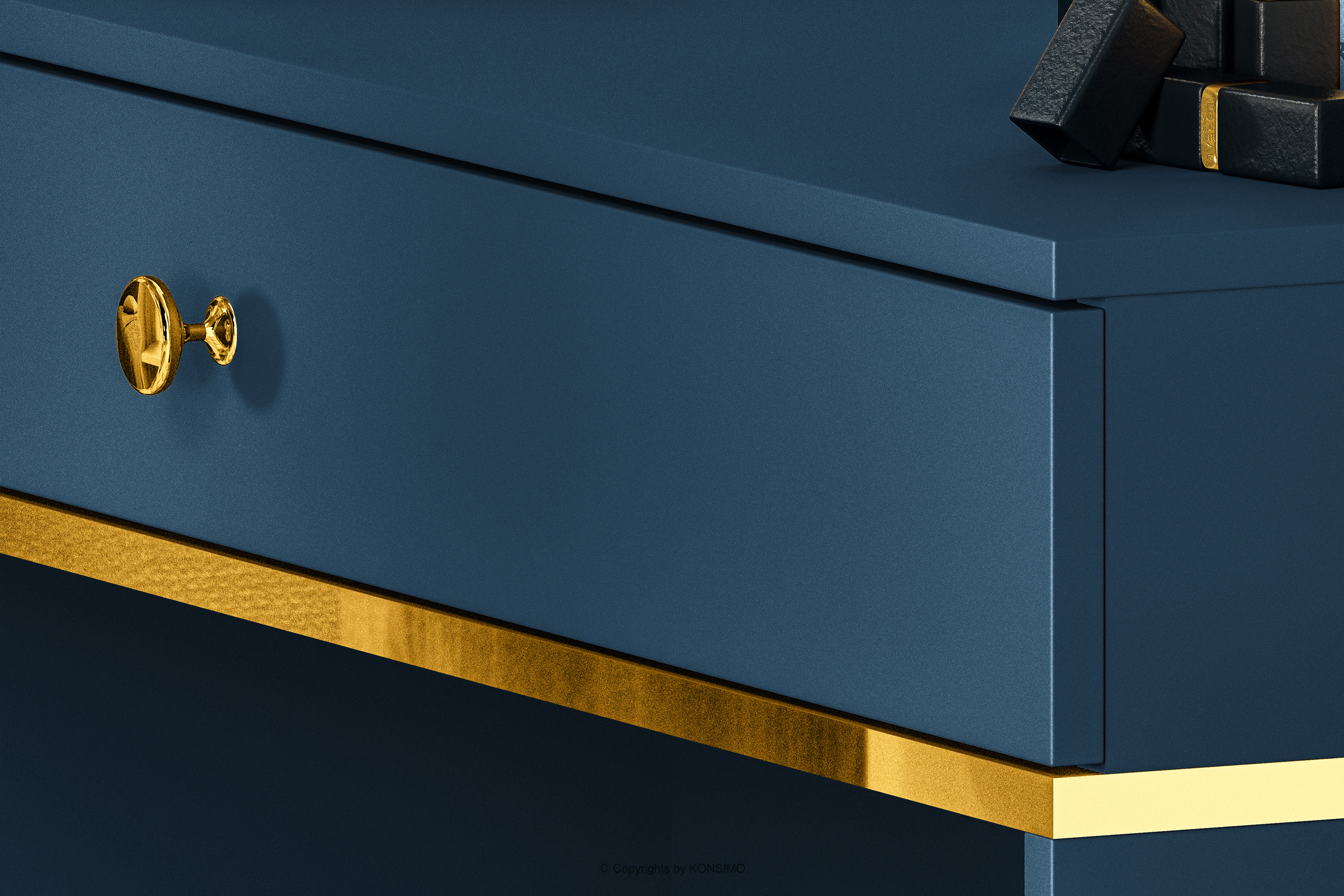 Der elegante navyblaue Schreibtisch mit Schublade bringt einen Hauch von Chic in Ihr Interieur. Der Korpus aus laminierter Platte wurde für Liebhaber des eleganten Stils und der Robustheit entworfen und bietet eine solide Grundlage für jeden Raum. Die goldfarbenen, konischen Beine und Griffe sind wie das Tüpfelchen auf dem i. Und das ist noch nicht alles!